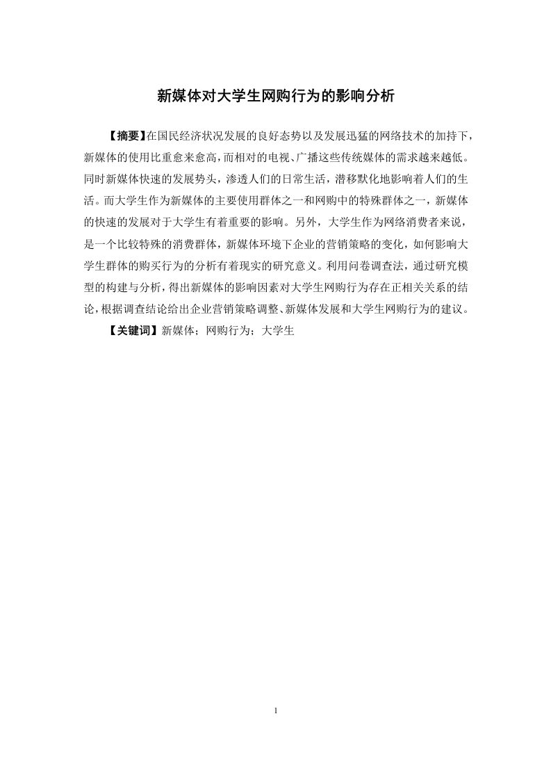 新媒体对大学生网购行为的影响分析【摘要】在国民经济状况发展的良好态势以及发展迅猛的网络技术的加持下,新媒体的使用比重愈来愈高,而相对的电视、广播这些传统媒体的需求越来越低。同时新媒体快速的发展势头,渗透人们的日常生活,潜移默化地影响着人们的生活。而大学生作为新媒体的主要使用群体之一和网购中的特殊群体之一,新媒体的快速的发展对于大学生有着重要的影响。另外,大学生作为网络消费者来说,是一个比较特殊的消费群体,新媒体环境下企业的营销策略的变化,如何影响大学生群体的购买行为的分析有着现实的研究意义。利用问卷调查法,通过研究模型的构建与分析,得出新媒体的影响因素对大学生网购行为存在正相关关系的结论,根据调查结论给出企业营销策略调整、新媒体发展和大学生网购行为的建议。【关键词】新媒体:网购行为:大学生Analysis on the influence of new media on college students'online shopping behavior[Abstract With the development of national economy and the rapiddevelopment of network technology,the use of new media is increasing,while thedemand of traditional media such as television and radio is decreasing.Meanwhile,the rapid development momentum of new media permeates People's Daily life andexerts a subtle influence on people's life.College students are one of the main groupsof new media and one of the special groups in online shopping.The rapiddevelopment of new media has an important impact on college students.In addition,as online consumers,college students are a relatively special consumer group.Theanalysis of how the changes in corporate marketing strategies in the new mediaenvironment affect the purchasing behavior of college students has practical researchsignificance.Using the questionnaire survey method,through the construction andanalysis of the research model,it is concluded that the influencing factors of newmedia have a positive correlation with the online shopping behavior of collegestudents.I keywords I New media;Online shopping behavior;College students'2目录11.1研究背景…1.2研究目的和意义…41.3研究内容1.4.1文献研究法..1.4.2问卷调查法....1.5研究创新之处…52模型建立和研究假设..62.1建立模型的依据.2.1.3新媒体对大学生网购行为的影响因素2.2建立模型82.3本文提出如下假设.83.1问卷设计与数据收集…93.2各影响因素变量与新媒体影响力的相关分析3.3回归分析…104研究结论与建议..124.1研究结论…124.2研究建议.124.2.1企业营销策略建议..124.2.2新媒体行业的建议144.2.3大学生消费的建议...