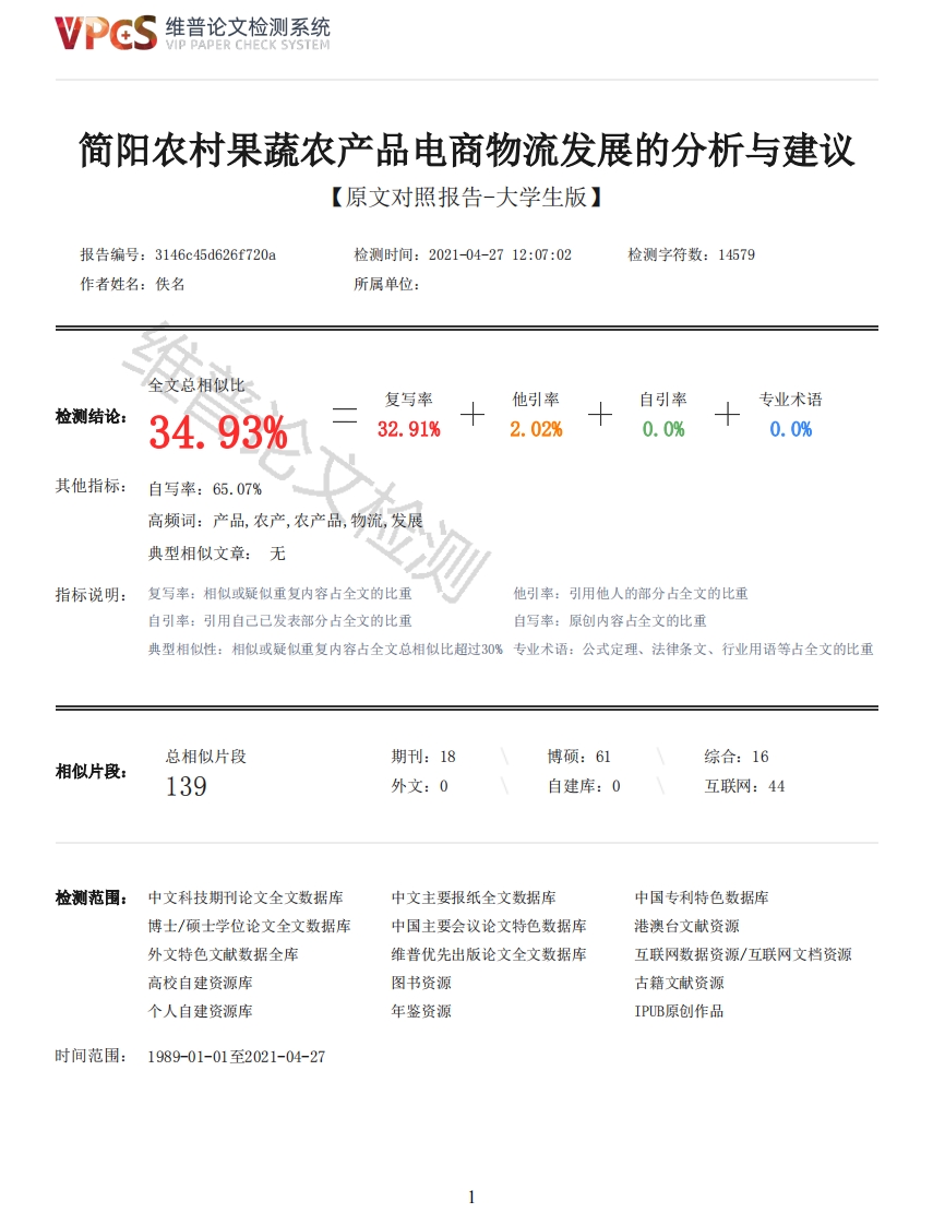 维普论文检测系统/IP PAPER CHECK SYSTEM简阳农村果蔬农产品电商物流发展的分析与建议【原文对照报告-大学生版】报告编号:3146c45d626f720a检测时间:2021-04-2712:07:02检测字符数:14579作者姓名:佚名所属单位:全文总相似比复写率他引率自引率专业术语检测结论:34.93%32.91%2.02%0.0%0.0%其他指标:自写率:65.07%高频词:产品,农产,农产品,物流,发展典型相似文章:无指标说明:复写率:相似或疑似重复内容占全文的比重他引率:引用他人的部分占全文的比重自引率:引用自己已发表部分占全文的比重自写率:原创内容占全文的比重典型相似性:相似或疑似重复内容占全文总相似比超过30%专业术语:公式定理、法律条文、行业用语等占全文的比重总相似片段期刊:18博硕:61综合:16相似片段:139外文:0自建库:0互联网:44检测范围:中文科技期刊论文全文数据库中文主要报纸全文数据库中国专利特色数据库博士/硕士学位论文全文数据库中国主要会议论文特色数据库港澳台文献资源外文特色文献数据全库维普优先出版论文全文数据库互联网数据资源/互联网文档资源高校自建资源库图书资源古籍文献资源个人自建资源库年鉴资源IPUB原创作品时间范围:1989-01-01至2021-04-27维普论文检测系统VIP PAPER CHECK SYSTEM原文对照颜色标注说明:■自写片段■复写片段(相似或疑似重复)口引用片段(引用)■专业术语(公式定理、法律条文、行业用语等)简阳农村果蔬农产品电商物流发展的分析与建议学生:王南婷指导老师:朱娜摘要:随着物流产业的高速发展和完善,电商也逐渐影响着人民的生活。对于振兴乡村,农村物流及电商体系的建设与完善在农村的发展与规划中占有重要作用。在东进战略开展的当下,当地政府决定推广强化简阳晚白桃、简阳草莓、桑葚、核桃等农产品品牌。同时随着互联网的发展,正在重点推行农村电子商务项目,不断建立和完善结合了县、乡、村三级电子商务运营的服务网络,订单直销、连锁配送业务通过电商平台来开展,进一步提高农业农产品的附加值,实现“线上农业”和“线下农业”双线互补发展是增加人民收入的有效方式。在此背景下,本文通过文献法和实地调查法描述简阳农产品电商发展现状,其次,对当地农产品电商物流的发展进行SWOT分析,指出其发展存在的一系列问题,最后针对问题提出优化策略。关键词:农产品:农村电商:农村物流Analysis and Suggestions on the Development of E-commerce Logistics of Rural Fruits,Vegetablesand Agricultural Products in JianyangUndergraduate:Wang NantingSupervisor:Zhu NaAbstract:With the rapid advancement of logistics industry,e-commerce has gradually affectedpeople's life.For the revitalization of rural areas,the construction and improvement of rurallogistics and e-commerce system plays an important role in rural development and planning.Atpresent,the local government decided to promote and strengthen Jianyang late white peach,Jianyangstrawberry,mulberry,walnut and other agricultural products brands.At the same time,with thedevelopment of the Internet,we are focusing on the implementation of rural e-commerce projects,constantly establishing and improving the service network combining the county,township and villagee-commerce operations.The direct order sales and chain distribution business are carried outthrough the e-commerce platform to further improve the added value of agricultural products,Realizing the complementary development of "online agriculture"and "offline agriculture"is aneffective way to increase people's income.In this context,this paper describes the developmentstatus of Jianyang agricultural products e-commerce through literature and field survey.Secondly,it makes SWOT analysis on the development of local agricultural products e-commerce logistics,points out a series of problems in its development,and finally puts forward optimization strategies.Key words:Agricultural Products;Rural E-commerce System;Rural Logistics.目录一、引言1(一)研究背景12维普论文检测系统VIP PAPER CHECK SYSTEM(二)研究意义1(三)国内外研究现状简述2二、农产品电子商务物流相关概念界定3(一)农产品电子商务相关概述31.农产品电子商务32.农村物流及农产品物流概念3三、简阳果蔬农产品电商物流发展现状4(一)简阳市基本概况4(二)简阳电商物流发展现状5四、以SW0T分析简阳市果蔬农产品电商物流发展5(一)优势分析5(二)劣势分析6五、简阳市果蔬浓产品电商物流发展存在的问题7(一)物流基础设施不完善7(二)未形成自身特有的品牌7(三)缺乏专业的电商人才8(四)农产品加工水平不足,配送效率低8六、简阳市果蔬浓产品电商物流发展措施8(一)优化物流基础设施81.发展第三方物流82.提高冷链运输在物流中的使用9(二)农产品方面要加强品牌化建设91.农产品生产销售标准化92.坚持农产品信息化、特色化推广9(三)加大优秀电子商务人才的引进力度101.高校支持、政府鼓励102.企业自身优化物流人员梯队10(四)有效利用当地物流资源10致谢13一、引言(一)研究背景随着科技与经济的并行发展,互联网的使用也日益普及,再加上我国物流体系的不断完善,电子商务在现代生活上已经变得不可或缺,在如今全民助力脱贫攻坚的大环境下,它具有相当大的作用。在如今互联网串联千家万户的背景下,农产品在网上交易亦是不足为奇,各种地方农产品具备了逾越时空的限制,进入各地市场,这为我国改革与发展的一剂强心针注入了农村社会经济中。正如我们所了解到的,物流体系越完善,电子商务运营的诸多成本也会陆续降