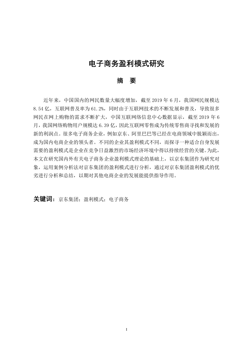 电子商务盈利模式研究摘要近年来,中国国内的网民数量大幅度增加,截至2019年6月,我国网民规模达8.54亿,互联网普及率为61.2%,同时由于互联网技术的不断发展和普及,导致很多网民在网上购物的需求不断扩大,中国互联网络信息中心数据显示,截至2019年6月,我国网络购物用户规模达6.39亿,因此互联网零售成为传统零售商寻找和发展的新的利润点。很多电子商务企业,例如京东、阿里巴巴等已经在电商领域中脱颖而出,成为国内电商企业的领头者。不同的企业其盈利模式不同,而探寻一种适合自身发展需要的盈利模式是企业在竞争日益激烈的市场经济环境中得以持续经营的关键。为此,本文在研究国内外有关电子商务企业盈利模式理论的基础上,以京东集团作为研究对象,运用案例分析法对京东集团的盈利模式进行分析,通过对京东集团盈利模式的优劣进行分析和总结,以期对其他电商企业的发展能提供指导作用。关键词:京东集团:盈利模式:电子商务Research Based on Business Model of Electronic CommerceAbstractIn recent years,the amount of netizen have increased substantially in China,and the internettechnology have developed and spreaded continuously,which cause the demend of online shopping haveenlarged Therefore,Internet retail has become a new profit point for traditional retailers to seek anddevelop.Many e-commerce enterprises,for example,jd group and alibaba have stood out in the field ofe-commerce,become the leader of domestic e-commerce enterprises.Different companies have differentprofit models,and seeking a profit model that in their own is the key of a company which want to goingconcern in the market economic environment.Therefore,this paper researchs base on business model ofelectronic commerce,according to jingdong group's goodness and position ,reaching the analysis to helpother companies to develop.Key words:Jd group;Profit model;The electronic commerce目录II(一)研究背景与意义…1(二)研究内容与方法12二、文献综述2(一)国内外研究现状21.国外研究现状...234(二)盈利模式概述.4(三)相关理论…55552.京东集团发展理念.…4京东集团用户规模.…6(二)京东集团盈利模式分析…71.京东集团盈利模式分析一一基于五要素·72.京东集团盈利模式的优劣势分析一一基于SW0T分析法12(二)提升企业综合能力,不断扩大发展.·121.提升产品质量,提升公司形象.…122.提升工作人员综合素质,提高客户满意度.…·131313