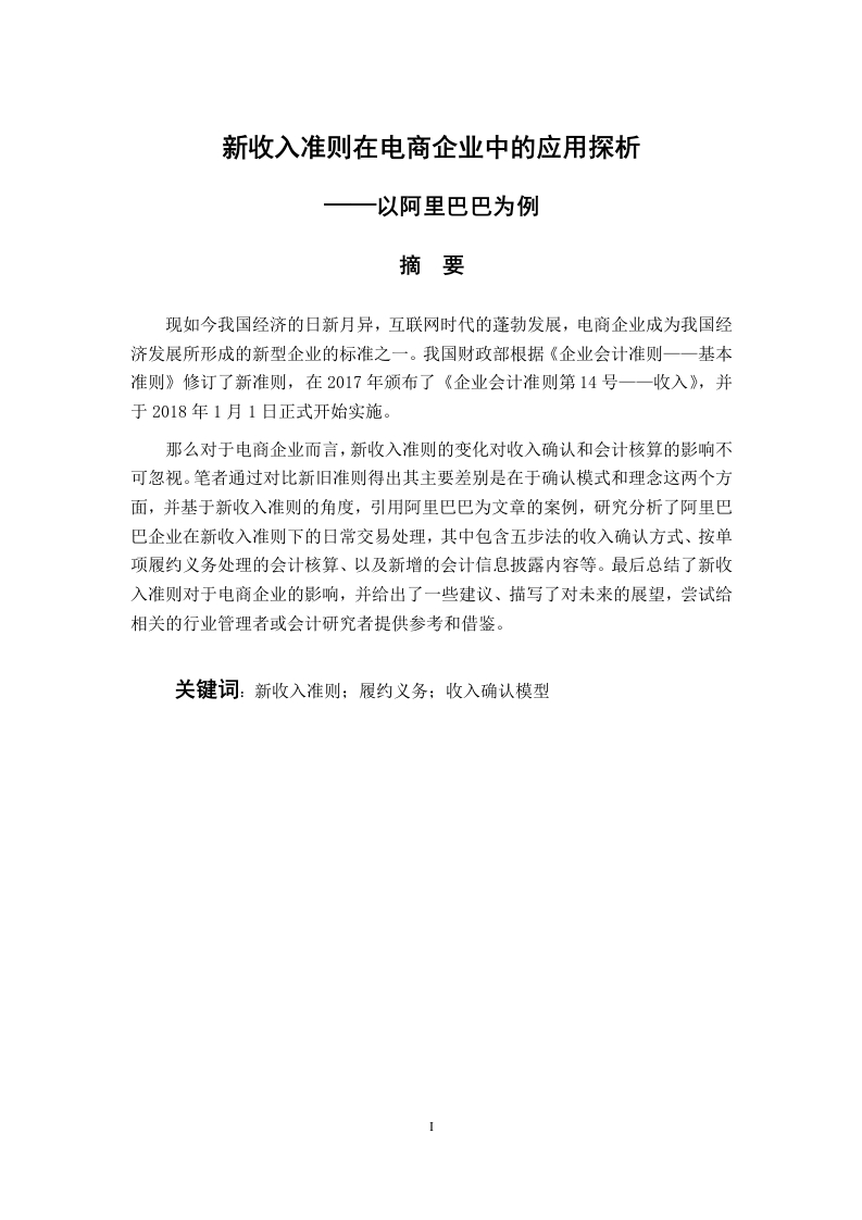 新收入准则在电商企业中的应用探析以阿里巴巴为例摘要现如今我国经济的日新月异,互联网时代的蓬勃发展,电商企业成为我国经济发展所形成的新型企业的标准之一。我国财政部根据《企业会计准则一一基本准则》修订了新准则,在2017年颁布了《企业会计准则第14号一一收入》,并于2018年1月1日正式开始实施。那么对于电商企业而言,新收入准则的变化对收入确认和会计核算的影响不可忽视。笔者通过对比新旧准则得出其主要差别是在于确认模式和理念这两个方面,并基于新收入准则的角度,引用阿里巴巴为文章的案例,研究分析了阿里巴巴企业在新收入准则下的日常交易处理,其中包含五步法的收入确认方式、按单项履约义务处理的会计核算、以及新增的会计信息披露内容等。最后总结了新收入准则对于电商企业的影响,并给出了一些建议、描写了对未来的展望,尝试给相关的行业管理者或会计研究者提供参考和借鉴。关键词:新收入准则:履约义务:收入确认模型Analysis on The Application of The New Income Standard inE-commerce EnterprisesAbstractNowadays,with the rapid development of China's economy and the vigorous development ofthe Internet era,e-commerce enterprises have become one of the standards of new enterprisesformed by China's economic development.China's Ministry of Finance revised the new standardsin accordance with the accounting standards for business enterprises-basic standards,and issuedthe accounting standards for Business Enterprises No.14-income in 2017,which was officiallyimplemented on January 1,2018.So for e-commerce enterprises,the impact of the change of new revenue standard on revenuerecognition and accounting can not be ignored.By comparing the new and old standards,theauthor concludes that the main difference lies in two aspects:recognition mode and concept.Based on the perspective of the new income standards,the author uses Alibaba as an example tostudy and analyze the daily transaction processing of Alibaba enterprises under the new incomestandards,which includes five steps of revenue recognition,accounting by single performanceobligation,and New accounting information disclosure content,etc.Finally,it summarizes theimpact of the new income standard on e-commerce enterprises,gives some suggestions,describesthe future prospects,and tries to provide reference for relevant industry managers or accountingresearchers.Key words:new revenue standard;Performance obligation;revenue recognition model目录Abstract....................................................................II(一)研究背景、目的和意义11.研究背景12.研究目的13.研究意义1(二)研究方法和途径2(三)文献综述222.国外文献综述二、新收入准则概述3(一)新收入准则的实施背景42.从会计核算方面看4(二)新收入准则的内涵1.收入确认…2.收入计量.53.特定交易的会计处理…54.信息披露5(四)新旧收入准则的差异比较。61.收入确认模型不同…62.收入确认时点不同.。73.对特定交易事项的规定不同..。84对信息披露的规定不同8三、案例分析一一以阿里巴巴为例·9(三)新旧收入准则下收入确认时间的判定标准10(四)新旧收入准则下会计核算上的区别。10(五)新旧收入准则下的财务报表与信息披露..。11四、新收入准则为电商企业交易带来的影响,12(一)对收入确认方式的影响.12(二)对会计核算的影响.12(三)对企业财务报表的影响..12五、结论…13(一)研究结论13(二)意见及建议.13(三)研究展望…13参考文献…14致谢15
