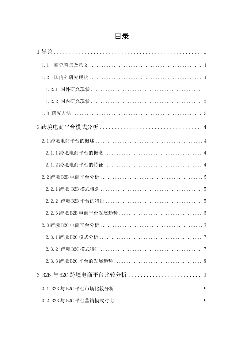 目录1.2.1国外研究现状....1.2.2国内研究现状....232跨境电商平台模式分析........42.1跨境电商平台的概述...2.1.1跨境电商平台的概念...42.1.2跨境电商平台的特征..42.2跨境B2B电商平台分析....2.2.1跨境B2B模式概念..2.2.2跨境B2B平台的特征....2.2.3跨境B2B电商平台发展趋势62.3跨境B2C电商平台分析....2.3.1跨境B2C模式分析....2.3.2跨境B2C模式特征...73B2B与B2C跨境电商平台比较分析.··93.1B2B与B2C平台市场比较分析....3.2B2B与B2C平台营销模式对比..3.3B2B与B2C平台交易模式对比.111341敦煌网与亚马逊平台市场比较分析.…134.2敦煌网与亚马逊平台营销模式对比分析.·134.4敦煌网与亚马逊平台物流模式对比分析.…14165.1B2B跨境电商平台发展建议.·165.1.1加强法制监管......165.1.2提升品牌信誉.....165.1.3提升信息化管理.....175.1.4完善基础设施建设...175.2B2C跨境电商平台发展建议..17175.2.2加强网络信息监管与保护.185.2.3提高平台的支付安全系数.185.2.4完善平台的物流体系..185.2.5加强知识产权监管力度.1920参考文献…致谢…22B2B与B2C跨境电商平台的差异分析陈雅彬摘要:全球经济增长速度逐渐放缓,我国跨境电商逆流而上紧随“互联网+”的持续发展空前繁盛,有望成为大背景下新的经济增长优势。在政府政策的不断激励下,跨境电商行业发展逐渐成熟并迈向新的发展阶段。本文选取B2B与B2C两大模式跨境电商平台为研究对象,以两种不同模式下跨境电商平台的差异性为基础,通过对两大平台特征、各组成要素模式与案例说明等进行系统的对比分析,对两大模式跨境电商平台进行更深一步的探讨,针对性指出两大模式跨境电商平台发展现状与未来展望,为我国跨境电商平台持续健康发展提供具有参考价值的建议。关键词:跨境电商:商业模式:B2C模式:B2B模式:创新;产业链分析Analysis of the differences between B2B andB2C cross-border e-commerce platformsByChen yabinMarch,2020Abstract:The global economic growth rate gradually slows down,China'scross-border e-commerce upstream with the "internet +"continued to developunprecedented prosperity,is expected to become a new economic growth advantagein the context.Under the continuous encouragement of government policy,thecross-border e-commerce industry gradually matures and moves to a new stage ofdevelopment.In this paper,the B2B and B2C cross-border e-commerce platforms arechosen as the research objects,based on the differences of the two cross-border