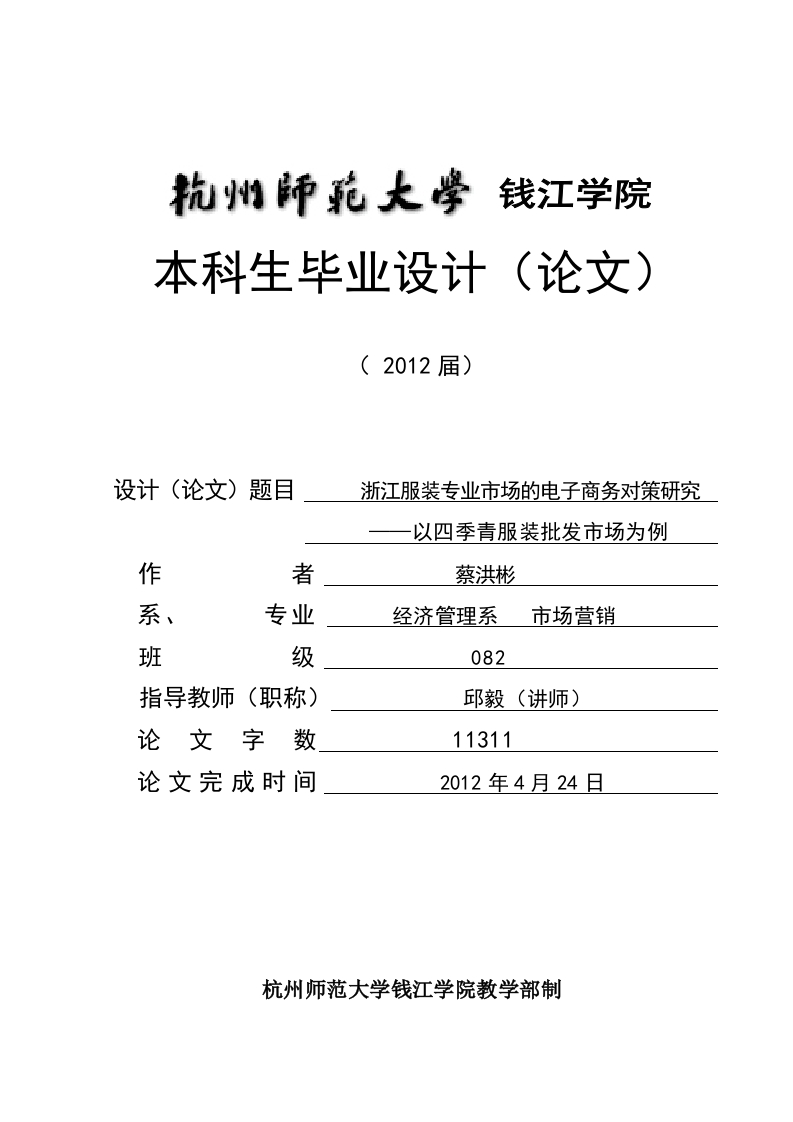 钱江学院本科生毕业设计(论文)(2012届)设计(论文)题目浙江服装专业市场的电子商务对策研究以四季青服装批发市场为例作者蔡洪彬系、专业经济管理系市场营销班级082指导教师(职称)邱毅(讲师)论文字数11311论文完成时间2012年4月24日杭州师范大学钱江学院教学部制浙江服装专业市场的电子商务对策研究一以四季青服装批发市场为例市场营销专业081班蔡洪彬0指导教师邱毅摘要:电子商务是一种全新的商业运营模式,作为有超时空性的商业模式,由于网络界域的虚拟化,电子商务具备易进入性、创新性、易变性、高成长性等特点,它不仅带来了企业经营环境的改变,同时也改变企业经营的规则。在新一轮的互联网浪潮到来之际,企业既要应用数字化电子方式开展商务活动,赶上电子商务的大潮,又需要从有效的电子商务组织战略、体系及实施方案等层面上下功夫,以确立自己的竞争优势。新江是我国重要的服装产业基地,拥有华东地区最密集的服装专业批发市场。在新的经济形式下,正面临着一系列的市场冲击与挑战。随着中国日益成为全球采购中心,互联网技术的创新,电子商务的迅猛发展以及银行业结算制度的变苹,都成为配合纺织服装专业市场进行新一轮改造升级的推动因素,服装专业市场在注重市场定位细分和品牌经营管理的同时,更应该抓住机会大力发展电子商务和整合物流发展,从而保证服装专业市场的持续繁荣与和谐发展。因此,本文主要研究电子商务在服装专业市场的发展问题。本文以定性分析与定量分析相结合的方法,以杭州四季青服装批发市场为实际案例,对浙江服装市场电子商务的发展现状进行分析,结合相关理论从四个方面对浙江服装批发市场电子商务存在的问题进行分析,并针对问题提出相应的解决方案,让电子商务为浙江服装批发市场带来更多的竞争机遇和领先地位。关键词:浙江;四季青,服装专业市场:电子商务Research of the Countermeasures of the Electronic Commerce ofZhejiang Clothing Profession Marketing-In Sijiqing ClothingWholesale Market for ExampleMarketing class Cai Hongbin Instructor:Qiu YiAbstract:E-commerce is a kind of new business operation mode,as have the business model of dejavu,because network virtualization of boundaries,the electronic commerce have easy accessibility,innovation,volatility,high growth characteristics,it not only bring enterprise operation environmentchange,and change enterprise management rules.In the new round of the occasion of the arrival of theInternet wave,the enterprise should not only applied digital electronic means business activities and catchup with the tide of electronic commerce,and the need to electronic commerce from the valid organization①蔡洪彬,男,浙江杭州人,杭州师范大学钱江学院市场营销082班学生strategy,system and implement plan level fluctuation kongfu,to establish their competitive advantage.Zhejiang is China's important clothing industry base,with the east China area most densely populatedclothing professional wholesale market.In the new economic form,is facing a series of market impact andchallenges.With China increasingly become global sourcing center,the Internet technology innovation,therapid development of electronic commerce and banking settlement system changes,all become professionaltextile and garment market with a new round of the transformation and upgrade of push factor.Clothing inthe market in pay attention to market positioning segmentation and brand management at the same time,more should seize the opportunity to develop the electronic commerce and the integration of logisticsdevelopment,so as to ensure the continued prosperity of clothing in the market and harmoniousdevelopment.Therefore,this paper mainly studies the electronic commerce in clothing in the developmentof the market.Based on qualitative analysis and quantitative analysis in this paper,using the method ofhangzhou sijiqing clothing wholesale market for actual case,the zhejiang clothing market electroniccommerce development present situation to carry on the analysis,unifies the related theory from fouraspects to hangzhou sijiqing clothing wholesale market electronic commerce and the analysis of existingproblems,and then proposes corresponding solutions,let the electronic commerce for zhejiang clothingwholesale market with more competition opportunities and leading position.Key words:Zhejiang;Sijiqing:The electronic commerce;Clothing market;