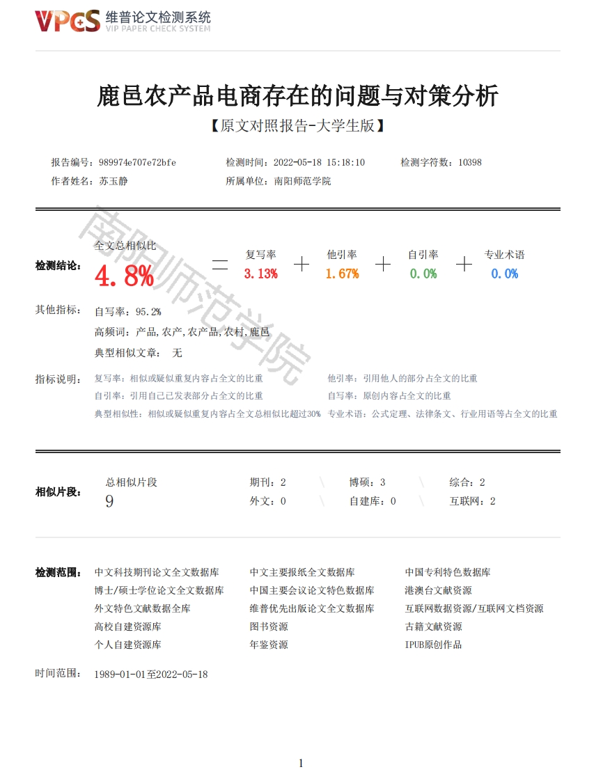 维普论文检测系统/IP PAPER CHECK SYSTEM鹿邑农产品电商存在的问题与对策分析【原文对照报告-大学生版】报告编号:989974e707e72bfe检测时间:202205-1815:18:10检测字符数:10398作者姓名:苏玉静所属单位:南阳师范学院全文总相似比复写率他引率自引率专业术语检测结论:4.8%3.13%1.67%0.0%0.0%其他指标:自写率:95.2%高频词:产品,农产,农产品,农村,鹿邑典型相似文章:无指标说明:复写率:相似或疑似重复内容占全文的比重他引率:引用他人的部分占全文的比重自引率:引用自己已发表部分占全文的比重自写率:原创内容占全文的比重典型相似性:相似或疑似重复内容占全文总相似比超过30%专业术语:公式定理、法律条文、行业用语等占全文的比重总相似片段期刊:2博硕:3综合:2相似片段:9外文:0自建库:0互联网:2检测范围:中文科技期刊论文全文数据库中文主要报纸全文数据库中国专利特色数据库博士/硕士学位论文全文数据库中国主要会议论文特色数据库港澳台文献资源外文特色文献数据全库维普优先出版论文全文数据库互联网数据资源/互联网文档资源高校自建资源库图书资源古籍文献资源个人自建资源库年鉴资源IPUB原创作品时间范围:1989-01-01至2022-05-18维普论文检测系统VIP PAPER CHECK SYSTEM原文对照颜色标注说明:■自写片段■复写片段(相似或疑似重复)口引用片段(引用)■专业术语(公式定理、法律条文、行业用语等)编号:20600421016南阳师范学院2022届毕业生毕业论文(设计)完成人:苏玉静班级:2020-25学制:2年专业:工商管理学院题目:鹿邑农产品电商存在的问题与对策分析指导教师:陈奕儒完成日期:2022-04-18目录摘要(1)一、农产品电商的特征与意义(1)(一)我国农村电子商务的特征有(2)1.电子商务将传统的商务流程电子化和数字化(2)2.农业网络基础设施缺乏区域性谋略化(2)3.农产品需求的不可预知性(2)(二)农产品开展电子商务的意义(2)1.改变农村生产经营模式(3)2.有利于提高农村地区人民的生活质量(3)3.有利于增加农产品的销售机会(3)二、鹿邑县农产品电商发展现状(4)(一)鹿邑县农产品电子商务概况(4)(二)鹿邑县发展特色农产品的优势与劣势分析(4)1.优势分析(5)2.劣势分析(6)三、鹿邑县农产品电商发展中存在的问题(7)(一)居民电商意识薄弱和缺乏专业人才(7)(二)网络信息化基础设施不完备(7)(三)农村电商专业化低且规模小(8)(四)农产品缺乏高品牌化和标准化(8)(五)农村物流配套设施不完善(9)四、鹿邑县农产品电商存在问题的对策分析(9)2维普论文检测系统VIP PAPER CHECK SYSTEM(一)加强宣传农民对电子商务认识并培养专业人才(9)(二)加大网络基地的建设和提高农村网络问题(9)(三)完善农产品的规模化和专业化(10)(四)提高农产品的品牌化和标准化(10)(五)完善农村农产品的物流链(11)五、结束语(11)参考文献(11)Abstract:(12)鹿邑县农产品电商存在的问题与对策分析作者:苏玉静指导教师:陈奕儒摘要:随着社会进步和发展,在互联网行业的兴起和普及下,电子商务的出现使农产品得到了很大的改变,随之不仅影响着人们的生活和交流方式,也带动了农村电商的飞速发展,使农村的就业机会不断地增加,从而促进农村人才的回流。发展农村农产品电商行业不但能带动农村产业的快速发展,而且还可以促进农村信息产业和物流服务业的扩大和完善,打破过去的传统线下生产和营销模式,从而转变成新兴的线上电商营销模式。发展农村农产品电商是促进农村和城市一体化的桥梁。本文通过文献调查法,通过查找相关的文献和数据统计分析对我国鹿邑县农村农产品电商的发展进行梳理,确定了农村农产品的发展现状和存在的问题。关键词:农产品:电子商务:营销模式:解决措施我国是农产业大国,农业的发展影响到我国的经济发展,所以农产业的发展对我国有着至关重要的意义。随着互联网时代的到来,全国都在借助互联网之趋势发展新型的农产品,为农产品的发展创造前所未有的机遇。也对农民的收入起到了非常好的积极作用,有效的推动农产业的转型和升级。但由于农民对电商专业知识十分匮乏,物流基础设备缺乏,农产品没有统一的品牌化等导致农产品的发展比较缓慢,使之止步不前.接下来我们对电商对鹿邑农产品的营销模式存在的问题进行分析和探究.一、农产品电商的特征与意义电子商务简称EC。其中包含两方面,一是电子信息方式,二是贸易交易活动。一般来说是指借助互联网作为基础的电子手段而展开的一系列网络营销的方式,通过网络使产品的销售模式从线下走到线上呈现到大众的视线,鹿邑县的农产品电商就是依托这个网络营销方式的,使更多的人认识到鹿邑的农产品,从而也提高了鹿邑的农民经济收入状况。同时,这也是一种能使鹿邑农产品走向大众走向各家各户的机会,也弘扬了鹿邑的老子文化。(一)我国农村电子商务的特征有1.电子商务将传统的商务流程电子化和数字化农村开展电子商务就是模式的转换,把传统的线下的营销模式通过电子商务借助互联网变成现在的线上模式。此模式打破了传统的线下的固定地点固定方式售卖的模式,降低了成本,从而大大提高了效率[8]。2.农业网络基础设施缺乏区域性谋略化农村网络设施比较严重的匮乏,网络不好,信号不好,严重影响到了互联网平台下电子商务的开展,不仅硬件缺乏,软件也较为缺乏,使得农民不能通过直接有效的途径参与到电子