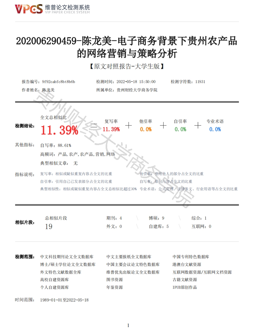 维普论文检测系统VIP PAPER CHECK SYSTEM202006290459-陈龙美-电子商务背景下贵州农产品的网络营销与策略分析【原文对照报告-大学生版】报告编号:9f92 cabfc8bt8b6b检测时间:2022-05-1815:50:00检测字符数:11931作者姓名:陈龙美所属单位:贵州财经大学商务学院全文总相似比复写率他引率自引率专业术语检测结论:11.39%11.39%0.0%0.0%0.0%其他指标:自写率:88.61%高频词:产品,农产,农产品,营销,网典型相似文章:无指标说明:复写率:相似或疑似重复内容占全文的比重他引率:引用他人的部分占全文的比重自引率:引用自己已发表部分占全文的比重自写率:原创内容占全文的比重典型相似性:相似或疑似重复内容占全文总相似比超过30%专业术语:公式定理、法律条文、行业用语等占全文的比重总相似片段期刊:4博硕:9综合:1相似片段:19外文:0自建库:5互联网:0检测范围:中文科技期刊论文全文数据库中文主要报纸全文数据库中国专利特色数据库博士/硕士学位论文全文数据库中国主要会议论文特色数据库港澳台文献资源外文特色文献数据全库维普优先出版论文全文数据库互联网数据资源/互联网文档资源高校自建资源库图书资源古籍文献资源个人自建资源库年鉴资源IPUB原创作品时间范围:1989-01-01至2022-05-18维普论文检测系统VIP PAPER CHECK SYSTEM原文对照颜色标注说明:■自写片段■复写片段(相似或疑似重复)口引用片段(引用)■专业术语(公式定理、法律条文、行业用语等)本科毕业论文题目系计算机科学系届别2022届学商务学院电子商务背景下贵州农产品的网络营销与策略分析专业电子商务班级电商2004班(升)学生姓名陈龙美学号202006290459指导教师严佳娣职称助教完成时间年月日原创性声明本人郑重声明:本人所呈交的毕业论文(设计),是在指导老师的指导下独立进行研究所取得的成果。毕业论文(设计)中凡引用他人已经发表或未发表的成果、数据、观点等,均已明确注明出处。除文中已经注明引用的内容外,不包含任何其他个人或集体已经发表或撰写过的科研成果。对本文的研究成果做出重要贡献的个人和集体,均已在文中以明确方式标明。本声明的法律责任由本人承担。论文作者签名:日期:关于使用授权的声明本人在指导老师指导下所完成的毕业论文(设计)及相关的资料(包括图纸、试验记录、原始数据、实物照片、图片、录音带、设计手稿等),知识产权归属贵州财经大学商务学院。本人完全了解*学院有关保存、使用毕业论文(设计)的规定,本人授权贵州财经大学商务学院可以将本毕业论文(设计)的全部或部分内容编入有关数据库进行检索,可以采用任何复制手段保存和汇编本毕业论文(设计)。如果发表相关成果,一定征得指导教师同意,且第一署名单位为贵州财经大学商务学院。本人离校后使用毕业论文(设计)或与该论文直接相关的学术论文2维普论文检测系统VIP PAPER CHECK SYSTEM或成果时,第一署名单位仍然为贵州财经大学商务学院。论文作者签名:日期:指导教师签名:日期:电子商务背景下贵州农产品的网络营销与策略分析专业:电子商务学号:202006290459学生:陈龙美指导教师:严佳娣摘要:随着现代电子商务行业的蓬勃发展,它为各种网络商品之间跨行地域、跨界时间的限制所创造出了一个无限广阔的可能。也恰巧是电子商务行业的快速发展与高效便捷,使我们越来越多的生活用品已经实现了远距离的即时交易。电子商务产业在快速推动全国农产品电子商务贸易大市场大发展建设的进程同时,也确实面临着另外许多重大挑战,网络农产品营销服务方式的新出现为互联网农产品网络的高效销售方式开辟一种新的道路,打破了传统电子商务跨时间地域以及空间方面的限制,提高了产品的综合经济效益,但是目前在当前实际执行的传统农产品网络电子商务营销的工作程序中仍然存在一些细节问题进而严重的影响着了今后相关电子商务工作进程的开展。近年来,政府虽然也有先后多次出台给予支持和措施,但无论从政策还是财政资金上的支持,至今也仍然是收效甚微的。本文主要对目前电子商务环境背景下贵州省特色农产品网络营销推广策略等进行综合研究分析,并且综合分析当前贵州省的农产品在电子商务上营销的发展现状,从而逐步发现贵州省的特色农产品在网络营销存在的较大问题并进而依据国内实际营销情况分析提出相关营销的策略。关键词:电子商务:营销策略:特色农产品Network marketing and strategy analysis of Agricultural products in Guizhou under the backgroundof e-commerceMajor:E-commerce Student ID:202006290459Student:Chen Longmei Instructor:Yan JiadiAbstract:With the rapid development of modern e-commerce industry,it creates an infinite andbroad possibility for the limitation of cross-line region and cross-boundary time between variousonline commodities.It also happens to be the rapid development and efficiency and convenience of e-commerce industry,so that more and more of our daily necessities have realized long-distance real-time transactions.E-commerce industry in the rapid push national agricultural e-commerce trade bigmarket development and construction process at the same time,has faced many other majorchallenges,the network marketing of agricultural products to agricultural products on the Internetnetwork service mode of the new way of effective sales opened up a new road,breaking thetraditional regional e-commerce across time and space limitations,improve the product But atpresent,there are sti
