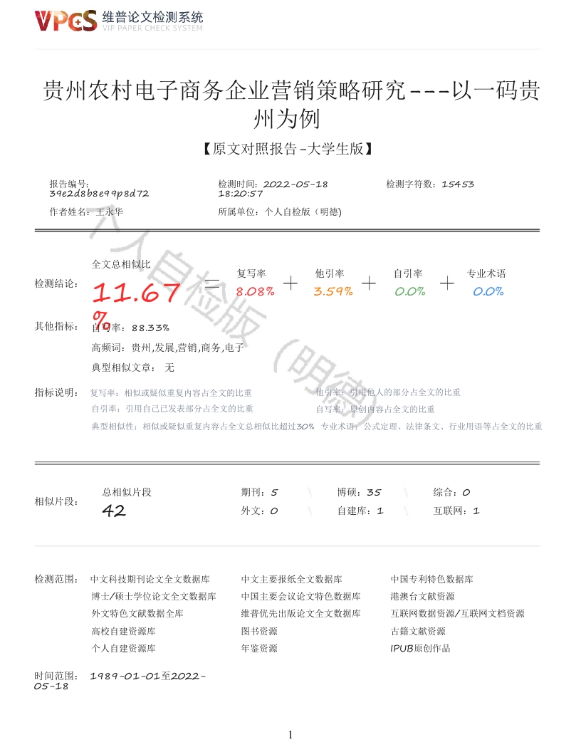 维普论文检测系统VIP PAPER CHECK SYSTEM贵州农村电子商务企业营销策略研究---以一码贵州为例【原文对照报告-大学生版】报告编号:检测时间:2022-05-18检测字符数:1545339e2d8b8e99p8d7218:20:57作者姓名:王永华所属单位:个人自检版(明德)全文总相似比复写率他引率自引率专业术语检测结论:11.6其他指标:.087%3.59%0.0%高频词:贵州,发展营销,商务,电子典型相似文章:无指标说明:复写率:相似或疑似重复内容占全文的比重他引率:引用他人的部分占全文的比重自引率:引用自己已发表部分占全文的比重自写率:原创内容占全文的比重典型相似性:相似或疑似重复内容占全文总相似比超过30%专业术语:公式定理、法律条文、行业用语等占全文的比重总相似片段期刊:5博硕:35相似片段:42自建库:1互联网:1检测范围:中文科技期刊论文全文数据库中文主要报纸全文数据库中因专利特色数据库博士/硕士学位论文全文数据库中国主要会议论文特色数据库港澳台文献资源外文特色文献数据全库维普优先出版论文全文数据库互联网数据资源/互联网文档资源高校自建资源库图书资源古籍文献资源个人自建资源库年鉴资源IPUB原创作品时间范围:1989-01-01至2022-05-181VPCS维普论文检测系统原文对照颜色标注说明:■自写片段■复写片段(相似或疑似重复)■引用片段(引用)■专业术语(公式定理、法律条文、行业用语等)Mingde College of Guizhou University本科毕业论文(设计)论文(设计)题目:贵州农村电子商务企业营销策略研究---以一码贵州为例院(系):经济管理系专业:市场营销班级:市场18O1学号:指导教师:唐嘉年月日贵州大学明德学院本科毕业论文(设计)诚信责任书。。本人郑重声明:本人所呈交的毕业论文(设计),是在导师的指导下独立进行研究所完成。毕业论文(设计)中凡引用他人己经发表或未发表的成果、数据、观点等,均己明确注明出处。特此声明。论文(设计)作者签名:日期:目录Abstract·21.绪论VIP PAPER CHECK SYSTEM1.1研究背景及意义31.2研究内容及方法·······1.2.1研究内容········1.2.2研究方法········2.概念、理论及市场现状····21概念界定…·········2.2.1 PEST论・・22.2SW0T分析···法22.34P理论····23市场现状···········3.一码贵州”营销现状分析3.1“一码贵州简介······3.2“一码贵州宏观环境分析3.22经济环境··········3.2.3社会文化环境····3.2.4技术环境·······103.2.5自然环境分析········11113.4基于TP理论的一码贵州”营销策略分析12123.4.2目标市场选择·········13144.“一码贵州营销策略存在的问题154.1“一码贵州产品发展问题153