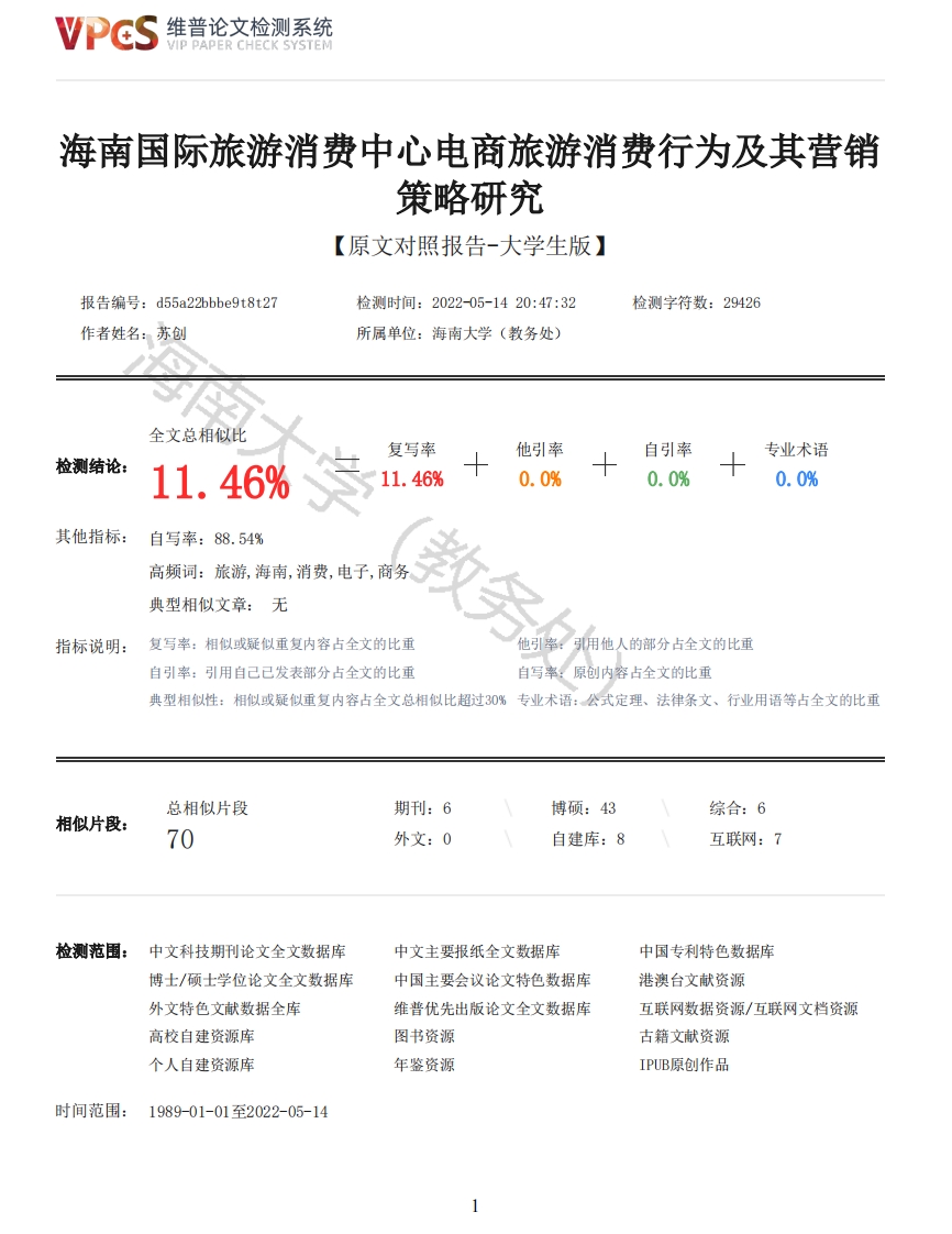 维普论文检测系统VIP PAPER CHECK SYSTEM海南国际旅游消费中心电商旅游消费行为及其营销策略研究【原文对照报告-大学生版】报告编号:d55a22bbbe9t8t27检测时间:2022-05-1420:47:32检测字符数:29426作者姓名:苏创所属单位:海南大学(教务处)全文总相似比复写率他引率自引率专业术语检测结论:11.46%11.46%0.0%0.0%0.0%其他指标:自写率:88.54%高频词:旅游,海南,消费,电子,商务典型相似文章:无指标说明:复写率:相似或疑似重复内容占全文的比重他引率:引用他人的部分占全文的比重自引率:引用自己已发表部分占全文的比重自写率:原创内容占全文的比重典型相似性:相似或疑似重复内容占全文总相似比超过0%专业术语:公式定理、法律条文、行业用语等占全文的比重总相似片段期刊:6博硕:43综合:6相似片段:70外文:0自建库:8互联网:7检测范围:中文科技期刊论文全文数据库中文主要报纸全文数据库中国专利特色数据库博士/硕士学位论文全文数据库中国主要会议论文特色数据库港澳台文献资源外文特色文献数据全库维普优先出版论文全文数据库互联网数据资源/互联网文档资源高校自建资源库图书资源古籍文献资源个人自建资源库年鉴资源IPUB原创作品时间范围:1989-01-01至2022-05-14维普论文检测系统VIP PAPER CHECK SYSTEM原文对照颜色标注说明:■自写片段■复写片段(相似或疑似重复)引用片段(引用)■专业术语(公式定理、法律条文、行业用语等)海南大学毕业论文(设计)大学题目:海南国际旅游消费中心电商旅游消费行为及其营销策略研究学号:20187411320101姓名:苏创年级:2018级学院:应用科技学院系别:行政管理与电子商务教务处)专业:电子商务指导教师:黄崇利教授完成日期:2022年5月13日摘要在海南建省三十周年之际,习主席提出了海南建设国际自由贸易港的政策,支持海南打造国际旅游消费中心,并制定了一系列具体方案,为海南旅游业指明了发展方向。在新的国家战略背景下,海南将大力发展以电子商务和旅游为核心的“旅游+”举措,积极探索旅游电子商务与其他行业融合创新的发展模式,积极利用旅游电子商务促进海南传统旅游业转型。同时随着国民收入增加,在满足自身物质生活水平之后,人们对于精神文化需求越来越高,因此,旅游电子商务会迎来新发展。近年来,海南省旅游电子商务呈现蓬勃发展态势。海南第三产业经济占比超过了60%,可见旅游产业对海南全省经济的重要性。本文以海南旅游电子商务为研究对象,通过对海南旅游电子商务发展现状及存在问题进行深入分析,并提出相应的营销策略,希望能够解决目前海南旅游电子商务发展中面临的困境。文章首先对国内外旅游电子商务研究现状进行了分析和梳理,得出国外旅游电子商务的发展速度快于国内,并且发现国外研究者的研究角度多样化,研究很有深度,值得借鉴经验。其次,对旅游电子商务和消费行为相关的概念梳理剖析。然后介绍了海南旅游电子商务的发展情况和存在的主要问题,并在此基础上总结出海南发展旅游电子商务的优势,为海南旅游电子商务的进一步发展提供依据。最后结合上述问题提出解决对策和建议,以指导海南旅游业的健康持续发展。再通过查阅相关理论基础,针对海南旅游电子商务发展中存在的问题以及旅游电子商务消费者的消费行为,综合给出适合海南旅游电子商务发展现状的7P营销策略,以期海南旅游业能够得到高质量的发展。关键词:海南:旅游:旅游电子商务:消费行为:营销策略:AbstractOn the occasion of the 30th anniversary of the founding of Hainan Province,President Xiproposed the policy of building Hainan into an international free trade port,supported Hainan to2维普论文检测系统VIP PAPER CHECK SYSTEMbuild itself into an international tourism consumption center,and formulated a series of specificplans,which pointed out the development direction for Hainan's tourism industry.In the context ofthe new national strategy,Hainan Province will vigorously develop the "tourism plus"initiativewith e-commerce and tourism as the core,actively explore the integrated and innovative developmentmode of tourism e-commerce and other industries,and actively utilize tourism e-commerce to promotethe transformation of traditional tourism in Hainan Province.At the same time,with the increase ofnational income,people's spiritual and cultural needs become higher and higher after meeting theirown material living standards.In recent years,tourism e-commerce in Hainan Province has beendeveloping vigorously.Hainan tertiary industry accounts for more than 60%of the economy,whichshows the importance of tourism industry to the economy of Hainan Province.In this paper,Hainantourism e-commerce as the object of study,through in-depth analysis of Hainan tourism e-commercedevelopment status and problems,and put forward corresponding marketing strategies,hoping to solvethe current difficulties in the development of Hainan tourism e-commerce.Firstly,this paper analyzes the research status of tourism e-commerce at home and abroad,andfinds that the development of foreign tourism e-commerce is faster than at home.Secondly,thetourism e-commerce and consumer behavior related concepts carding analysis.Then it introduces thedevelopment of Hainan's tourism e-commerce and the main problems,and summarizes the advantages ofHainan's development of tourism e-commerce on this basis.Finally,combined with the above problems,the paper puts forward countermeasures and suggestions to guide the healthy and sustainabledevelopment of Hainan tourism.Then through consulting the relevant theoretical basis,ai