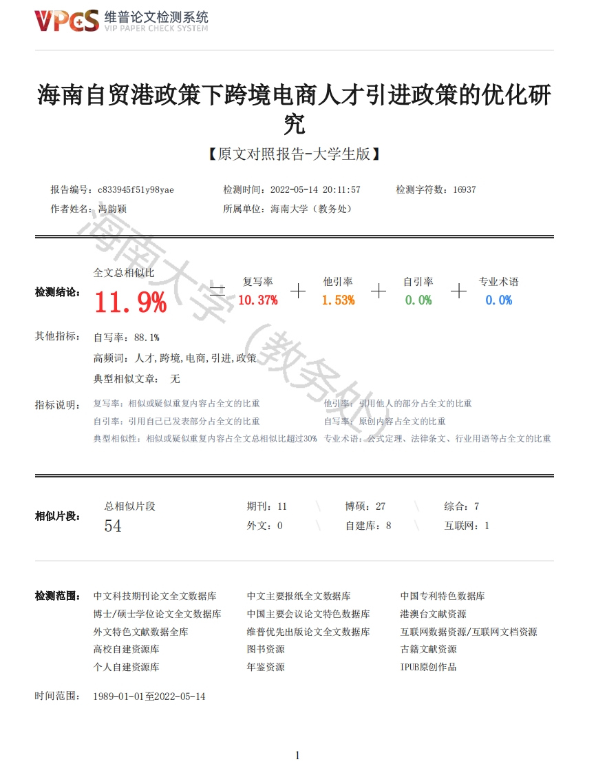维普论文检测系统/IP PAPER CHECK SYSTEM海南自贸港政策下跨境电商人才引进政策的优化研究【原文对照报告-大学生版】报告编号:c833945f51y98yae检测时间:2022-05-1420:11:57检测字符数:16937作者姓名:冯韵颖所属单位:海南大学(教务处)全文总相似比复写率他引率自引率专业术语检测结论:11.9%10.37%1.53%0.0%0.0%其他指标:自写率:88.1%高频词:人才,跨境,电商,引进,政策典型相似文章:无指标说明:复写率:相似或疑似重复内容占全文的比重他引率:引用他人的部分占全文的比重自引率:引用自己已发表部分占全文的比重自写率:原创内容占全文的比重典型相似性:相似或疑似重复内容占全文总相似比超过0%专业术语:公式定理、法律条文、行业用语等占全文的比重总相似片段期刊:11博硕:27综合:7相似片段:54外文:0自建库:8互联网:1检测范围:中文科技期刊论文全文数据库中文主要报纸全文数据库中国专利特色数据库博士/硕士学位论文全文数据库中国主要会议论文特色数据库港澳台文献资源外文特色文献数据全库维普优先出版论文全文数据库互联网数据资源/互联网文档资源高校自建资源库图书资源古籍文献资源个人自建资源库年鉴资源IPUB原创作品时间范围:1989-01-01至2022-05-14维普论文检测系统VIP PAPER CHECK SYSTEM原文对照颜色标注说明:■自写片段■复写片段(相似或疑似重复)引用片段(引用)■专业术语(公式定理、法律条文、行业用语等)海南大学毕业论文(设计)大学题目:海南自贸港政策下跨境电商人才引进政策的优化研究学号:20187406320008姓名:冯韵颖年级:18级学院:应用科技学院系别:电子商务与行政管理教务处)专业:行政管理指导教师:田少卿完成日期:2022年5月14日摘要当前,跨境电商已成为稳定对外贸易的一支重要力量。“十四五”规划期间,随着政策、市场、资本等方面的不断加持,我国跨境电商行业将迈向新征程。近年来,随着海南建设自由贸易港的推进,跨境电商产业不断涌现,同时也给海南自由贸易港提供了一个千载难逢的发展机会,海南对具有专业性的复合型跨境电商人才的需求持续增长。海南相较于跨境电商产业发达的广州、杭州等地区还是存在巨大的差距,仅凭培养当地相关专业人才,无法满足人才需求的缺口,还需要引进外省跨境电商人才到海南。因此,海南不能简单模仿国内跨境电商发达地区人才引进的政策,必须优化当前的人才引进政策,实现对跨境电商人才的有效引导与调控,因地制宜,完善对跨境电商人才引进政策,探索一条适合海南实际发展,符合海南自贸港特色的人才引进与发展道路。本文在参考以往大量文献的基础和相关跨境电商人才引进政策上,通过对国内先行城市的跨境电商人才引进政策的学习和思考,取长补短,借鉴其先进理念和政策经验。结合海南省的跨境电商现状对跨境电商人才引进政策提出建议,为海南自贸港建设贡献力量。关键词:跨境电商人才:人才引进政策:自贸港政策:优化AbstractAt present,cross-border e-commerce has become an important force in stabilizing foreign trade."During the 14th Five-Year Plan period,with the continued support of policies,markets and capital,China's cross-border e-commerce industry will experience a new round of development dividends.Therapid development of cross-border e-commerce has contributed to the two-way development of China's2维普论文检测系统VIP PAPER CHECK SYSTEMeconomy and foreign trade,and provided a unique opportunity for Hainan Free Trade Port.In recentyears,as the construction of a free trade port in Hainan has progressed,cross-border e-commerceindustries have continued to emerge and the demand for complex cross-border e-commerce talents withspecialized skills has continued to grow.However,due to Hainan's late start in cross-border e-commerce,compared with Guangzhou,Hangzhou and other advanced cross-border e-commerce importpilots,there is a gap,only through the training of relevant local professional talents,can notmeet the gap in talent demand,but also must send cross-border e-commerce talents transported toHainan from outside the province.Therefore,Hainan cannot simply imitate the talent introduction policies in other developedcross-border e-commerce regions in China,but must optimize the current talent introductionpolicies,realize effective guidance and regulation of cross-border e-commerce talents,adaptpolicies to local conditions,improve them,and explore a path of talent introduction anddevelopment that combines the current situation of its own development and the characteristics ofthe Hainan Free Trade Port,to provide talent support for the construction of the Hainan Free TradePort.This paper draws on a large number of previous papers and relevant policies on cross-border e-commerce,and draws on the advanced concepts and policy experiences of national pioneer cities instudying and reflecting on their cross-border e-commerce talent introduction policies.It makessuggestions on cross-border e-commerce talent introduction policy in relation to the currentsituation of cross-border e-commerce in Hainan Province,and contributes to the construction ofHainan Free Trade Port.Keywords:Cross border e-commerce talents;Talent introduction policy;Free trade port policy;optimization目录一、绪论(一)研究背景和意义···1.研究背景······2.研究意义·····(二)文献综述·······1.国外研究现状·····2.国内研究现状······(三)研究的主要内容与方法·1.研究的主要内容·····2.研究方法·······(四)可能的创新点·····二、相关概念及理论基础····3