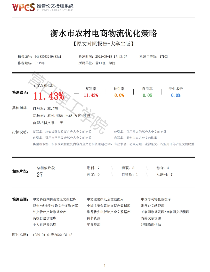 维普论文检测系统VIP PAPER CHECK SYSTEM衡水市农村电商物流优化策略【原文对照报告-大学生版】报告编号:d4h83033299t83a1检测时间:2022-05-1817:43:07检测字符数:17103作者姓名:于卫祥所属单位:营口理工学院全文总相似比复写率他引率自引率专业术语检测结论:11.43%11.43%0.0%0.0%0.0%其他指标:自写率:88.57%高频词:农村,物流,电商,发展,建设典型相似文章:无指标说明:复写率:相似或疑似重复内容占全文的比重他引率:引用他人的部分占全文的比重自引率:引用自己已发表部分占全文的比重自写率:原创内容占全文的比重典型相似性:相似或疑似重复内容占全文总相似比超过30%专业术语:公式定理、法律条文、行业用语等占全文的比重总相似片段期刊:7博硕:8综合:4相似片段:27外文:0自建库:1互联网:7检测范围:中文科技期刊论文全文数据库中文主要报纸全文数据库中国专利特色数据库博士/硕士学位论文全文数据库中国主要会议论文特色数据库港澳台文献资源外文特色文献数据全库维普优先出版论文全文数据库互联网数据资源/互联网文档资源高校自建资源库图书资源古籍文献资源个人自建资源库年鉴资源IPUB原创作品时间范围:1989-01-01至2022-05-18维普论文检测系统VIP PAPER CHECK SYSTEM原文对照颜色标注说明:■自写片段■复写片段(相似或疑似重复)口引用片段(引用)■专业术语(公式定理、法律条文、行业用语等)Yingkou Institute of Technology本科毕业设计(论文)(2022届)题目:衡水市农村电商物流优化策略学院:经济管理学院专业班级:物流管理1802班学号:1804010230姓名:于卫祥指导教师/职称:张庆伟/副教授指导教师/职称:宋楚尧/助教2022年5月15日诚信声明书本人郑重声明:在毕业设计(论文)中严格遵守学校规定,我所提交的题目为《衡水市农村电商物流优化策略》的营口理工学院毕业设计(论文)是在指导教师张庆伟、宋楚尧的指导下独立进行研究、撰写所取得的成果。除了文中特别加以标注和参考文献中所罗列的内容以外,毕业设计(论文)中不包含其他人已经发表或撰写过的研究成果,也不包含为获得营口理工学院或其他教育机构的学位或证书而使用过的材料。毕业设计(论文)和资料若有不实之处,本人愿承担一切相关责任。本人签名:日期:摘要近年来,随着我国居民收入水平和生活条件的不断提高,加上电子商务快速发展的趋势,使得农村地区的物流发展成为新的关注点。因此对农村物流的要求也更加严格,为的就是使农村电商与农村物流协调发展。总体来说,我国的农村物流发展建设仍有许多发展问题亟需解决,目前农村电商和农村物流的协同发展依然存在不协调、信息不对称、运行成本高、资源配置不充分、政策保障不到位等问题且都阻碍了农村电商和农村物流的发展与建设。本文在研究衡水市农村电商物流现状的基础上,对现存的问题进行分析,并有针对性的提出对策及措施。该论文研究的成果对于农村物流的发展具有一定的参考意义,为电子商务背景下农村物流体系的建设提供了可选择的方案。关键词:衡水市:农村电商:农村物流:优化策略AbstractIn recent years,with the continuous improvement of residents'income level and living2维普论文检测系统VIP PAPER CHECK SYSTEMconditions in China,coupled with the rapid development of e-commerce,the development of logisticsin rural areas has become a new concern.Therefore,the requirements for rural logistics are alsomore stringent in order to coordinate the development of rural e-commerce and rural logistics.Ingeneral,there are still many development problems to be solved in the development and constructionof rural logistics in China.At present,the coordinated development of rural e-commerce and rurallogistics is still uncoordinated,asymmetric information,high operating costs,insufficientresource allocation,and inadequate policy support,which hinder the development and construction ofrural e-commerce and rural logistics.Based on the current situation of rural e-commerce logisticsin Hengshui City,this paper analyzes the existing problems and puts forward correspondingcountermeasures.The research results of this paper have reference significance for the furtherstudy of rural logistics,and provide optional solutions for the construction of rural logisticssystem in the context of e-commerce..Keywords:Hengshui City;Rural e-commerce;Rural logistics;optimization strategy目录1.1.1研究背景······1.1.2研究意义······1.2国内研究现状······1.2.1国内研究现状···1.2.2国外研究现状····1.3研究方法········1.3.1文献分析法·····1.3.2实地研究分析法・・・2.1农村物流概述·······2.1.1农村物流概念····2.1.2农村物流特点2.1.2.1农村物流的分散性···2.1.2.2农村物流的季节性···2.1.2.3农村物流的差异性····2.2电子商务概述···········2.2.1电子商务的概念······2.2.2电子商务的发展·····3