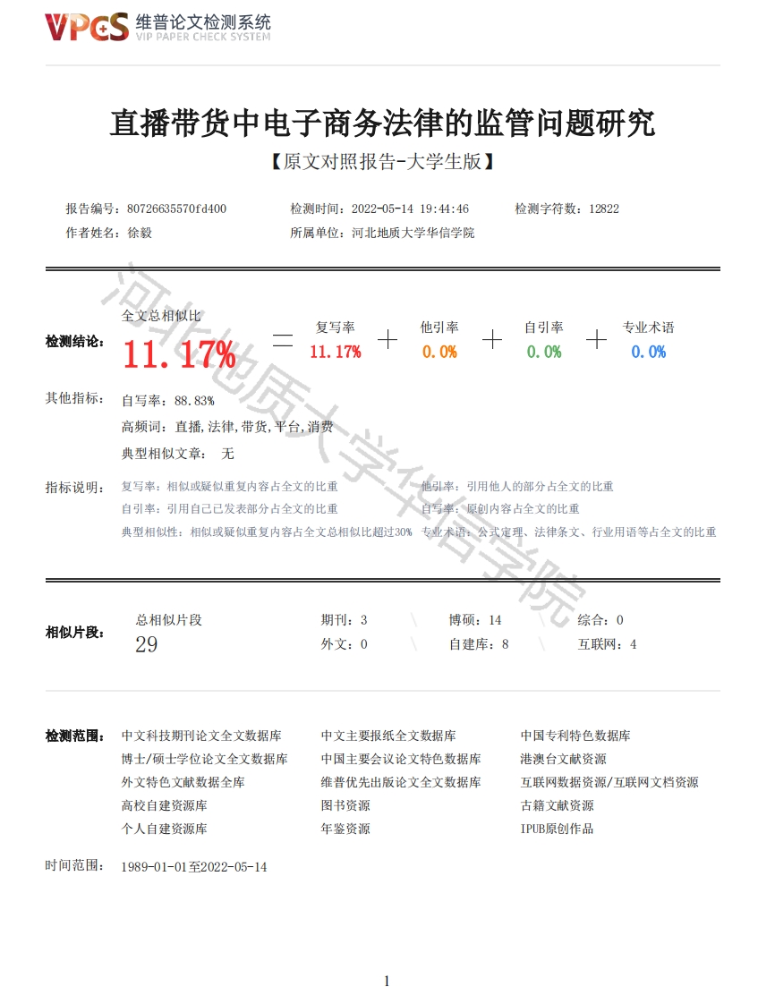维普论文检测系统/IP PAPER CHECK SYSTEM直播带货中电子商务法律的监管问题研究【原文对照报告-大学生版】报告编号:80726635570fd400检测时间:202205-1419:44:46检测字符数:12822作者姓名:徐毅所属单位:河北地质大学华信学院全文总相似比复写率他引率自引率专业术语检测结论:11.17%11.17%0.0%0.0%0.0%其他指标:自写率:88.83%高频词:直播,法律,带货,平台,消费典型相似文章:无指标说明:复写率:相似或疑似重复内容占全文的比重他引率:引用他人的部分占全文的比重自引率:引用自己已发表部分占全文的比重自写率:原创内容占全文的比重典型相似性:相似或疑似重复内容占全文总相似比超过30%专业术语:公式定理、法律条文、行业用语等占全文的比重总相似片段期刊:3博硕:14综合:0相似片段:29外文:0自建库:8互联网:4检测范围:中文科技期刊论文全文数据库中文主要报纸全文数据库中国专利特色数据库博士/硕士学位论文全文数据库中国主要会议论文特色数据库港澳台文献资源外文特色文献数据全库维普优先出版论文全文数据库互联网数据资源/互联网文档资源高校自建资源库图书资源古籍文献资源个人自建资源库年鉴资源IPUB原创作品时间范围:1989-01-01至2022-05-14维普论文检测系统VIP PAPER CHECK SYSTEM原文对照颜色标注说明:■自写片段■复写片段(相似或疑似重复)口引用片段(引用)■专业术语(公式定理、法律条文、行业用语等)学士学位论文直播带货中电子商务法律的监管问题研究姓名徐毅学号418417230117院系电子信息系专业电子商务指导教师王立坤入学华信学院二零二二年五月三十日学位论文原创性声明本人所提交的学位论文《直播带货中电子商务法律的监管问题研究》,是在导师的指导下,独立进行研究工作所取得的原创性成果。除文中已经注明引用的内容外,本论文不包含任何其他个人或集体已经发表或撰写过的研究成果。对本文的研究做出重要贡献的个人和集体,均已在文中标明。本声明的法律后果由本人承担。论文作者(签名):指导教师确认(签名):年月日年月日学位论文版权使用授权书本学位论文作者完全了解河北地质大学华信学院有权保留并向国家有关部门或机构送交学位论文的复印件和磁盘,允许论文被查阅和借阅。本人授权河北地质大学华信学院可以将学位论文的全部或部分内容编入有关数据库进行检索,可以采用影印、缩印或其它复制手段保存、汇编学位论文。保密的学位论文在年解密后适用本授权书。论文作者(签名):指导教师(签名):年月日年月日摘要近年来,随着电子商务的发展,直播带货也作为一种新兴的行业迅速发展起来。无论是传统的电商平台,还是短视频娱乐平台,都纷纷开展了直播带货。这丰富了消费者网络购物的方式,也助推了我国经济的发展。但随着直播带货行业的盛行,直播带货行业中电子商务法律监管问题也越来越多。一大批虚假广告和夸大宣传,网络流量造假的问题被曝光出来,这涉及到多方带货主体的法律责任问题。因此,本文对直播带货中电子商务法律的监管问题2VPCS维普论文检测系统VIP PAPER CHECK SYSTEM进行研究。通过介绍直播带货电子商务法律相关概念,分析了电子商务直播带货法律问题典型案例,接着从这些案例中发现当前的电子商务直播带货存在虚假宣传商品信息,法律关系不明确,虚假宣传交易及流量的法律问题,并分析了其成因,最后提出了完善现有法律法规,建立行业标准,明确带货主体和直播平台的法律责任,畅通消费者维权渠道的建议,希望能够促进直播带货电子商务法律有效的监管。关键词:直播带货:电子商务法:监管ABSTRACTIn recent years,with the development of e-commerce,live delivery has also developed rapidly asa new industry.Both traditional e-commerce platforms and short video entertainment platforms havecarried out live broadcasting with goods.This has enriched the way consumers shop online andboosted China's economic development.However,with the popularity of the live streaming goodsindustry,there are more and more legal supervision problems of e-commerce in the live streaminggoods industry.A large number of false advertising and exaggerated propaganda,network trafficfraud has been exposed,which involves the legal responsibility of the main body of the multi-goods.Therefore,this paper studies the legal supervision of e-commerce in live delivery.By introducingthe live with cargo e-commerce law related concepts,analyzes the electronic commerce live withtypical case goods legal issues,[control]this part have modified,remember the following Englishfrom the cases and then found that the current e-commerce live with cargo false propaganda commodityinformation,legal relationship is not clear,false advertising deals and flow of legal issues,andanalyzes its causes,Finally,suggestions are put forward to improve the existing laws andregulations,establish industry standards,clarify the legal responsibilities of cargo carriers andlivestreaming platforms,and smooth the channels for consumer rights protection,hoping to promotethe effective supervision of livestreaming cargo e-commerce laws.Keywords:Live streaming;E-commerce law Supervision目录1.1研究背景及意义・··1.2.1电子商务法律的含义·····11.3直播带货的定义及特点····1.3.1一般来说价格具有优势······1.3.2消费者可以直观感受商品效果··1.33互动性和社交性强·········1.4直播带货主体的法律地位·······1.4.1带货主播的法律地位·······第2章电子商务直播带货法律问题典型案例