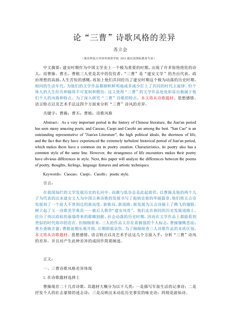 论“三曹”诗歌风格的差异苏立会(重庆师范大学涉外商贸学院2015级汉语国际教育专业)中文摘要:建安时期作为中国文学史上一个极为重要的时期,出现了许多惊艳绝伦的诗人,而曹操、曹不、曹植三人更是其中的佼佼者。“三曹”是“建安文学”的杰出代表,政治理想的高扬,人生苦短的感慨,再加上他们共同经历了建安时期这个极为动荡的历史时期。相同的生活年代,为他们的文学作品都旗帜鲜明地或多或少打上了共同的时代主旋律。但个体人的人生经历和脉络不可复制和模仿,这又使得“三曹”的文学作品处处彰显出独属于他们个人的风格和特点。为了深入研究“三曹”诗歌的特点,本文将从诗歌题材、思想感情、语言特点以及艺术手法这四个方面来分析“三曹”诗风的差异。关键字:曹操:曹不:曹植:诗歌风格Abstract:As a very important period in the history of Chinese literature,the Jian'an periodhas seen many amazing poets,and Caocao,Caopi and Caozhi are among the best."San Cao"is anoutstanding representative of "Jian'an Literature",the high political ideals,the shortness of life,and the fact that they have experienced the extremely turbulent historical period of Jian'an period,which makes them have a common era in poetry creation.Characteristics,its poetry also has acommon style of the same line.However,the strangeness of life encounters makes their poetryhave obvious differences in style.Next,this paper will analyze the differences between the poemsof poetry,thoughts,feelings,language features and artistic techniques.Keywords:Caocao:Caopi:Caozhi:poetic style.引言:在我国灿烂的文学发展历史的长河中,高潮与低谷总是此起彼伏,以曹操及他的两个儿子为代表的汉末建安文人为中国古典诗歌的发展书写了彪炳史册的华丽篇章。他们将五言诗发展到了一个前人不曾到达的新高度,新格局、新道路、新发展为五言诗插上了腾飞的翅膀,树立起了又一诗歌美学典范一一被后人称作“建安风骨”。他们走在相同的历史发展道路上,经历了西汉政权的崩塌带来的群雄割据、社会动荡的历史时期,因而在文学作品上都能看到类似的时代烙印的存在。但细细看来,三人的作品又存在着极强的个人标志:曹操慷慨悲凉:曹不委婉含蓄:曹植前期乐观开朗,后期阴郁哀伤。为了细细探查三人诗歌作品的本质区别,本文将从诗歌题材、思想感情、语言特点以及艺术手法这几个方面入手,分析“三曹”诗风的差异,并且对产生此种差异的成因作简要阐述。正文:一、三曹诗歌风格差异体现1.在诗歌题材选择上曹操现存二十几首诗歌,其题材大概分为以下几类:一是描写军旅生活的记事诗:二是抒发个人的壮志豪情的述志诗:三是反映汉末动乱历史事实的咏史诗:四则是游仙诗。曹操半生戎马,他切身经历了动乱的汉末建安时期,对于当时动乱的社会现实有更深的体会。也因此,他的记事诗成就尤为卓越,他的记事诗写得万分真实、生动、深刻。在他的诗歌中,我们可以看到“白骨露于野,千里无鸡鸣”这样的惨烈,也能感受到“铠甲生虮虱,万姓以死亡”这样的无奈、悲凉。细细品读他的诗不难发现,为了体现出曹操自身强烈的使命担当感,在选题和内容是,都是极力在抒发他发自内心的宏图伟业一一即表达着曹公渴望平定天下的伟大抱负,抒发着他渴望天下归心的迫切情感。曹公的述志诗在他的诗歌中也占了很大的比重,作为一代既极具领袖气质的时代枭雄,又才华横溢的文人,他的诗歌字里行间都透露出远大的报复和坚定地信心:“日月之行,若出其中:星汉灿烂,若出其里”体现出一代雄主气吞山河,雄视六合八荒的英雄领袖胸襟:一句“青青子衿,悠悠我心。但为君故,沉吟至今”道出了曹公求贤若渴的迫切:“立君牧民,为之轨则”则展现了见惯了刀光剑影的曹操期望换一种方式来治理国家,即借法度来完成自己定国安邦的政治理念。纵观历史,有几人能像曹操这样在文可名留青史,武可定国安邦的成就,在那个动荡的历史时期也能诞生如此令人散佩的真男儿,怎能不让人慨叹?又怎么可以能不像他在诗中描写的那样,达到“王者贤且明,宰相股肱皆忠良”,“人耄耋,皆得以寿终。恩泽广及草木昆虫”。就目前流传的典籍来看,虽然曹操的游仙诗和咏史诗作品并算不上高产,更进一步说是数量稀少,但历来物以稀为贵,经历了曹操人生几十年人生经历沉淀的作品可为件件皆为尚品,件件都令后人赞叹不己。游仙诗中,有引用乐府古题的《陌上桑》、《秋胡行》,作者古题新作,不带任何掩饰的表达一种人生失落的情绪。提到他的咏史诗,《薤露》和《蒿里行》是必须被提及的经典作品。董卓篡政的历史事件和军阀混战的客观现实都被曹操通过这两首诗生动而真实地记录下来,借史咏今,以史为鉴。书写了历史,又客观描写出了生活如蝼蚁的社会底层百姓水深火热的生活场景。与他的父亲相比,曹不的诗歌选材与之迥然不同,他诗歌不在主要强调个人宏图远志,更多的是反应轻松、明快的宴游诗、抒情言志诗和出征将士对家中妇人想念的思妇诗。曹不的诗歌从整体上来说内容都比较明快,在他的宴游诗作中我们可以感受到他“忘忧共容与,畅此千秋情”的喜悦:也可以发现“菱芡覆绿水,芙蓉发丹荣”、“丹霞夹明月,华星出云间”这样的美景。其抒情言志诗更多的是透过现实的残酷来抒发自己内心的志向,在《黎阳作诗》中,他所描述的“沐雨栉风”的艰难,让人深