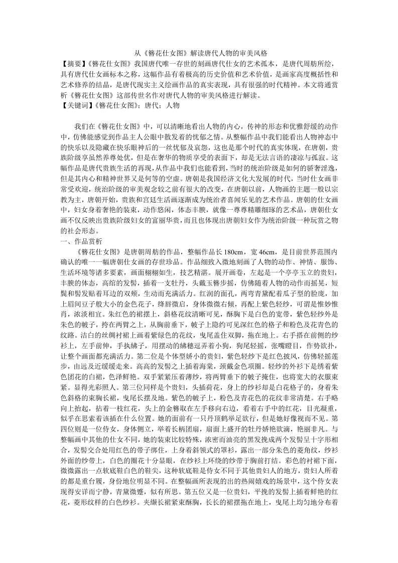 从《簪花仕女图》解读唐代人物的审美风格【摘要】《簪花仕女图》我国唐代唯一存世的刻画唐代仕女的艺术孤本,是唐代周舫所绘,具有唐代仕女画标本之称,这幅作品有着极高的历史价值和艺术价值,是画家高度概括性和艺术修养的结晶,是唐代现实主义绘画作品的真实表现,具有很强的时代精神。本文将通赏析《簪花仕女图》这部传世名作对唐代人物的审美风格进行解读。【关键词】《簪花仕女图》:唐代:人物我们在《簪花仕女图》中,可以清晰地看出人物的内心,传神的形态和优雅舒缓的动作中,仿佛能感觉到作品主人公眼中散发着的忧郁之情。从整幅作品中我们能看出人物神态中的快乐以及隐藏在快乐眼神后的一丝忧郁及哀怨,这也是那个时代的真实体现,在唐朝,贵族阶级享虽然养尊处优,但是在奢华的物质享受的表面下,却是无法言语的凄凉与孤寂。这幅作品是唐代贵族生活的再现,从作品中我们也能看到,当时的统治阶级是如何的骄奢淫逸,但是其内心和精神世界又是何等的空虚。唐朝是我国经济文化大发展的时代,当时仕女画非常受欢迎,统治阶级的审美观念较之前有很大的改变,在唐朝以前,人物画的主题一般以宗教为主,唐朝开始,贵族和宫廷生活画逐渐成为统治者喜闻乐见的艺术作品。唐朝的仕女画中,妇女身着奢艳的装束,动作悠闲,体态丰腴,就像一尊尊精雕细琢的艺术品,唐朝什女画不仅反映出贵族阶级妇女的富丽华贵,而且也体现出唐朝妇女作为统治阶级一种玩赏之物的社会形态。一、作品赏析《簪花仕女图》是唐朝周舫的作品,整幅作品长180cm,宽46cm,是目前世界范围内确认的唯一一幅唐朝仕女画的存世珍品。作品细致入微地刻画了人物的动作、神情、服饰、生活环境等诸多要素,画面栩栩如生,技艺精湛。展开画卷,左起是一个亭亭玉立的贵妇,丰腴的体态,高绾的发髻,插着一支牡丹,头戴玉簪步摇,仿佛随着人物的动作而摇晃,短鬓和髻发贴着耳边的双颊,生动而充满活力。红润的面孔,两弯青黛配着瓜子型的脸庞,加上眉间豆子般大小的金色花子,绛唇微启,身体微微右倾,再配上紫色轻纱,可谓是惟妙惟肖,浓淡相宜。朱红色的裙摆上,斜格花纹清晰可见,酥胸下是白色的宽带,紫色轻纱外是朱色的帔子,挎在两臂之上,从胸前垂下,帔子上隐约可见深红色的格子和粉色及花青色的纹路。洁白的丝绸衬裙上画着紫绿色的花纹,曳尾盖住双脚,拖在地上。右手搭在前侧的纱衫上,左手前伸,手执紼子,用摆动的紼穗逗弄着小狗,狗尾轻摇,张嘴瞪目,作势欲扑,让整个画面都充满活力。第二位是个体型娇小的贵妇,紫色轻纱下是红色披风,仿佛轻摇莲步,由远及近缓缓走来。高高的发髻之上插着海棠,颈戴金色项圈。轻纱的外衫下是绣着紫色团花的白裙,色泽鲜艳。双手紧紧压着薄纱,将两臂垂下的帔子掩住,也将宽大的衣服束紧。显得光彩照人。第三位同样是个贵妇,头插荷花,身上的纱衫却是白花格子的,身着朱色斜格的束胸长裙,曳尾长摆及地。紫色的帔子上,粉色及青花色的花纹非常清楚。右手略向上抬起,拈着一枝红花,头上的金簪取在左手移向右边,看着右手中的红花,目光凝重,似乎在思索着该插在什么位置。她的面前有一只丹顶鹤举足欲行,但是她好像视而不见。第四位则是一位侍女,身体侧立,举着长柄团扇,扇面上盛开的牡丹娇艳欲滴,艳丽非凡。与整幅画中其他的仕女不同,她的装束比较特殊,浓密而油亮的黑发挽成两个发髻呈十字形相合,发髻交合处用红色的带子绑住,上身着斜领式的罩衫,露出一部分朱色的菱角纹,纱衫外面的纱带上,白色的圈花十分显眼,在纱衫上环绕的纱带于胸前打结。彩色的衬裙下面,微微露出一点软底鞋白色的鞋尖,这种软底鞋是侍女不同于其他贵妇人的地方,贵妇人所着的都是重台履,身份地位明显不同。在整幅画所表现的出的热闹嬉戏的场景中,这个侍女表现得安详而宁静,青黛微整,似有所思。第五位又是一位贵妇,平挽的发髻上插着鲜艳的红花,菱形纹样的白色纱衫。夹缬长裙紧束酥胸,长长的裙摆拖在地上,曳尾上均匀地分布着紫绿色的团花,色彩鲜明,雍容典雅而不失富丽华贵之气。轻纱笼罩的长裙上,颜色显得比较朦胧。绘着彩色云风图样的紫色帔子,自然地垂在身后,轻轻举起的右手,芊芊的手指拈起脖颈处的轻纱,仿佛不耐这闷热的天气。左手从轻纱一旁悄悄伸出,仿佛也想要逗弄远处的小狗,希望与小狗一起嬉戏玩耍。二、人物审美风格1、人物装饰的风格当代学者谢稚柳先生一直认为《簪》图是南唐时期的作品,主要是因为:高鬓与替花(也就是所谓的“首翘鬓朵”)以及“纤裳”都是南唐后主李煌时期才开始出现的:其次是人物的着装和辛夷花开放的季节。谢稚柳先生依据南宋时期著名诗人陆游的《南唐书》中有这么一段描写:“高鬓纤裳首翘鬓朵之妆,人皆效之”,这里所说的“高鬓纤裳”和“首翘鬓朵”都是指大周后的装束,所以,认定《簪》图为南唐时期作品。我们无从考察陆游是依据什么而记载的,但是马令的《南唐书》同样也记载了这样的场面,大周后去世,李煌致悼词便有“高鬓凌风”之说。然根据历史知识我们知道,陆游生活在十二世纪到十三世纪初,而南唐后主李煌则生活在十世纪,两者的生活年代相差200余年。所以陆游不可能亲眼所见大周后是何装束,他的记载或许也道听途说。而马令的说法就更