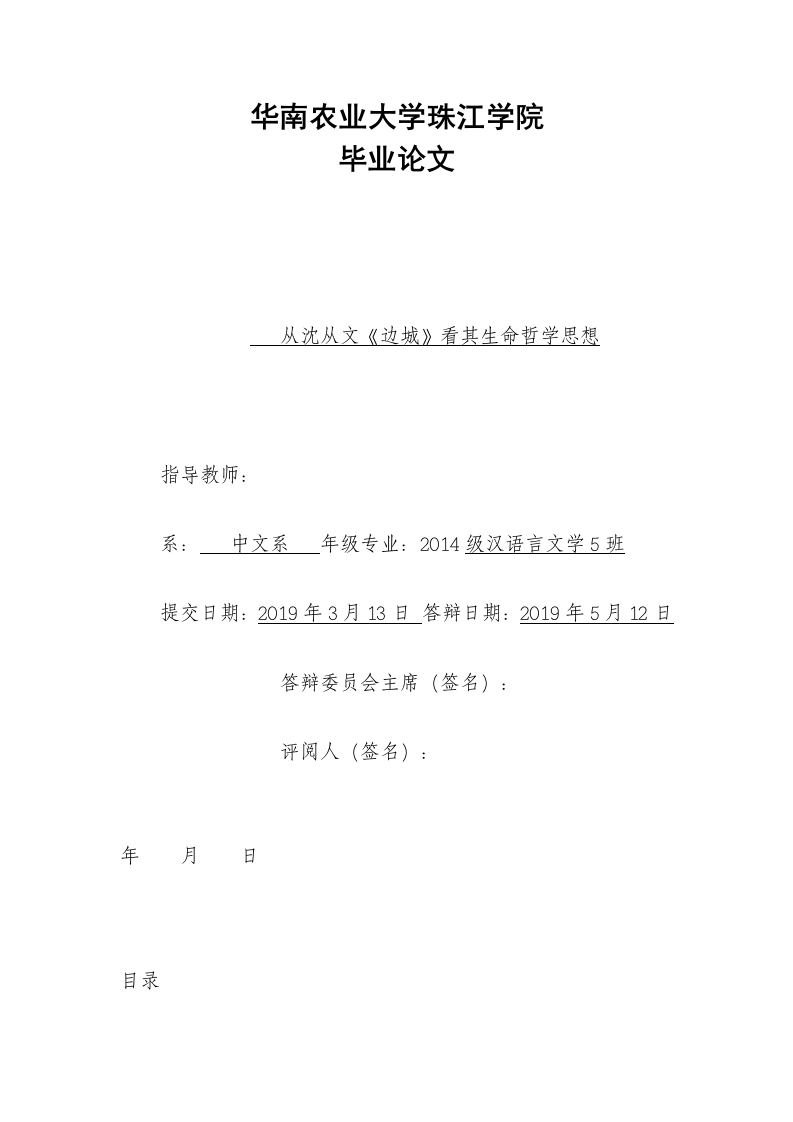 华南农业大学珠江学院毕业论文从沈从文《边城》看其生命哲学思想指导教师:系:中文系年级专业:2014级汉语言文学5班提交日期:2019年3月13日答辩日期:2019年5月12日答辩委员会主席(签名):评阅人(签名):年月日目录摘要一、引言二、沈从文哲学思想形成的由来(一)京派作家—沈从文(二)边城中地方与人物的原型(三)沈从文独特的文学观点三、崇尚自然与生命的原始状态1、效仿水德,厚德载物2、天人合一,崇尚自然四、爱是生命的一种表现形式1、青年男女间的情爱2、祖孙间血脉相连的慈爱3、邻里间的互助互爱五、生死相邻,善待生命(一)生命的庄严性(二)生命和谐的赞歌六、总结AbstractShen Congwen's "Xiangxi world"is a revealed a real,fullof simplicity,implies a better world.A group of ordinary butextraordinary appearance inner life in the world.Their lifeis simple,authentic,with original beauty,the "land ofidyllic beauty"of the carefree and content,let peoplefascinated.Here,the author wants to study "really good,"theborder town,to find the beauty of the soul,let us feel quietin the fast pace of modern life,the baptism of the soul.Inthe "border town"in Xiangxi,the author depicts the beautifulscenery and simple folk customs.The people here do not payattention to the classroom.Do not pay attention topractical.The work is permeated with the sincerity,enthusiasmand liveliness of the young men and women of the whole country.The author expresses his ideal life form in this romantic wildprimitive life form.
