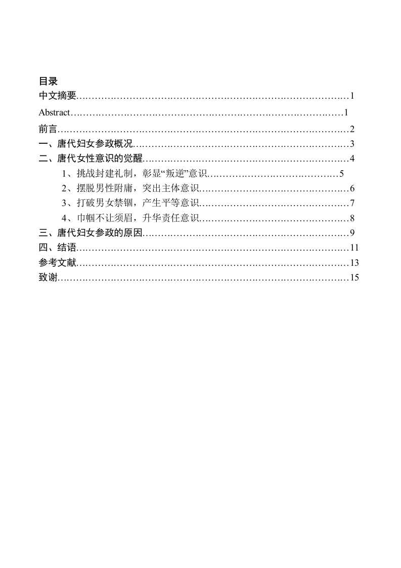 目录中文摘要Abstract..............前言2一、唐代妇女参政概况二、唐代女性意识的觉醒1、挑战封建礼制,彰显“叛逆”意识52、摆脱男性附庸,突出主体意识3、打破男女禁锢,产生平等意识.4、巾帼不让须眉,升华责任意识,三、唐代妇女参政的原因四、结语参考文献….15苏州大学本科生毕业论文摘要:唐代妇女参政主体范围扩大,参政形式多样化,她们的参政一定程度上推动了唐朝的繁荣。从唐代妇女的参政,我们可以看出她们初具“叛逆意识、主体意识、平等意识和责任意识,女性的意识已然觉醒。而这一切皆得益于政治的清明、文化的开放、宗教的多元化以及武则天的个人影响。这种觉醒的女性意识也可以为我们研究当下的一些女性参政问题提供借鉴。Astract:The scope of women's participation in politics in the Tang Dynasty was enlarged,andtheir participation in politics was diversified.Their participation in politics promoted the prosperityof Tang Dynasty to some extent.From the political participation of women in the Tang Dynasty,wecan say that they have "rebellious"consciousness,subjective consciousness,equality consciousnessand responsibility consciousness,and women's consciousness has been awakened.All this is due topolitical clarity,cultural openness,religious pluralism and Wu Zetian's personal influence.Thisawakening feminist consciousness can also provide some references for us to study some of thecurrent female problems.关键词:唐代妇女参政女性意识Keywords:women of Tang Dynasty participation women consciousness苏州大学本科生毕业论文前言《周易·系辞上》:“天尊地卑,乾坤定矣..乾道成男,坤道成女。”,“男尊女卑“男强女弱”成为了古代中国的一种传统观念。在这种观念影响下,“女正位乎内,男正位乎外”成为一种社会规范。女性被认为是男性的附属品,在家庭生活中总处于从属地位。而作为影响国家管理、政治生活以及公共事务的权利一参政权,更多的为男性掌握。但至唐代,妇女阶层在这一阶段变得活跃起来,妇女地位有所提高,其中一个重要表现就是有更多的妇女参与到政治活动中。较其他朝代,唐代妇女的参政形式更加多样化,参政范围也更为广泛。在这种政治生活中,唐代妇女的女性意识在一定程度上得以觉醒,呈现出一种积极争取、敢于抗争的精神面貌。通过对唐代妇女参政问题的研究,不仅能够折射出唐王朝在政治、文化、思想上的开放性,也有助于我们了解唐代女性的意识与面貌,从而更深入的体悟女性价值所在,学会尊重女性。一、唐代妇女参政概况