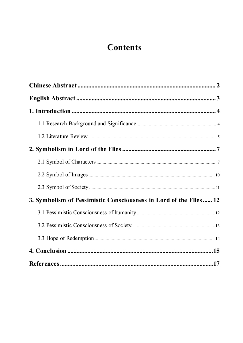 ContentsChinese Abstract.…English Abstract.....l.Introduction…1.1 Research Background and Significance41.2 Literature Review..........2.Symbolism in Lord of the Flies....2.1 Symbol of Characters.......72.2 Symbol of Images..........................103.Symbolism of Pessimistic Consciousness in Lord of the Flies......123.1 Pessimistic Consciousness of humanity..............3.2 Pessimistic Consciousness of Society.......3.3 Hope of Redemption.......144.Conclusion............15References........从象征手法分析《蝇王》中的悲观意识摘要人性的善恶是古今中外每一个学者所探讨的永恒话题。威廉·戈尔丁在其作品《蝇王》中描写了一个被困在孤岛上的孩子们所发生的悲剧,从而对人性的善恶进行了深刻的探讨。该作品突破了之前的荒岛文学描写人们善的一面,通过描写一群天真无邪的孩子堕落成为嗜血的野蛮人的悲剧反思了人性中的善恶观念。丰富的意象和大量的象征一直以来是威廉·戈尔丁的写作风格,而他特殊的时代背景则赋予了这本小说更加深刻的社会性意义。论文以戈尔丁的代表作《蝇王》作为研究对象,主要通过研究该作品中的象征主义来分析小说的寓意和作者的悲观意识。本文主要从人物、意象、和社会性三方面入手,结合戈尔丁个人的生平经历和写作背景研究《蝇王》中的象征主义。对于该作品所体现的悲观意识,从戈尔丁对人性和对社会的两个方面切入,分析了小说《蝇王》中悲剧的必然性,并研究了戈尔丁对于人性和社会的悲观看法,和他希望警醒世人的写作目的。关键词:象征主义;意象:悲观意识:社会性1Analysis of Pessimistic Consciousnessin Lord of the Flies from the Perspective ofSymbolismAbstractWhether the nature of human is good or evil is an eternal topic discussed by scholars fromhome and abroad.In his work Lord of the flies,William Golding describes the tragedy ofchildren who are trapped on an island,and profoundly considers the instinct of human.Thiswork breaks the previous desert island literature's tradition to describe the good side of people,but describes a group of innocent children who change from civil to savage in order to reflect theorigin of human nature.William Golding's writing style is always rich in images and symbols,and his special background gives this novel a profound social significance.This paper takes Golding's masterpiece Lord of the flies as the research object,and mainlyanalyzes the allegorical meaning and pessimistic consciousness of the novel from the perspectiveof symbolism.This paper mainly analyzes the symbolism in Lord of the flies from three aspects:character,image and society,combining with Golding's personal experience and writingbackground.As for his pessimistic consciousness,this paper analyzes the inevitability of thetragedy in Lord of the flies from Golding's view point of humanity and society,and studiesGolding's pessimistic view of human nature and society,and his purpose of warning people.Key words:symbolism;image;pessimistic consciousness;sociality2