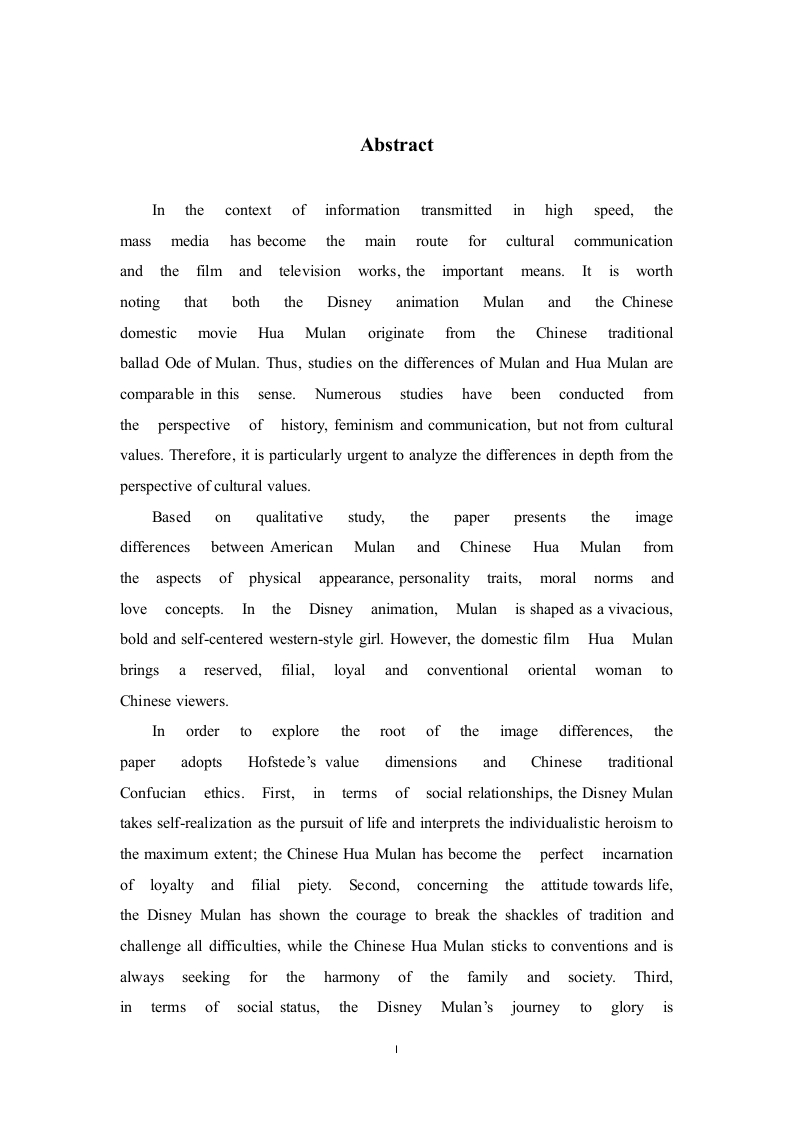 AbstractIn the context of informationtransmitted in high speed,themass media has become the mainroute for culturalcommunicationand the film and television works,the important means.It is worthnoting that both the DisneyanimationMulan andthe Chinesedomestic movie Hua Mulan originate from the Chinesetraditionalballad Ode of Mulan.Thus,studies on the differences of Mulan and Hua Mulan arecomparable in this sense.Numerousstudies have been conducted fromthe perspective of history,feminism and communication,but not from culturalvalues.Therefore,it is particularly urgent to analyze the differences in depth from theperspective of cultural values.Basedon qualitative study,the paper presentstheimagedifferences between American Mulan and Chinese Hua Mulanfromthe aspects of physical appearance,personality traits,moralnorms andlove concepts.In the Disney animation,Mulan is shaped as a vivacious,bold and self-centered western-style girl.However,the domestic filmHua Mulanbrings a reserved,filial,loyal and conventional orientalwoman toChinese viewers.In order to explore the root of the imagedifferences,thepaper adopts Hofstede's value dimensions and ChinesetraditionalConfucian ethics.First,in terms of social relationships,the Disney Mulantakes self-realization as the pursuit of life and interprets the individualistic heroism tothe maximum extent;the Chinese Hua Mulan has become the perfect incarnationof loyalty and filial piety.Second,concerning the attitude towards life,the Disney Mulan has shown the courage to break the shackles of tradition andchallenge all difficulties,while the Chinese Hua Mulan sticks to conventions and isalways seeking for the harmony of the family and society.Third,in terms of social status,the Disney Mulan's journey to glory isfilled with the spirit of freedom and equality;the Chinese Hua Mulanstrictly abides by the feudal order and has fulfilled her duties to her father and thecountry.Finally,in terms of gender roles,the Disney Mulan presents the typicalAmerican male traits such as assertiveness and aggressiveness,the Chinese HuaMulan strictly complies with the three obedience and four virtues.After return as a girl again,Hua Mulan continues to live a simple and conventionallife taking care of the household.Undoubtedly,it was Disney animation that made Mulan well known by theworld.The domestic movie has deepened the cultural connotationof Chinese traditional legends.Valuable experience can be obtained from thetremendous success through the collision and integration of ChineseandWestern cultures.Under the trend of cultural globalization,we shoulddevelopmulticultural values to promote our national cultural brand tothe world.Key words:Reader response theory;Idioms'translation;Images'Transformation摘要在当今信息传播高速发展的时代背景下,大众媒介已成为各国文化传播的主要途径,影视作品则成为文化传播的重要载体。迪斯尼动画《木兰》和国产影片《花木兰》均取材于中国传统叙事民谣《木兰辞》。因此,关于两部影片的差异研究具有可比性。国内外关于花木兰题材的研究很多,大部分从历史传说角度、女性主义视角或传播学角度出发,很少有学者从文化价值观的角度来进行研究。因此,深入剖析两部影片所反映的中美文化价值观差异显得尤为重要。本研究采用定性研究的方法,从人物外形、性格特征、道德意识、爱情理念等方面展现中国花木兰和美国木兰的形象差异。迪斯尼动画将女主人公塑造成一个率真活泼,有勇有谋,敢于寻求自我,追求幸福的美国大女孩形象。而国产电影塑造的仍是传统意义上的隐忍克己、孝父忠君、保家卫国、敢于牺牲的花木兰形象。基于两部影片对木兰形象的不同刻画,本研究以霍夫斯泰德的价值维度和中国传统儒家伦理道德规范为理论依据来分析两部影片所塑造的花木兰形象差异根源。首先,就社会关系而言,迪斯尼木兰以自我实现作为人生追求,将个人英雄主义演绎至极:中国花木兰注重群体意识,成为忠孝品德的完美化身。其次,就生活态度而言,迪斯尼木兰展现出敢于突破传统束缚,挑战权威,活泼大胆,勇于冒险的性格特征:中国花木兰恪守传统,始终追求家和整个社会范围的和谐。再次,就社会地位而言,迪斯尼木兰的荣耀之路充满了追求自由、平等的精神:中国花木兰严格遵守封建秩序并以孝父忠君为行为准则。最后,就性别角色而言,迪斯尼木兰展现了果断、刚毅等典型的男性特质:中国花木兰恪守礼制和传统道德规范,回归女儿身后仍继续“木兰当户织”的生活。毋庸置疑,迪斯尼动画将木兰带向了世界,让更多的国家了解中国的传奇民间故事和传统特色文化。国产影片使木兰回归,加深了中国的宝贵民间传奇故事题材的文化内涵。中西文化融合取得的巨大成功也给我们提供了宝贵的经验。我国在致力于中国传统文化世代相传的推广过程中,要确立全球意识的传播观念,树立多元文化价值观,建立我们自己的民族文化品牌,并充分利用传媒资源,使中国文化走向世界。