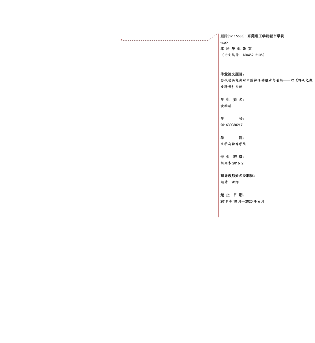删除hx115533小:东莞理工学院城市学院本科毕业论文(论文编号:16G452-2135)单业论文题目:当代动画电影对中国神话的继永与创新一以《哪吒之魔童降世》为例学生姓名:黄雅瑶号:201630060217学文学与传蝶学院专业班级:新闻本2016-2指导教师姓名及职称:起止日期:2019年10月一2020年6月东莞理工学院城市学院学位论文版权使用授权书本学位论文作者完全了解学校有关保留、使用学位论文的规定,同意学校保留并向国家有关部门或机构送交论文的复印件和电子版,允许论文被查阅和借阅。本人授权东莞理工学院城市学院可以将本学位论文的全部或部分内容编入有关数据库进行检索,可以采用影印、缩印或扫描等复制手段保存和汇编本学位论文。保密口,在年解密后适用本授权书。本学位论文属于不保密口。(请在以上方框内打“√”)学位论文作者签名:日期:2020年6月20日