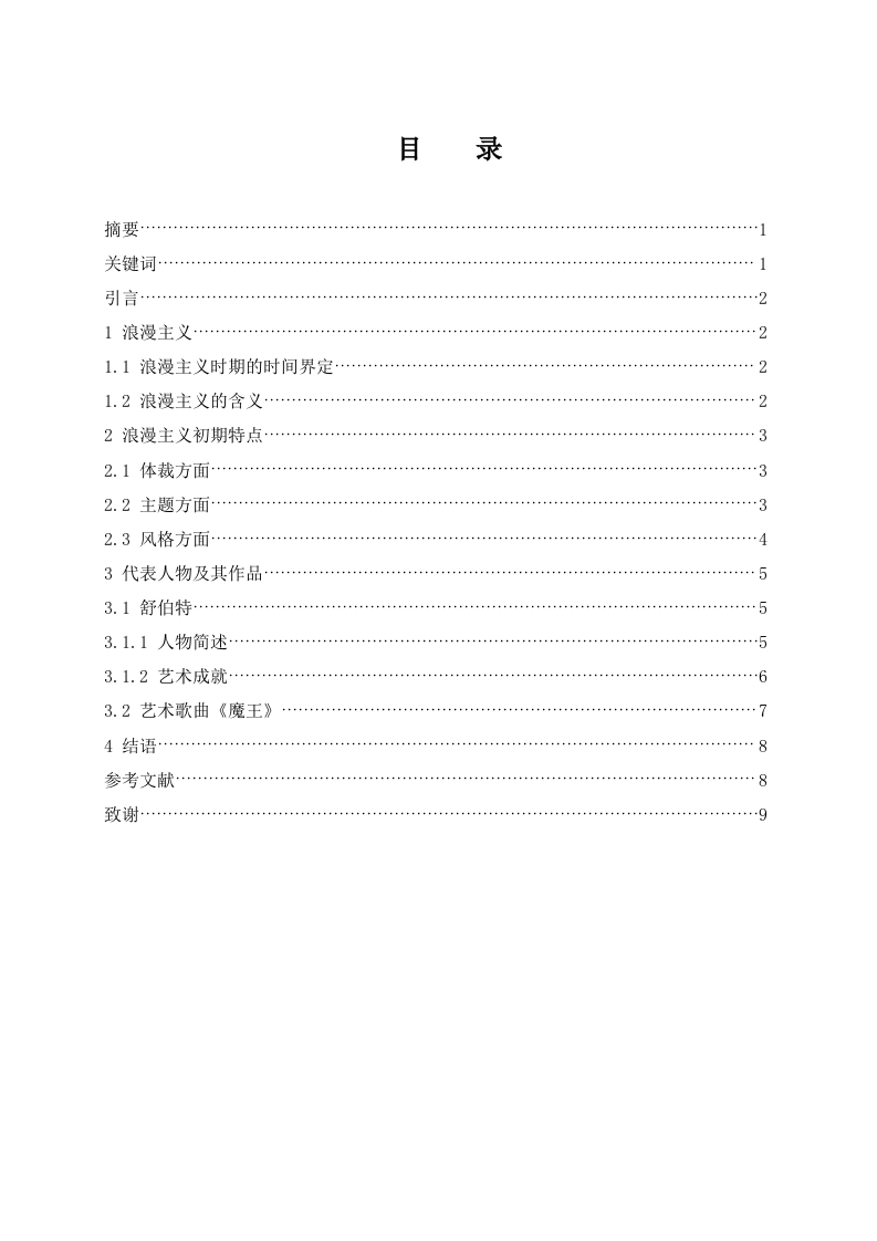 目录摘要…关键词…引言……21浪漫主义…1.1浪漫主义时期的时间界定…21.2浪漫主义的含义……22浪漫主义初期特点……32.1体裁方面…32.2主题方面……32.3风格方面…3代表人物及其作品…53.1舒伯特……53.1.1人物简述……53.1.2艺术成就63.2艺术歌曲《魔王》4结语参考文献……8致谢……9浅谈浪漫主义初期阶段的音乐特点一以舒伯特叙事曲《魔王》为例摘要:本文主要分析的是浪漫主义初期阶段的音乐发展,从这一时期的作曲家舒伯特以及他的作品入手分析总结出这一时期的音乐特点。这一段时期的音乐特点旨在突出内心深处的感受、个人感情与幻想。关键词:浪漫主义初期:音乐特点:舒伯特:艺术歌曲On the Characteristics of Music in the initial stage of Romanticperiod:take Franz Schubert'ballade "Erlkoenig"for exampleAbstract:This article mainly narrated the music development in the initial stage of romanticperiod,and analysed the characteristics of music of this period through discuss Franz Schubert'sballade "Erlkoening".The musical features of this period are aimed at experience of heart,personalfeelings and fantasyKey words:initial stage of Romantic;characteristics of music;Franz Schuber;lied1引言十八世纪末、十九世纪初的欧洲,民主革命运动高涨,政治风云变幻复杂,随着各领域的民族主义潮流,思想文化领域、文学艺术等方面也逐渐形成一种新的风格和潮流。随着法国大革命,拿破仑为首的法兰西资本主义阶层发动政变,目的是为了重新开辟旧王朝,但最后革命失败,由此人民产生了对现实绝望的悲观情绪,从而有了新的流派称之为浪漫主义。本文主要研究的就是浪漫主义初期阶段的音乐特点,将着重分析来自奥地利的作曲家舒伯特及他的作品《魔王》,从而简要的分析这一时期的音乐特点。1浪漫主义1.1浪漫主义时期的时间划分如果以广义的时间概念来说,这一时期的时间划分稍较含糊,一般来说它是指十八世纪末至十九世纪初这长达一个世纪的时期,在这一时期里,“浪漫主义”渐渐成为一个重要指示思想,给了极大一部分的作曲家,如威伯、舒伯特等一个指向标,创作了体裁多样的作品。这一时期大致可以分成初期(19世纪10一一20年代)、中期(19世纪30一-40年代)、中后期(19世纪40一-80年代)和晚期(19世纪90年代一一20世纪初)这四个阶段。1.2浪漫主义的含义“浪漫”一词源自于罗曼语,中古时期有大量的以罗曼语为主要语言写成的诗歌和传奇,而这些故事或传奇小说大部分写的都是欧洲中世纪的英雄冒险的奇妙经历,情节离奇富于幻想。“浪漫”最开始指的就是这一系列的故事,但到了十八世纪,“浪漫”这一词语就有了新一层的含义,人们把它拿来比作与真实世界不同的、有分别的幻想出来的世界,这个词语与“想象”、“虚构”还有“难以名状”等词意义靠近,于是在十八世纪末这一词语被欧洲史学家用来形容当时盛行的文艺思潮与流派。而在音乐领域这一块,十九世纪前后一百多年,这一时期的作曲家们将自身的主观情感、趣味才能和个性特征以奔放的姿态自如地在其作品中展现出来,他们的作品都带着强烈的个性化烙印,这一时期的音乐强调心灵的感受。于是“浪2