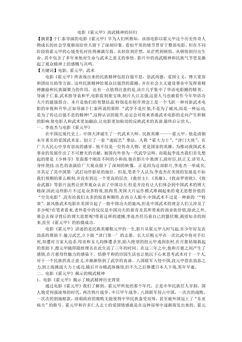 电影《霍元甲》尚武精神的回归【摘要】于仁泰导演的电影《霍元甲》早为人们所熟知。该部电影以霍元甲这个历史传奇人物成长的社会学观察而给世人留下了深刻印象。看似平常的情节贯穿于整部电影,但在不同阶段将霍元甲的心境变化衬托得淋漓尽致。从轻狂到茫然,从茫然到顿悟,从顿悟到付出生命。其中包含了多年来他对生命与武术之意义的参悟。影片中的尚武精神和民族气节更是激起了观众精神上的感慨与共鸣。【关键词】电影;霍元甲;武术电影《霍元甲》所表现出来的民族精神包括自强不总,崇武尚德,爱国主义,博大宽容和团结互助等方面。这些民族精神给观众以强烈的震撼,并在社会主义建设事业中发挥着精神激励和民族凝聚力的作用。还有一点值得注意的是,该片几乎集中了华语电影圈的精英。导演于仁泰,武术指导袁和平,电影监制崔宝珠,制片人江志强,这套人马也被看作今年华语功夫片的最强组合。本片是他们的智慧结晶.特别是在制作理念上是一个飞跃一种对新武术电影的审视和升华,正如导演于仁泰所说的那样.“武学不是打架,不是为了威风,而是一种运动,是为了传达自强不息的精神!”,这种认识的提升,必定会对将来香港武术电影的走向产生积极的影响.使电影人和武术更加融洽,让电影更加贴切的反映武术的真谛最终启示世人。一、李连杰与电影《霍元甲》在中国近现代史上,中国天津诞生了一代武术大师、民族英雄一一一霍元甲。他是清朝末年著名的爱国武术家,创立了一套“迷踪艺”拳法,人称“霍大力士”、“津门大侠”,在广大人民心中享有崇高的盛誉。他不仅是一位传奇人物,更是国家的英雄,为推动我国武术事业的发展作出了不可磨灭的贡献,被国内外誉为一代武学宗师。而提起李连杰我们首先想起的便是《少林寺》里面那个刚直不阿的小和尚他在影片中救唐王,除奸臣,扶正义.济穷人,身怀绝技出色的表演给广大观众留下了深刻的映像。正是因为这部影片,李连杰一举成名,并其定了其中国第一武打动作影星的地位。但是,笔者个人认为.李连杰在美国的发展是不如我们预期的那么顺利,并没有到达一个更高的层次.《救世主》、《英雄》、《致命罗密欧》、《致命武器》等影片虽然让世界观众认识了中国功夫.但是并没有让人们体会到中国武术的博大精深因此这些影片不过是众多特效,肌肉男.美国大片运作模式堆砌起来的奄无思想价值的“空壳电影”,没有给我们太多的惊喜和期待,在西方人眼中.中国武术不过是一种新的“特效”。新风格武术电影在美国引起了一股中国功夫的旋风,但是中国武术的理念人们又涉及了多少呢?在笔者看来,老外看中的仅仅是中国功夫的新奇及其所带来的商业街价值,除此之外,谁会去探寻背后的博大思想呢?带着这样的遗憾,李连杰经历着自己的蛰伏期,褐望知音的到来,直至《霍元甲》的拍摄成功。电影《霍元甲》讲述的是民族英雄粗元甲的一生,影片从霍元甲儿时写起.在少年好友农劲荪的帮助下.偷习武艺,立下做“津门第一’的志愿。长大后粗元甲在一次比武中将对手打死,却遭对方家人追杀,母亲和女儿均惨遭杀害,陷入绝望的扭元甲逃到农村,在月慈姑娘救起的帮助下,搜元甲随即隐姓埋名在此生活了三年的时间。在这三年之中,他和月慈之间产生了感情,在月慈母性魅力的感染下、恬静平和的田园生活也让他沉下心来思考武术对于一个人,对于一个民族的真正意义,并渐渐悟到了武学的真谛。八国联军入侵中国,段元甲借农劲荪之力,到上海桃战大力士成功,随后开办精武体操馆,但不久之后惨遭日本人下毒,英年早逝。二、电影《霍元甲》揭示的精武精神1、电影《霍元甲》揭示了精武精神历史背景通过电影《霍元甲》我们了解到,霍元甲所处的那个年代,正是中华民族任人宰割,国人饱受列强凌辱的时代。两次鸦片战争、中日甲午战争、八国联军侵占中国,一次次的战败,一次次的割地赔款,清朝政府的腐败无能使得中华民族备受屈辱,甚至被外国冠上了“东亚病夫”的称号。霍元甲和许多仁人志士的爱国情感就是在这种屈辱中逐渐萌发出来的。霍元甲最初习武只是想“以武谋生”、“强健体魄”,后来与中国的进步人士接触、交流,逐渐萌生了练武是为了抵御外侮、强国强种的精武精神。这种精神的核心要素就是爱国主义,目的就是要强国、强民。确定了习武的主要目标,霍元甲就在这条路上坚定地走下去。他嫉恶如仇,坚守忠义,侠肝义胆,心怀忧国忧民之心和强国强民之志。他虽然武功高强,在天津多次打败前来挑衅的各路武林高手,却始终谦逊礼让,扶危济困,乐于助人。如果遇到匪徒、强盗或贪官加害于民,霍元甲总会拔刀相助,挺身而出:面临英国大力士奥皮音侮辱中华民众是“东亚病夫”,中华民族是“病夫之国”的挑衅以及俄国大力士卡罗卡“打遍中华无敌手”的叫嚣,霍元甲义愤填膺,奋勇向前与他们较量,并成功击退他们。后来,霍元甲还打败了日本高手。在天津、上海等地,霍元甲的名声越来越大,他以高超武艺和凛然正气挫败了外国列强的锐气,一洗“东亚病夫”的耻辱。这种气魄令国人欢欣鼓舞,扬眉吐气。霍元甲的精武精神和爱国主义思想的形成,与他所处的时代是分不开的,正所谓“时势造英雄”。严格的说,《霍元甲》是李连杰走出好莱坞模式后的第一
