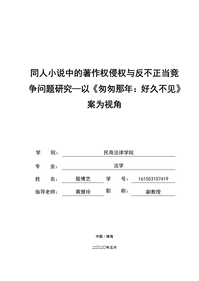 同人小说中的著作权侵权与反不正当竞争问题研究一以《匆匆那年:好久不见》案为视角学院:民商法律学院专业:法学姓名:殷博艺学号:161503107419指导老师:黄慧玲职称:副教授中国·珠海二O二O年五月北京理工大学珠海学院2020届本料生毕业论文诚信承诺书本人郑重承诺:我所呈交的毕业论文《同人小说中的著作权侵权与反不正当竞争问题研究一以《匆匆那年:好久不见》案为视角》是在指导教师的指导下,独立开展研究取得的成果,文中引用他人的观点和材料,均在文后按顺序列出其参考文献,论文使用的数据真实可靠。承诺人签名:日期:年月日北京理工大学珠海学院2020届本科生毕业论文同人小说中的著作权侵权与反不正当竞争问题研究一以《匆匆那年:好久不见》案为视角摘要改革开放以来人们的生产生活方式发生了天翻地覆的变化,我国文化娱乐产业也日益繁荣,尤其是近年来在数字化,互联网等高新技术快速发展的条件下,越来越多的网络文学作品被翻拍或是改编成影视作品并且取得了不错的商业价值。同时,一部优秀的文学作品中充分描述的角色、复杂的人物关系以及小说背景情节的描写很有可能被喜爱它的受众直接借用创作出新的文学作品,亦或是影视制作单位在拍摄原创作作者的作品取得了不错的商业价值后,再次创作出原作品的续集希望进一步扩大取得商业价值。在这种背景下,可能将以角色为中心的情节带入新的作品,此时,我国对文学作品的原创激励机制与再创作的自由之间的矛盾日益显现,解决这一问题的关键在于怎样平衡原创作者与再创作作者之间的利益。本文将从王晓頓等与浙江梦幻星生园影视文化有限公司就《匆匆那年:好久不见》著作权权属侵权纠纷一案为视角探讨同人小说中的著作权侵权与反不正当竞争相关问题的研究,以及对此类案件适用法律的思考。关键词:同人小说:著作权:不正当竞争:利益平衡