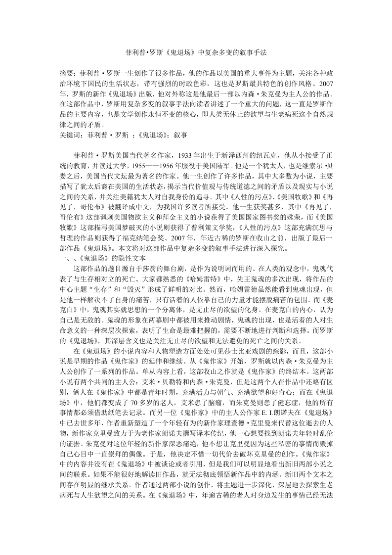 菲利普·罗斯《鬼退场》中复杂多变的叙事手法摘要:菲利普·罗斯一生创作了很多作品,他的作品以美国的重大事件为主题,关注各种政治环境下国民的生活状态,带有强烈的时政色彩,这也是罗斯最具特色的创作风格。2007年,罗斯的新作《鬼退场》出版,他对外称这是他最后一部以内森·朱克曼为主人公的作品。在这部作品中,罗斯用复杂多变的叙事手法向读者讲述了一个重大的问题,这一直是罗斯作品的主要内容,也是文学创作永恒不变的核心,即人类无休止的欲望与生老病死这个自然规律之间的矛盾。关键词:菲利普·罗斯:《鬼退场》:叙事菲利普·罗斯美国当代著名作家,1933年出生于新泽西州的纽瓦克,他从小接受了正统的教育,并读过大学,1955一一1956年服役于美国陆军。他是一个犹太人,也是继索尔贝娄之后,美国当代文坛最为著名的作家。他一生创作了许多作品,其中大多数为小说,主要描写了犹太后裔在美国的生活状态,揭示当代价值观与传统道德之间的矛盾以及现实与小说之间的关系,并关注美籍犹太人对自我身份的追寻。其中《人性的污点》、《美国牧歌》和《再见了,哥伦布》被翻译成中文,为我国许多读者所接受。他一生获奖甚多,其中《再见了,哥伦布》这部讽刺美国物欲主义和拜金主义的小说获得了美国国家图书奖的殊荣,而《美国牧歌》这部描写美国梦破灭的小说则获得了普利策文学奖,《人性的污点》这部充满沉思与哲理的作品则获得了福克纳笔会奖、2007年,年近古稀的罗斯在收山之前,出版了最后一部作品《鬼退场》。本文将对这部作品中复杂多变的叙事手法进行深入探究一、、《鬼退场》的隐性文本这部作品的题目源自于莎翁的舞台剧,是作为说明词而用的。在人类的观念中,鬼魂代表了与生存相对立的死亡。大家都熟悉的《哈姆雷特》中,先王鬼魂的多次出现,将作品的中心主题“生存”和“毁灭”形成了鲜明的对比。然而,哈姆雷德虽然能看到鬼魂出现,但是他一样解决不了自身的痛苦,只有活着的人依靠自己的力量才能摆脱痛苦的包围。而《麦克白》中,鬼魂其实就思想的一个分离体,是无止尽的欲望的化身。在麦克白的内心,认为自己是无敌的。鬼魂的形象在两幕剧中都被用来推动剧情,鬼魂的出现,也是活着的人对生命意义的一种深层次探索,表明了生命是最难把握的,需要不断地进行判断和选择。而罗斯的《鬼退场》,其深层含义也是关注无止尽的欲望和无法避免的死亡之间的关系。在《鬼退场》的小说内容和人物塑造方面处处可见莎士比亚戏剧的踪影,而且,这部小说是早期的作品《鬼作家》的延伸和继续。从《鬼作家》开始,罗斯就以内森·朱克曼为主人公创作了一系列的作品。单从内容上看,这部收山之作就是《鬼作家》的终结本。这两部小说有两个共同的主人公:艾米·贝勒特和内森·朱克曼,但是这两个人在作品中还略有区别,俩人在《鬼作家》中都是青年时期,充满活力与朝气、充满欲望和好奇心:而在《鬼退场》中,他们都变成了70多岁的老人,艾米患了脑瘤,而朱克曼侧患了健忘症,他的所有事情都必须借助纸笔去记录。而另一位《鬼作家》中的主人公作家E.I朗诺夫在《鬼退场》中己去世多年,作者重新塑造了一个年轻有为的新作家理查德·克里曼来代替这位逝去的人物,新作家克里曼致力于为老作家朗诺夫撰写译本传纪,他一心想要找到朗诺夫年轻时乱伦的证据。朱克曼对这位年轻的新作家深恶痛绝,他不想让克里曼因为这些私密的事情而毁掉自己心目中一直崇拜的偶像。于是,他决定不惜一切代价去破坏克里曼的创作。《鬼作家》中的内容并没有在《鬼退场》中被谈论或者引用,但是我们可以明显地看出新旧两部小说之间的联系。如果不能很好地解读旧作品,就无法彻底领悟新作品中的内涵。新旧两个文本之间存在明显的继承关系。作者通过两部小说的创作,将主题进一步深化,深层地去探索生老病死与人生欲望之间的关系。在《鬼退场》中,年逾古稀的老人对身边发生的事情己经无法控制,只能顺其自然或者干脆逃离,于是,朱克曼离开了纽约喧嚣的都市,回到了人烟稀少的乡下生活。二、《鬼退场》多变的叙事方式罗斯在《鬼退场》中,采用了聚焦叙事的方式。聚焦叙事一般要明确叙述者,也就是要非常明确是谁和谁说话。聚焦叙事一般分为三类:第一类,无聚焦或者零聚焦,也就是在叙事过程中,叙事者无所不知,所有事情都可以叙述出来,表现为叙述者>人物:第二类为内聚焦,也就是叙述者只叙述自己知道的事情,表现为叙述者=人物:第三类是叙述者不完全叙述所知道的事情,这表现为叙述者<人物。罗斯在《鬼退场》采用了内聚焦的形式叙事。内森·朱克曼仍然是小说的主人公,是罗斯设定的“第二自我”,而作品是第一人称叙事方式,那么这个第一人称的“我”就是作者设置的固定性人物,是在有限视角内叙事,也就是叙述者以正在经历的角度:或者以“我”回忆过去的角度去叙事:还有作为第一人称的“我”站在旁观者的角度去叙事。由于在这部作品中,第一人称“我”即是小说的主人公,那么站在他的角度上去叙事,所观察的范围以及叙事的可靠性都比较真实,在叙事上更为有利。实际上,罗斯共创作了九部关于朱克曼的小说,都是以“第二自我”的视角去叙事的,《鬼退场》是这一系列小说的收尾之作。在