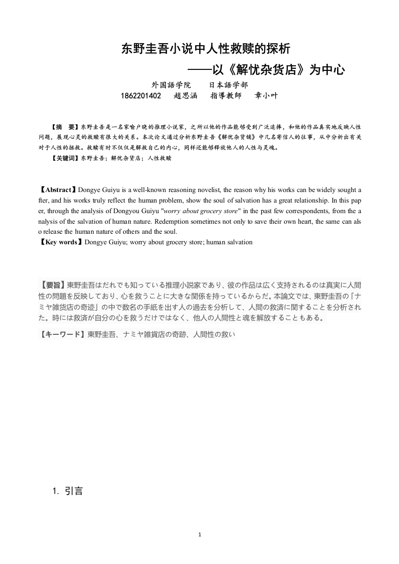 东野圭吾小说中人性救赎的探析一以《解忧杂货店》为中心外国語学院日本語学部1862201402趙思涵指導教師章小叶【摘要】东野圭吾是一名家喻户跳的推理小说家,之所以他的作品能够受到广泛追捧,和他的作品真实地反映人性问题,展现心灵的效牍有很大的关系。本次论文通过分析东野主吾《解忧杂货铺》中几名寄信人的往事,从中分析出有关对于人性的拯救。效赎有时不仅仅是解效自己的内心,同样还能够释放他人的人性与灵魂。【关键词】东野主吾:解此杂货店:人性效赎[Abstract]Dongye Guiyu is a well-known reasoning novelist,the reason why his works can be widely sought after,and his works truly reflect the human problem,show the soul of salvation has a great relationship.In this paper,through the analysis of Dongyou Guiyu "worry about grocery store"in the past few correspondents,from the analysis of the salvation of human nature.Redemption sometimes not only to save their own heart,the same can also release the human nature of others and the soul.[Key wordsI Dongye Guiyu;worry about grocery store;human salvation【要旨】東野圭吾はだれでも知っている推理小説家であり、彼の作品は広く支持されるのは真実に人間性の問題を反映しており、心を救うことに大きな関係を持っているからだ。本論文では、東野圭吾の「ナミヤ雑货店の奇迹」の中で数名の手紙を出す人の過去を分析して、人間の救済に関することを分析された。時には救済が自分の心を救うだけではなく、他人の人間性と魂を解放することもある。【キーワード】東野圭吾、ナミヤ雑貨店の奇跡、人間性の救い1.引言日本著名推理小说东野圭吾总是以其细腻的文字从不同方面直击读者内心,凭借众多作品在日本推理界中独树一帜如今,东野圭吾这个名字几乎已经成为了推理小说的代名词】《嫌疑人X的献身》中提现的罪与爱的融合,也许有时候一个人好好活着就是对另一个人的救赎。另一部《白夜行》中,亮司想要得到救赎之光,尽管他渴望阳光的温暖,但他只有不停找寻救赎,终其一生的赎罪‘熊伟,2014),才得到了人性的释放。而《解忧杂货铺》以其不同寻常的叙事方式赢得了社会广泛好评,以情节不断引人入胜。在读者从东野圭吾创造的杂货铺中走出时,会意外地发现这人间的关爱与暖情。“我认为不可以轻率地判断人性是善良的还是丑陋的,我一直认为人性应当是美好的,只是会因为一些无可奈何的原因,人们才会做出一些无可奈何的事。”东野圭吾在《在推理小说里,供奉着人性》中的这番话,或许也体现出了这部《解忧杂货铺》的内涵:在人们发挥潜意识作用,褐望拯救身边的人时,其实自己的灵魂也得到了救赎。本次论文以东野圭吾的《解忧杂货铺》为中心,从寄信者与回信者两个方面分别对人性救赎进行深入分析和探讨。2.寄信者—被救赎者的救赎《浪矢杂货店的奇迹》为《解忧杂货铺》的原名。小说的开头是三个小混混翔太、幸平、敦也因为盗窃而来的车子突然出现故障,迫使他们躲到一个破旧的杂货店度过一个晚上。这时,门口的信箱中突然掉落了一封信。原来,只要将自己的因惑以信的形式寄给解忧杂货铺,第二天就可以得到回答。于是,翔太、幸平、敦也这三名年轻人就开始回复这些信件,为寄信人排造忧虑:年轻少女静子因为患有绝症的男友而在人性与梦想之中犹豫不定:鱼店音乐人在现实中踌躇不前,又在人性的考量中熠熠闪光:跑路小男孩因为家庭的原因,挣扎在灵魂与亲情的无奈里…正是因为这一次次与杂货铺的偶然交织,演绎出了一段段截然不同的人生。接下来,将从寄信者女击剑运动员静子、跑路小男孩、鱼店音乐人与三个特殊回信者的来往,进行对于人性的分析,并探讨其中的救赎之光。2.1女击剑运动员的心灵救赎三名小混混从第一封信中推新出,信中所说的时代应该是四十年前的奥运会,主角是一名因为男友患有绝症而在梦想中犹豫不前的击剑运动员一一静子。静子一生的梦想就是参加奥运会,但是她的男朋友却在她即将代表日本参加奥运会的时候罹患绝症。此时,静子在培男友走完生命的最后一程和继续集训以参加奥运会之间徘徊痛苦”。静子犹豫不决的原因有二:一她无比向往着能够在奥运会上拼搏斗剑,但是又不忍心让男友孤独地死去,因此,静子想要放弃自己的梦想:二她担心因为自己的放弃和软弱,让男友倍感失望导致绝症恶化,因此静子的内心变得更加矛盾与痛苦。简言之,静子一边放不下对于深爱着的男友的人性关怀,另一边又放不下对于一生梦想的执着追求。此时静子的内心中仿佛叠加着两根永远不相交的平行线:人性与梦想。在静子万分踌躇时,却不知自己的男友也因为自己的矛盾而身感痛苦着:“我不愿意她因为自己的关系而放弃,我知道这是她一生的梦想。”(东野圭吾,2014:57-58)两个纯粹地深爱着彼此的人之间一旦发生了关于选择的矛盾,那他们则永远无法逃得出这个漩涡。但是那三名小混混却回信让静子放弃比赛。经过几次三番的回信、思考,静子终于幡然醒悟,她终于找到了这道选择题的最终答案:奥运会是我一生的梦想,我不会就此放弃。静子对男友说,如果自己放弃比赛就可以救男友一命,那么她会毫不犹豫地答应,但是现如今的事实却并非如此,所以她不会放弃自己的梦想,也请男友选择谅解。“正是因为我一直在追求梦想,所以才活得