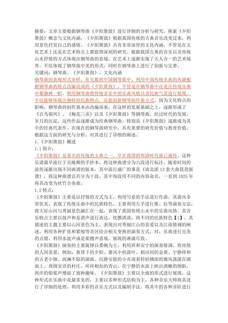 摘要:文章主要根据钢琴曲《夕阳箫鼓》进行详细的分析与研究,探索《夕阳箫鼓》概念与文化内涵,《夕阳箫鼓》根据我国传统的古典音乐改变过来,利用景色抒发自己的感情。《夕阳箫鼓》具有非常深厚的文化内涵,不管是在文化艺术上还是在艺术特点上都值得深刻的研究。根据我国古典的音乐以及传统山水抒情的方式体现出钢琴曲的意境,在艺术上逐渐实现了天人合一的艺术境界。不仅体现了钢琴曲中美的形式,同时在钢琴曲上进行了创新与完善。关键词:钢琴曲、《夕阳箫鼓》、文化内涵钢琴曲的表现形式多样,在无数的中国钢琴曲中,利用中国传统乐曲的内涵根据钢琴曲的特点改编而成的《夕阳箫鼓》,不管是在钢琴曲中还是在传统乐曲中都独树一帜。利用钢琴曲将传统音乐中的乐曲风格以及民族气息进行展现,不仅能够体现出独特的民族特点,还能创新钢琴的作曲方式。因为文化特点的影响,钢琴曲的创作基本由改编而来,在这样的发展基础之上,逐渐形成了《百鸟朝凤》、《梅花三弄》以及《夕阳箫鼓》等钢琴曲,经过时代的发展,岁月的沉淀,这些作品逐渐成为经典钢琴曲。特别是《夕阳箫鼓》逐渐成为其中的经典代表作。在现在的钢琴曲研究中,具有重要的研究价值与教育价值。根据这方面的研究与分析,对其进行了详细的阐述。1.《夕阳箫鼓》概述1.1简介:《夕阳箫鼓》是著名的传统的文曲之一,早在我国的明清时代就已盛传。这种乐谱最早流行于吴晚卿的手抄本,将这种曲谱分为六段进行标注。随着时间的流传逐渐出现不同曲谱的版本,其中流行盛广的事是《南北派13套大曲琵琶新谱》,将这种曲谱总共分为十段,其中每段用不同的内容命名,一直到1925年将其改变为丝竹合奏曲。1.2特点:《夕阳箫鼓》主要是以抒情的方式为主,利用写意的手法进行作曲,其曲风非常优美,表现了传统乐曲中的民族特色。主要利用左手进行推、拉等演奏方法,将大好山河与秀丽景色融汇在一起,表现了我国传统山水中的乐曲风情。其音乐特点主要以鼓声和是消声进行表达,优雅清淡,将不同的民族特色【1】。其描述的主题主要以山河景色为主,表现出对秀丽江山的喜爱以及江南情调的阐述。利用各种扩张和紧缩等音区结合相互变换的演奏方式,对,乐曲进行完美的点缀,利用水波声或是桨橹声意境,展现的淋漓尽致。《夕阳箫鼓》演奏的主要旋律以委婉为主,利用祥和安宁的演奏情调,将传统的人间美景,例如:黄昏下的夕阳、萧风中的落叶、稻田间的金黄、宁静祥和的古老小镇、波澜不惊的湖面、沉静安稳的小舟迎着轻轻拂面的微风荡漾在湖面上。周围安详的村庄、环环相扣的青山,在宁静的水面上映出清晰的倒影,两岸的船桨声增添了别种趣味。《夕阳箫鼓》主要以全曲的形式进行展现,这种形式在乐曲中是最常见的,主要以多种形式结构为主,各种音乐大师将其进行了详细的处理,利用多彩的音乐方式以及编制手法,将其中的各种音阶进行充分的展现,不仅将古典音乐的优雅与现代音乐的写实融合在一起,更加增添了其中的音乐表现形式,让音乐更富有蓬勃的朝气。这种乐曲在我国非常流行,其中古典的吉他演奏家将其改编为吉他的独奏曲,在我国各地广为流传,久而久之将这种吉他曲改编为钢琴演奏曲,逐渐流行到现在。文章中所讲到的《夕阳箫鼓》钢琴曲主要来自于《春江花月夜》内容。这首古诗,主要有由唐朝的张若虚住著写,作者张若虚,主要是唐代扬州人,与唐朝的贺知章当人被称为吴中四士【2】。《春江花月夜》主要介绍春天的景色为主,利用景色为寄托阐述作者的情感,整篇文章主要由景、情、理逐次展开,描述了作者由景色引发的各种情感。利用这首诗中的不同感情为线索,将其中的乐谱进行编写,逐渐演变成《夕阳箫鼓》。2.《夕阳箫鼓》钢琴曲的艺术特点2.1音乐结构中的特征在一些西方的音乐表现形式中非常重视音乐表现的理性方式与现实性思维,在其中的乐谱排序以及演奏技巧中,相互呼应。这种音乐表现形式将其中蕴含的哲理以及远大的理想与爱国情怀完美的展现。西方的乐曲在演奏形式上非常重视平衡与统一的原则,保证乐曲的完整性,这种发展原则经常会导致乐曲的结构调整以及中心思想受到客观因素的约束。我国在乐曲的谱写上重视人曲合一的形式,将乐曲的演奏展现出曲中有我我中有曲形式,我国的乐曲在谱写思维上具有明显的模糊性特征。其乐曲的演奏或是谱写并没有鲜明的目的或是特征,中是在心灵上的感悟,我国传统的乐曲形式过于重视随性的思维,经常会导致其结构出现混乱的现象发生。与西方音乐形式明显的不同在于:我国传统的音乐形式不局限于一个固定的框架中,比较随性,各种音乐内容基本上因情绪而定,当然,这样的形式导致其结构比较零散,但是我国传统音乐在结构零散的情况下中心思想并不会混乱,会利用乐曲中的相互对比,进行结构的完善,这种形式充分的展现出我国传统的文化精神【3】。我国的传统音乐在形式与中心上重视和为贵的精神,这种思想是音乐创作的中心,同时也是传统音乐发展的重要基础。《夕阳箫鼓》钢琴曲根据现代音乐需要的在原来曲谱的基础上进行了创新与改善,将东西方的传统音乐形式相结合,根据实际音乐的需要进行改编,全面掌握钢琴在音乐上的演奏特点,利用比较随性的音乐结构