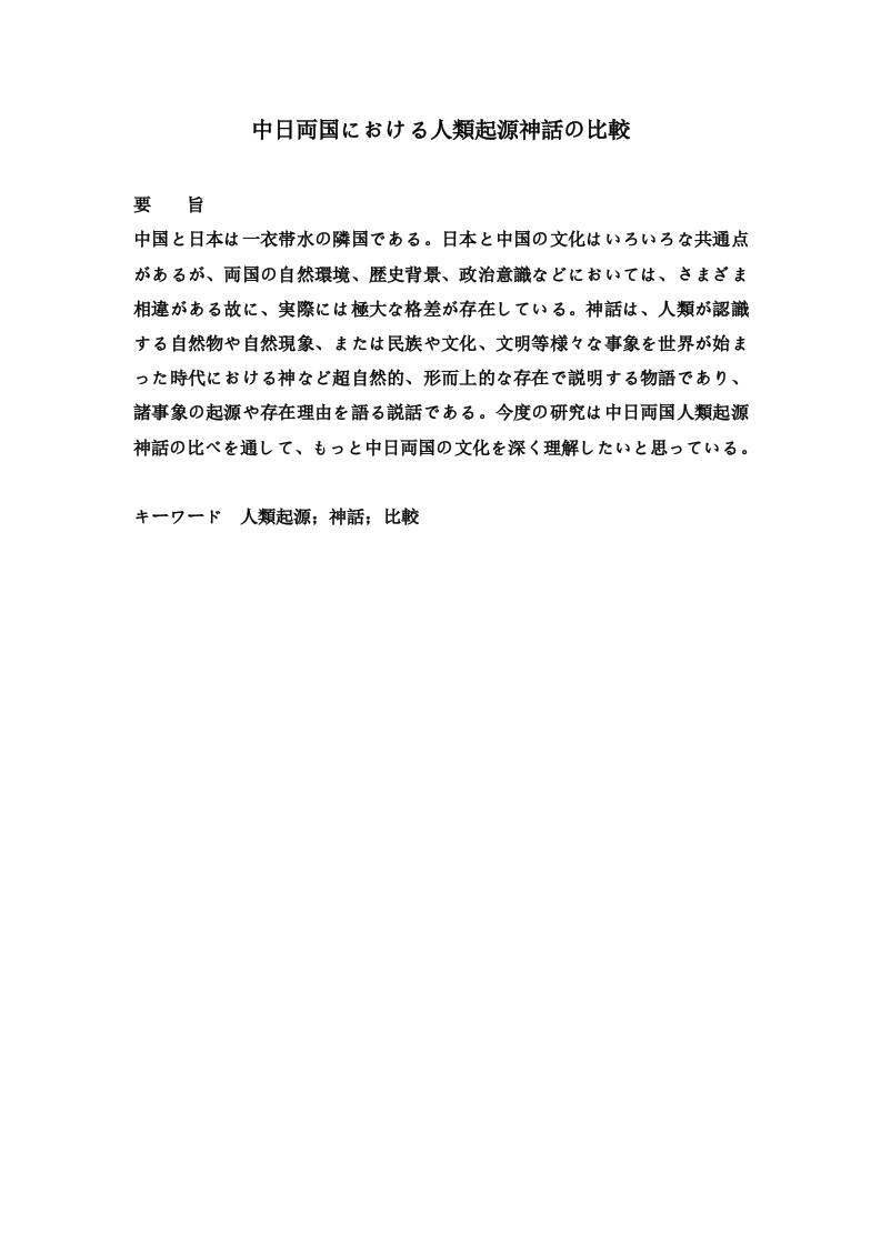 中日両国における人類起源神話の比較要旨中国と日本は一衣帯水の隣国である。日本と中国の文化はいろいろな共通点があるが、両国の自然環境、歴史背景、政治意識などにおいては、さまざま相違がある故に、実際には極大な格差が存在している。神話は、人類が認識する自然物や自然現象、または民族や文化、文明等様々な事象を世界が始まった時代における神など超自然的、形而上的な存在で説明する物語であり、諸事象の起源や存在理由を語る説話である。今度の研究は中日両国人類起源神話の比べを通して、もっと中日両国の文化を深く理解したいと思っている。キーワード人類起源;神話;比較目次要旨はじめに1人類起源神話21.1中国D人類起源神話21.1.1盤古一天地左開闢21.1.2女媧土で人間を作る31.2日本の人類起源神話31.2.1イザナミとイザナギ2中日人類起源神話)異同2.1共通点2.1.1混沌時期52.1.2独身神創世神話52.1.3夫婦二人で人間を作る62.2相違点62.2.1夫婦になる目的62.2.2万能の神62.2.3人性差别62.2.4男女差别73相違点が生まれた原因83.1地理環境)影響3.2民族文化)影響3.3政治色彩)影響9おわりに10参考文献謝辞はじめに神话,产生于古老的年代,有着丰富的文化内涵,有着浓郁的民族性,历来为文学家、史学家、人类学家、民族学家、民俗学家等所重视。在生产力极为低下的远古蒙味时期,人类的意识就已经开始发展,但仅限于简单的思维,面对天地万物和变化多端的自然现象,人们感到神奇莫测,不能理解。诸如天地开辟、人类起源、日月运行、风云雷电等等问题和现象,都使人们迷惑惊异。自然界的无穷威力甚至使人们恐惧不已。于是产生了对自然力量的崇拜,出现了冥冥之中有着支配自然力量的模糊观念。人们凭借自身狭隘的生活体验,通过想象和幻想,创造出人格化的神的形象:按照人们幼稚的思考,造作出神的故事,以解释自然现象,征服和支配自然力。这些故事在古代人民的口头代代流传,后世称之为神话。神话中充满神奇的幻想,它把原始劳动者的愿望和世界万物的生长变化都蒙上一层奇异的色彩。神话中神的形象,大多具有超人的力量,是原始人类的认识和愿望的理想化。它是根据原始劳动者的自身形象、生产状况和对自然力的理解想象出来的。狩猎经济比较发达的部落,所创造的神话人物大多与狩猎有关。农耕发达的部落所创造的神话人物多与农业有关。人以刀斧、弓箭为武器,神话中的人物也就变成以这种工具武装起来的英雄。神话中的主人公被想象为超人的,但有时也要遇到挫折和厄运。它反映了神话幻想的现实制约性。透过神话幻想的折光,从神话人物的作为和斗争,可以约略看到当时的人的作为和斗争。神话不仅以特殊的方式在一定程度上反映了远古时代的人类生活及历史发展进程,而且展现了远古人民的心灵世界,为探索远古时代的历史奥秘透露了许多可贵的信息,也为了解远古人民的意识、情感、精神、意志和性格提供了不少形象的资料,具有不朽的认识价值。不仅如此,古代神话还以自身的瑰丽壮伟给人们。各国都有自已独特的神话传说。神话的内容大多是描写人类起源,地理环境,社会制度的产生等,是人们丰富的想象力和智慧艺术的结晶,反映了各国的风俗文化。本文试以两国的起源神话故事为例,通过两国神话的比较,来探讨日本文化的特色。