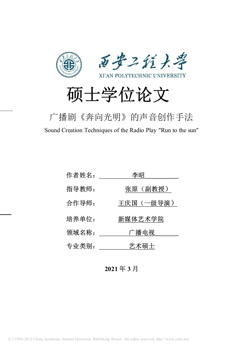 XI'AN POLYTECHNIC UNIVERSITY硕士学位论文广播剧《奔向光明》的声音创作手法Sound Creation Techniques of the Radio Play "Run to the sun"作者姓名:李昭指导教师:张原(副教授)合作导师:王庆国(一级导演)培养单位:新媒体艺术学院领域名称:广播电视专业类别:艺术硕士2021年3月(C)1994-2022 China Academic Journal Electronic Publishing House.All rights reserved,http://www.cnki.net学校代码10709中图分类号1235.3硕士学位论文广播剧《奔向光明》的声音创作手法Sound Creation Techniques of the Radio Play "Run to the sun"作者姓名:李昭学号:2018112035指导教师(校内):张原(副教授)合作导师(校外):王庆国学位类别(领域):艺术(广播电视)答辩委员会主任委员:张莉答辩日期:2021年6月3日(C)1994-2022 China Academic Joural Electronic Publishing House.All rights reserved,学位论文原创性声明(1)本人郑重声明:所呈交的学位论文是本人在导师的指导下,独立进行研究工作所取得的成果。除文中已经注明引用的内容外,本论文不包含任何其他个人或集体己经发表或撰写过的作品成果。对本文的研究做出重要贡献的个人和集体,均已在文中以明确方式标明。本人如违反上述声明,愿意承担因论文成果不实产生的法律纠纷,并接受学校因此对我的处理。学位论文作者(签名):学位论文原创性声明(2)本人声明:研究生所提交的本篇学位论文已经本人审阅,确系在本人指导下由该生独立完成的研究成果。本人如违反上述声明,愿意接受学校按照有关规定做出的任何处理。指导教师(签名):即卜Jo;年/月I日学位论文版权使用授权书本学位论文作者完全了解学校有关保留、使用学位论文的规定,同意学校保留并向国家有关部门或机构送交论文的复印件和电子版,允许论文被查阅和借阅。本人授权西安工程大学教学目的使用本学位论文,将全部或部分内容编入有关数据库进行检索,可以采用影印、缩印或扫描等复制手段保存和汇编本学位论文。口保密,在一年解密后适用本授权书。本学位论文属于保密,即或在年口2年后开放使用。洪9|年。月社日指导教师(签名):疯,年&月/日(C)1994-2022 China Academic Journal Electronic Publishing House.All rights reserved,http://www.cnki.net