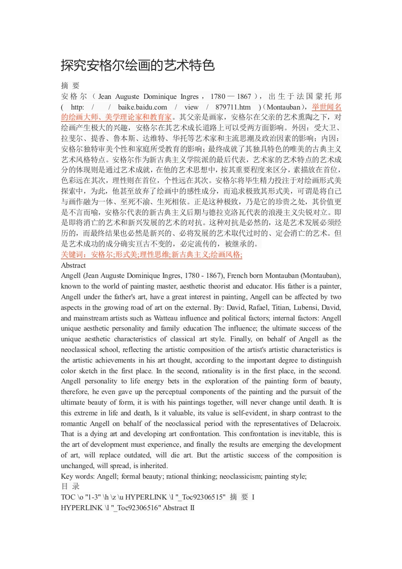 探究安格尔绘画的艺术特色摘要安格尔(Jean Auguste Dominique Ingres,1780一1867),出生于法国蒙托邦http:/baike.baidu.com/view/87971l.htm)(Montauban),举世闻名的绘画大师、美学理论家和教育家。其父亲是画家,安格尔在父亲的艺术熏陶之下,对绘画产生极大的兴趣,安格尔在其艺术成长道路上可以受两方面影响。外因:受大卫、拉斐尔、提香、鲁本斯、达维特、华托等艺术家和主流思潮及政治因素的影响:内因:安格尔独特审美个性和家庭所受教育的影响:最终成就了其独具特色的唯美的古典主义艺术风格特点。安格尔作为新古典主义学院派的最后代表,艺术家的艺术特点的艺术成分的体现则是通过艺术成就,在他的艺术思想中,按其重要程度来区分,素描放在首位,色彩远在其次,理性则在首位,个性远在其次。安格尔将毕生精力投注于对绘画形式美探索中,为此,他甚至放弃了绘画中的感性成分,而追求极致其形式美,可谓是将自己与画作融为一体、至死不渝、生死相依。正是这种极致,乃是它的珍贵之处,其价值更是不言而喻,安格尔代表的新古典主义后期与德拉克洛瓦代表的浪漫主义尖锐对立。即是即将消亡的艺术和新兴发展的艺术的对抗。这种对抗是必然的,这是艺术发展必须经历的,而最终结果也必然是新兴的、必将发展的艺术取代过时的、定会消亡的艺术。但是艺术成功的成分确实亘古不变的,必定流传的,被继承的。关键词:安格尔:形式美:理性思维:新古典主义:绘画风格:AbstractAngell (Jean Auguste Dominique Ingres,1780-1867),French born Montauban (Montauban),known to the world of painting master,aesthetic theorist and educator.His father is a painter,Angell under the father's art,have a great interest in painting,Angell can be affected by twoaspects in the growing road of art on the external.By:David,Rafael,Titian,Lubensi,David,and mainstream artists such as Watteau influence and political factors;internal factors:Angellunique aesthetic personality and family education The influence;the ultimate success of theunique aesthetic characteristics of classical art style.Finally,on behalf of Angell as theneoclassical school,reflecting the artistic composition of the artist's artistic characteristics isthe artistic achievements in his art thought,according to the important degree to distinguishcolor sketch in the first place.In the second,rationality is in the first place,in the second.Angell personality to life energy bets in the exploration of the painting form of beauty,therefore,he even gave up the perceptual components of the painting and the pursuit of theultimate beauty of form,it is with his paintings together,will never change until death.It isthis extreme in life and death,Is it valuable,its value is self-evident,in sharp contrast to theromantic Angell on behalf of the neoclassical period with the representatives of Delacroix.That is a dying art and developing art confrontation.This confrontation is inevitable,this isthe art of development must experience,and finally the results are emerging the developmentof art,will replace outdated,will die art.But the artistic success of the composition isunchanged,will spread,is inherited.Key words:Angell;formal beauty;rational thinking;neoclassicism;painting style;目录HYPERLINK \I Toc92306516"Abstract IIHYPERLINK1"Toc92306517"目录ⅢHYPERLINK1"Toc92306518"一、安格尔生平及其背景简述1HYPERLINK \I"Toc92306519"(一)安格尔背景简述1HYPERLINK1"Toc92306520”二、安格尔绘画的艺术特色6HYPERLINK1"Toc92306521"(一)平整的画面6HYPERLINK1"Toc92306522"(二)画面构图7HYPERLINK1"Toc92306523"(三)画面线条7HYPERLINK1"Toc92306524"(四)画面色彩7HYPERLINK1"Toc92306525"三、代表绘画作品简析8HYPERLINK1"Toc92306526"四、安格尔绘画对现代绘画的影响10HYPERLINK1"Toc92306527"(一)安格尔的素描和色彩、精神10HYPERLINK1"Toc92306528"结语11HYPERLINK1"Toc92306529"参考文献11HYPERLINK \I"Toc92306530"谢辞12一、安格尔生平及其背景简述(一)安格尔背景简述1.家庭背景・・・安(Jean Auguste Dominique Ingres).1780-1867出于法国蒙托邦(Montauban),其家庭是并不算富裕的,中产阶级程度,母亲是皇宫假发是的女儿,父亲约瑟夫·安格尔是蒙托榜皇家美术院院士,擅长绘画雕塑,但其成就平平。安格尔是长子,除安格尔外,其父母还有其他五个子女。处在这样浓郁的艺术氛围中,充满艺术气息的环境里,激发了其潜藏在骨子里的艺术气息,使其从小就对绘画产生兴趣,安格尔的绘画艺术之路萌芽,为其后期艺术成就的形成奠定了基础。2.社会背景安格尔生活在法国,十八世纪末之十九世纪中后期,安格尔处在法国大革命下的波旁王朝复辟变动时期,社会动荡不安,充满危机感。国家上层社会内部矛盾,加上外有欧洲列强威胁。因内外部矛盾,使得国家经济萧条。这样的乱世之下,对安格尔有着一定影响。3.安格尔绘画特色形成原因任何艺术家风格的形成都到社会因素和传统因素的影响。社会思潮决定了主流艺术方向,而艺术家自己艺术追求与主流方向的逆顺,则在一定程度上影响着其是否取得成功的难易程度,与主流方向相适应则相对容易成功,并被社会基本认可,其与之相反,则取得成功就会更难,安格尔则属于后者,但与之不同的是安格尔在生前依然在艺术界独领风骚,安格尔的绘画具有其独特的艺术特点,思想。与主流艺术相违背,创造出唯美感的艺术,安格尔去世后的绘画艺术有很高的启蒙价值。安格尔是保守的,但是也有创新的一面,评判安格尔分析其绘画成因要从其生活的社会环境和个人心理来分析。(1)历史原因①西方传统文化的影响古希腊毕达
