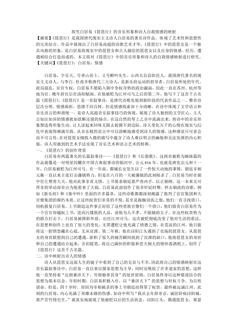 探究白居易《琵琶行》的音乐形象和诗人自我情感的映射【摘要】《琵琶行》是我国唐代现实主义诗人白居易的著名诗作品,体现了艺术性和思想性的完美结合。作品中展现出了白居易高超的诗歌艺术才华。《琵琶行》中的琵琶女是一个独具风格的形象,是白居易将现实中的琵琶女和古人描绘的琵琶女以及自身的情感、经历、遭遇相结合打造而成的。本文将对《琵琶行》中的音乐形象和诗人的自我情感映射进行研究。【关键词】《琵琶行》:白居易:情感白居易,字乐天,号香山居士,又号醉吟先生,山西太谷县阳邑人,我国唐代著名的现实主义诗人,与李白、杜甫并称唐代三大诗人,是新乐府运动的倡导者。白居易所处的年代、政局混乱,宦官专权,白居易不愿陷入朝中争权夺势的政治漩涡,因此一直在苏州、杭州等地为官。晚年辞官后在洛阳赋闲。在他被贬为江州司马之后的第二年,他写下了这首千古名篇《琵琶行》。《琵琶行》是一首叙事诗,是唐代诗歌发展到新阶段的代表作品之一。整首诗层次分明、情感曲折,思绪千回百转,但是情感线索却十分清晰。在诗中体现了文学语言和音乐语言的和谐统一,是诗人高超音乐叙事技巧的体现,展现了诗人独到的文学匠心。主人公如泣如诉的情感犹如欲断还留的场合,在这自然的琴上之音中流淌出来,将诗中的音乐形象塑造得形象生动。让人读起来回味无限去捉摸不到边际。诗人变化万千的心情在现实与幻化中表现得淋漓尽致。从音乐般的语言中可以清晰地感受到诗人的情感,这种感觉只可意会而不可言传。在对琵琶女细致入微的描写中蕴含了诗人难以明言的幽恨和无法发泄的内心积郁,诗人用独到的艺术手法实现了音乐艺术和语言艺术的转换。一、《琵琶行》的创作背景白居易有两篇著名的长篇叙事诗一一《琵琶行》和《长恨歌》,这两首被称为姊妹篇的作品就像是一对明星闪耀在中国古典叙事诗的银河中。公元816年,也就是唐宪宗元和十一年,白居易被贬为江州司马。在一年前,都城长安发生以了一件惊天动地的事情,朝廷宰相元衡一直以来主张打击藩镇势力,但是在六月的一天被藩镇的此刻暗杀了。白居易当时在朝中任左赞善大夫,他对此事非常义愤,上书要求朝廷要严查凶手,以正朝纲。这一本来无可厚非的举动却差点为他惹来了大祸。白居易此前创作了很多针砭时弊、抨击朝政的诗歌,例如《新乐府》和《秦中吟》里面的许多篇章,这些诗歌都都深刻揭露了批判了宦官集团和大官僚集团的腐朽本质。让这些权贵们非常的不悦、甚至是扼腕切齿之恨,他们一直寻找借口,伺机报复白居易。上书朝廷这件事正好给了这些贵族官僚们一个借口,他们指责白居易作为一个宫官却越权上书,进而污蔑他的人品,说他为人不孝,不能捕助太子。在这些权贵势力的联合打击下,白居易被降职外放,出任江州司马。这次被贬彻底改变了他对生活的看法,在思想和创作上也有了很大的变化,无罪遭贬让他充满了愤懑之情,在荒凉的江州,他只能将这一腔愤怒藏在心底,无从宣泄。第二年秋,他在浔阳江头遇到了卖场的琵琶女,从琵琶女的身世联想到自己的遭遇,淤积了很久的痛苦瞬间找到了宣泄的缺口,他将琵琶女的身世和自己的遭遇结合起来,含泪提笔,将自己满怀的积郁和悲天悯人的情怀泼洒纸上,创作了《琵琶行》这首千古名篇。二、诗中映射出诗人的情感诗人从琵琶女这面人生的镜子中看到了自己的无奈与不幸,因此将自己的情感映射在这首长篇叙事诗中,白居易一直以来以儒家思想为主导,同时还吸收了许多道家的思想,这样他一直坚持着“达则兼济天下,穷则独善其身”的处世原则,白居易终身以这种儒道结合的思想为基本信念。年轻时期,白居易积极入仕,以“兼济天下”的思想与奸权斗争,为百姓请命。但是,四十岁时,却因为宰相被杀的事上书朝廷而得罪了权贵,最终被远谪江州。此刻的白居易,内心充满了英雄末路的伤感。如诗中所写“我从去年辞帝京,谪居卧病浔阳城,黄芦苦竹绕宅生。”就真实地展现了他被贬以后的生活状态。浔阳江头,偶遇琵琶女,那瑟瑟琴声让他沦落天涯的感觉更加清晰,最后一句“江州司马青衫湿”,湿的不仅仅是诗人的衣襟,更是那备受折磨的心灵。宫场混乱,社会动荡,满怀的激情和一生的抱负化作东流之水,化成了泡影。他的悲痛来源于理想的落空和生命价值的缺失。对于自己的仕途不顺,白居易非常清楚其中的根由所在。于是从被贬江州开始,他选择了另一种生活状态,那就是“独善其身”,与其说他是乐天知命、明哲保身,不如说这是命运的无奈。在《琵琶行》中,诗人为民请命,敢于直谏的形象愈显丰满。“同是天涯沦落人”,这种沦落天涯的遭遇让他心潮澎湃,不禁泪洒青衫。在这种无奈中,又处处展现出诗人对生命的珍视,对生命价值的追求以及对正义的渴望。诗中始终交融叠合着诗人的心声和琵琶女的琴声,因此,理解、赏听全诗是两个人之间对于积郁的心情的宣泄,对于满怀忧愁与怨恨的释放。在相互尊重、爱护与关心的前提下,自然地释放着心情,诗人以“同是天涯沦落人”的情怀,发出了“相逢何必曾相识”的感叹。在这里,不仅有对于琵琶女遭遇的悲悯,也有着对于生活不幸者的博爱与关怀,更有着相似遭遇而引发的情感共鸣。琵琶女从倡家女到商人妇的遭遇激发了诗人的同