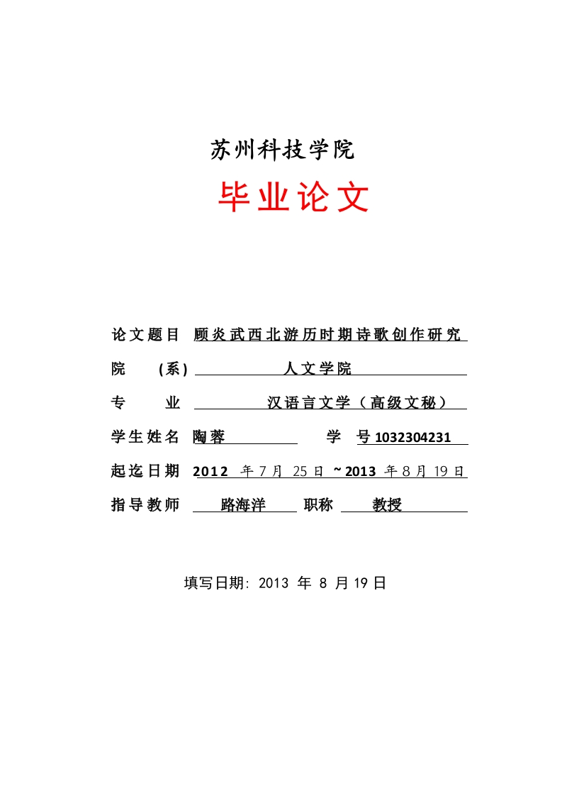 苏州科技学院毕业论文论文题目顾炎武西北游历时期诗歌创作研究院(系)人文学院专业汉语言文学(高级文秘)一学生姓名陶蓉学号1032304231起迄日期2012年7月25日~2013年8月19日指导教师路海洋职称教授填写日期:2013年8月19日苏州科技学院毕业论文顾炎武西北游历时期诗歌创作研究摘要:顾炎武出生于有着经世致用家风的官宦家庭,自小饱读经世之学,而园母的言传身教,乃至最终的殉国遗训,奠定了亭林的思想根基,使他终身立身严谨,遗而未出。同时,明代旅游之风大盛,出现了如徐霞客等一大批的旅游家,易代之际遗民们发扬这一传统,顾炎武即为他们中的一个。欲有所作为又不能在清朝为官,亭林选择游历这条道路,从早期的联络抗清义士到晚年的拜访遗民学者,亭林正是在旅游中关注现实,著述不休,实现了他在乱世异代中的“为”。他的这种“为”当中,文学创作颇丰,是其文学创作中的精华部分,体现了他的最高水平。他的北游诗作当中,主要有咏史诗、唱和诗等,浸透了浓浓的启蒙思想,尤其是“天下兴亡匹夫有责”的观念深入人心,其对诗歌理论的探究,也对清诗产生了非常重要的影响。关键词:顾炎武,北游,诗歌Abstract:Gu yanwu,bom in a family trait of the son of a family,since childhood professionalleaming,studying and SiMu precept,and even end up being teachings,laid the thought foundationof ting Lin,an exact description:his life,but not out.At the same time,tourism wind sheng in theMing dynasty,the countrymen,such as xu xiake,a large number of adherents of easy generationof carrying forward the tradition,gu yanwu is one of them.To do something without official qingcourt,ting Lin travel this path choice,from the early contact KangQing adherents of visitingscholar just to old age,ting Lin is in the tourism focus on reality,writings,realized his gone withdifferent generations in the "to".His "for",the literary creation,is the essence part of his literarycreation,reflects the highest level.Northward of his poems,mainly on history,changhe,soak thestrong enlightenment thoughts,especially the fortunes of a "the world rise and fall"concept ofthorough popular feeling,for the study of poetry theory,also the very important influence on qingpoetry.Keywords:gu yanwu,northward,poetry目录一、顾炎武的北游背景11、避难…2、寻求经世治国之道…二、顾炎武北游文学创作的主要内容331、咏古人…2、咏古迹…三、顾炎武的诗歌创作的主要艺术特色