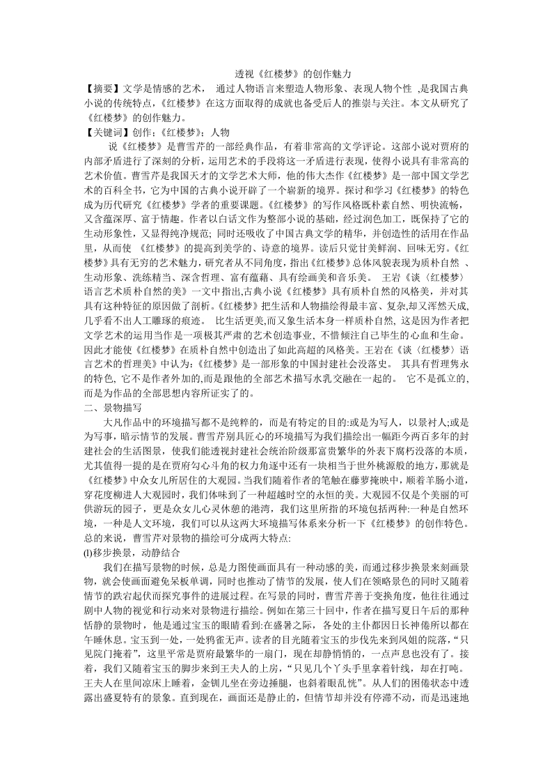 透视《红楼梦》的创作魅力【摘要】文学是情感的艺术,通过人物语言来塑造人物形象、表现人物个性,是我国古典小说的传统特点,《红楼梦》在这方面取得的成就也备受后人的推崇与关注。本文从研究了《红楼梦》的创作魅力【关键词】创作:《红楼梦》:人物说《红楼梦》是曹雪芹的一部经典作品,有着非常高的文学评论。这部小说对贾府的内部矛盾进行了深刻的分析,运用艺术的手段将这一矛盾进行表现,使得小说具有非常高的艺术价值。曹雪芹是我国天才的文学艺术大师,他的伟大杰作《红楼梦》是一部中国文学艺术的百科全书,它为中国的古典小说开辟了一个崭新的境界。探讨和学习《红楼梦》的特色成为历代研究《红楼梦》学者的重要课题。《红楼梦》的写作风格既朴素自然、明快流畅,又含蕴深厚、富于情趣。作者以白话文作为整部小说的基础,经过润色加工,既保持了它的生动形象性,又显得纯净规范:同时还吸收了中国古典文学的精华,并创造性的活用在作品里,从而使《红楼梦》的提高到美学的、诗意的境界。读后只觉甘美鲜润、回味无穷。《红楼梦》具有无穷的艺术魅力,研究者从不同角度,指出《红楼梦》总体风貌表现为质朴自然、生动形象、洗练精当、深含哲理、富有蕴藉、具有绘画美和音乐美。王岩《谈(红楼梦》语言艺术质朴自然的美》一文中指出,古典小说《红楼梦》具有质朴自然的风格美,并对其具有这种特征的原因做了剖析。《红楼梦》把生活和人物描绘得最丰富、复杂,却又浑然天成,几乎看不出人工雕琢的痕迹。比生活更美,而又象生活本身一样质朴自然,这是因为作者把文学艺术的运用当作是一项极其严肃的艺术创造事业,不惜倾注自己毕生的心血和生命。因此才能使《红楼梦》在质朴自然中创造出了如此高超的风格美。王岩在《谈〈红楼梦》语言艺术的哲理美》中认为:《红楼梦》是一部形象的中国封建社会没落史。其具有哲理隽永的特色,它不是作者外加的,而是跟他的全部艺术描写水乳交融在一起的。它不是孤立的,而是为作品的全部思想内容所证实了的。二、景物描写大凡作品中的环境描写都不是纯粹的,而是有特定的目的:或是为写人,以景衬人:或是为写事,暗示情节的发展。曹雪芹别具匠心的环境描写为我们描绘出一幅距今两百多年的封建社会的生活图景,使我们能透视封建社会统治阶级那富贵繁华的外表下腐朽没落的本质,尤其值得一提的是在贾府勾心斗角的权力角逐中还有一块相当于世外桃源般的地方,那就是《红楼梦》中众女儿所居住的大观园。当我们随着作者的笔触在藤萝掩映中,顺着羊肠小道,穿花度柳进人大观园时,我们体味到了一种超越时空的永恒的美。大观园不仅是个美丽的可供游玩的园子,更是众女儿心灵休稳的港湾,我们这里所指的环境包括两种:一种是自然环境,一种是人文环境,我们可以从这两大环境描写体系来分析一下《红楼梦》的创作特色。总的来说,曹雪芹对景物的描绘可分成两大特点:①移步换景,动静结合我们在描写景物的时候,总是力图使画面具有一种动感的美,而通过移步换景来刻画景物,就会使画面避免呆板单调,同时也推动了情节的发展,使人们在领略景色的同时又随着情节的跌宕起伏而探究事件的进展过程。在写景的同时,曹雪芹善于变换角度,他往往通过剧中人物的视觉和行动来对景物进行描绘。例如在第三十回中,作者在描写夏日午后的那种恬静的景物时,他是通过宝玉的眼睛看到:在盛暑之际,各处的主仆都因日长神倦所以都在午睡休息。宝玉到一处,一处鸦雀无声。读者的目光随着宝玉的步伐先来到凤姐的院落,“只见院门掩着”,这里平常是贾府最繁华的一扇门,现在却静悄悄的,一点声息也没有了。接着,我们又随着宝玉的脚步来到王夫人的上房,“只见几个丫头手里拿着针线,却在打吨。王夫人在里间凉床上睡着,金钏儿坐在旁边捶腿,也斜着眼乱恍”。从人们的困倦状态中透露出盛夏特有的景象。直到现在,画面还是静止的,但情节却并没有停滞不动,而是迅速地向前进展着接着文章又来了一个紧急刹车,写了一段王夫人一手制造出来金钏儿投井的事,使人们又从昏昏欲睡的状态中清醒过来,使文章达到有张有驰,动静结合的效果。在这里,作者描绘出一幅夏日骄阳图,但却是用人物的困倦感来体现的,由此可见曹雪芹景物描写的别具匠心。(2)美丑对比,以景衬情老舍说:“写景的目的不完全在审美上,美不美是次要的问题,最要紧的是写出一个‘景来。”的确,美的景物要写,丑的也要写,美丑对照,美者愈美,丑者愈丑。中国传统的描写景物的方法当中经常是运用对比映衬,渲染烘托的手法,使两相对应的事物在对方的衬托下更显出各自的特色,也使作者的情感得以更好的渲泄,从而更好地达到情景浑然一体的境界。比如作品对于潇湘馆前后景致的描写就可以体现美丑对比,情景相生的艺术手法。在黛玉还在时,那里是“竹影参差,苔痕浓淡,”虽然是幽静了点,但是毕竞还有阔叶芭蕉,还有雅淡的梨花,还有那只调皮的鹦哥,那时候的潇湘馆还是充满着盎然的生机。然而没有了黛玉的潇湘馆就没有了以前那种蓬勃的生机了,这时候的潇湘馆满眼望去都是凄凉的景色,花木枯萎,人去楼空,剩下的只有那一大片洒满斑斑泪痕的满湘竹了,给人以“昔人己成黄鹤去,白云千载空
