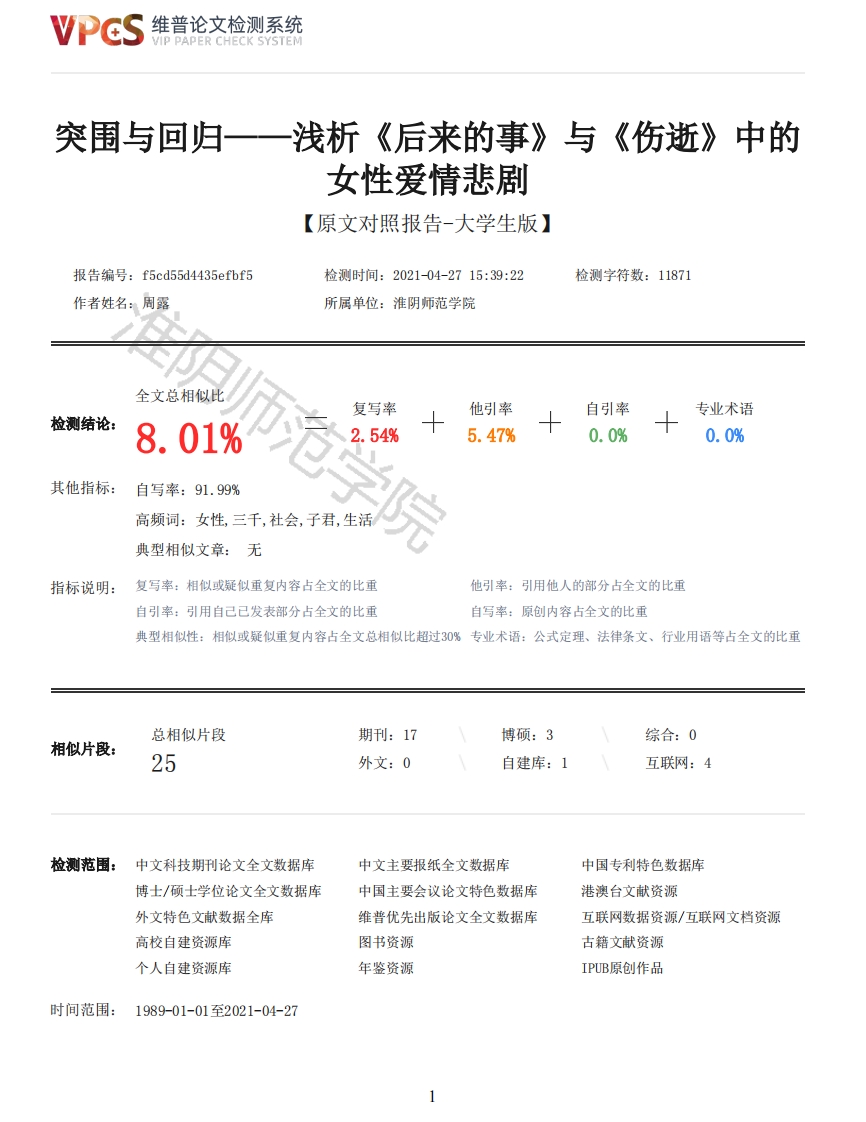 维普论文检测系统/IP PAPER CHECK SYSTEM突围与回归一一浅析《后来的事》与《伤逝》中的女性爱情悲剧【原文对照报告-大学生版】报告编号:f5cd55d4435efbf5检测时间:2021-04-2715:39:22检测字符数:11871作者姓名:周露所属单位:淮阴师范学院全文总相似比检测结论:8.01%其他指标:自写率:91.99%学院复写率他引率自引率专业术语2.55.47%0.0%0.0%高频词:女性,三千,社会,子君,生活典型相似文章:无指标说明:复写率:相似或疑似重复内容占全文的比重他引率:引用他人的部分占全文的比重自引率:引用自己已发表部分占全文的比重自写率:原创内容占全文的比重典型相似性:相似或疑似重复内容占全文总相似比超过30%专业术语:公式定理、法律条文、行业用语等占全文的比重总相似片段期刊:17博硕:3综合:0相似片段:25外文:0自建库:1互联网:4检测范围:中文科技期刊论文全文数据库中文主要报纸全文数据库中国专利特色数据库博士/硕士学位论文全文数据库中国主要会议论文特色数据库港澳台文献资源外文特色文献数据全库维普优先出版论文全文数据库互联网数据资源/互联网文档资源高校自建资源库图书资源古籍文献资源个人自建资源库年鉴资源IPUB原创作品时间范围:1989-01-01至2021-04-27维普论文检测系统VIP PAPER CHECK SYSTEM原文对照颜色标注说明:■自写片段■复写片段(相似或疑似重复)引用片段(引用)■专业术语(公式定理、法律条文、行业用语等)毕业论文学生姓名周露学号0111170046院属文学院专业汉语言文学(师范)班级2017(3)题目突围与回归一一浅析《后来的事》与《伤逝》中的女性爱情悲剧指导老师赵峻职称副教授2020年月毕业论文独创性声明本人郑重声明:本论文是我个人在导师指导下进行的研究工作及取得的研究成果。本论文除引文外所有实验、数据和有关材料均是真实的。尽我所知,除了文中特别加以标注和致谢的地方外,论文中不包含其他人已经发表或撰写过的研究成果。作者签名:日期:摘要:夏目漱石与鲁迅两位伟大的作家用冷静的笔触对当时风云变幻的社会提出自己的观点,对女性问题进行偏僻入里的探讨。通过该论文的写作对夏目漱石《后来的事》与鲁迅《伤逝》中的女性爱情悲剧进行分析,将三千2维普论文检测系统VIP PAPER CHECK SYSTEM代与子君的形象放在“突围与回归”这个框架下进行解读与阐释,力图考察探究处于历史转型时期的中日女性在不同境遇下走向爱情悲剧的过程,以探求两位女性从突围走向回归的原因,并聚焦两部作品深入发掘两位作家是采用何种策略书写女性生存问题的。Abstract:Natsume Soseki and Lu Xun,two great writers,put forward their own views on thechanging society at that time with calm brushwork,and discussed women's problems in a remote way.This paper analyzes the female love tragedies in Natsume Soseki's later affairs and Lu Xun'smourning for the past,interprets and interprets the images of three thousand generations and Zijununder the framework of "breakthrough and return",and tries to explore the process of Chinese andJapanese women's love tragedies in different situations in the period of historical transformation,In order to explore the reasons for the two women from the breakthrough to return,and focus on thetwo works,in-depth explore what strategies the two writers used to write about women's survival.Keywords:Love tragedy:What Happened Later:Regret for the Past;Natsume Soseki:Lu Xun目录二(一)伦理禁忌的突围者……(一)现实世界与精神追求的疏离………(二)独立人格虚无的依附心理……9四聚焦两部作品思考两位作家的女性形象塑造……4参考文献引言夏目漱石与鲁迅是在落寞家庭中成长起来的,夏目漱石奔走于养父与生父之间,他的坎坷经历一直延续至出国留学:而鲁迅在父亲病重时,多次出入药房、店铺,遭受冷眼,饱尝生活艰辛。可以说,生活经历让他们对世态人情有了更深刻的认识,对社会有了更敏锐的洞察力。他们在青年时代都受到外来文化的熏陶,与本土文化融会贯通,在面对明治维新和“五四”运动时有自己深刻的看法。在社会转型阶段,知识分子吸引了很多文学创作的目光,鲁迅与夏目漱石也不例外,他们对知识分子的爱情、思想、生活进行了冷静客观的观照,描绘了处于这一阶段的知识分子的探索与迷茫。知识分子是推动社会变革的重要力量,起到了极大的作用。这些知识分子中,大部分都是选择与旧家庭、旧社会对立,从而走上成长道路的。在这群知识分子中,女性形象尤其引人注目,她们敢于挣脱传统的桎梏,乐于接受新思想的熏陶。众所周知,中日两国妇女在封建传统的藩篱下没有话语权,是男性的附属品,她们更多的被认为是传宗接代的工具。但是在日本明治维新与中国“五四”运动的浪潮下,她们逐步觉醒,渴望摆脱各种束缚,主动追求爱情、追求男女平等,她们拥有强烈的自我意识。但是追求自由、追求爱情这一过程是坎坷而又漫长的,多数难逃悲剧命运。夏目漱石与鲁迅的文学创作中,“女性”占据一定的比重,她们渴望超越现实却又举步维艰,体现着女性在传统与现代交织的复杂与矛盾。《后来的事》与《伤逝》这两部作品充分展现了女性在追求爱情过程中的挣扎与抗争,三千代与子君通过“私奔”的形式进行不同意义上的突围,最终难逃悲剧命运。二两种突围者爱情,是生命中最美妙的情感之一,对女性来说更是如此。夏目漱石笔下的三千代与鲁迅笔下的子君充分表现了女性面对爱情