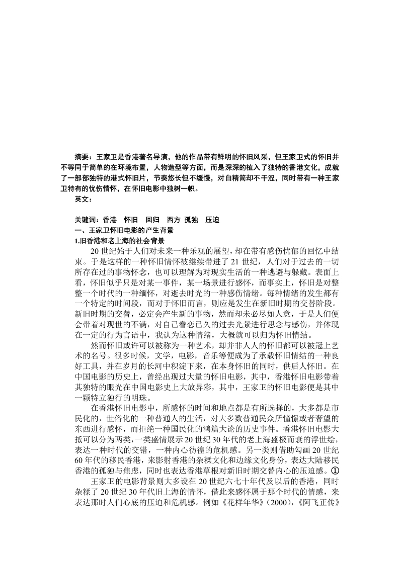 摘要:王家卫是香港著名导演,他的作品带有鲜明的怀利旧风采,但王家卫式的怀旧并不等同于简单的在环境布置,人物造型等方面,而是深深的植入了独特的香港文化,成就了一部部独特的港式怀旧片,节奏悠长但不缓慢,对白精简却不干涩,同时带有一种王家卫特有的忧伤情怀,在怀旧电影中独树一帜。英文:关键词:香港怀旧回归西方孤独压迫一、王家卫怀旧电影的产生背景1.旧香港和老上海的社会背景20世纪始于人们对未来一种乐观的展望,却在带有感伤忧郁的回忆中结束。于是这样的一种怀旧情怀被继续带进了21世纪,人们对于过去的一切所存在过的事物怀念,也可以理解为对现实生活的一种逃避与躲藏。表面上看,怀旧似乎只是对某一事件,某一场景进行感怀,而事实上,怀旧是对整整一个时代的一种缅怀,对逝去时光的一种感伤情绪。每种情绪的发生都有一个特定的时间段,而对于怀旧而言,则应是发生在新旧时期的交替阶段。新旧时期的交替,必定会产生新的事物,然而却未必尽如人意,于是人们便会带着对现世的不满,对自己眷恋已久的过去光景进行思念与感伤,并体现在一定的行为言语中,我认为这种情绪,大概就可以归为怀旧情结。然而怀旧或许可以被称为一种艺术,却并非人人的怀旧都可以被冠上艺术的名号。很多时候,文学,电影,音乐等便成为了承载怀旧情结的一种良好工具,并在岁月的长河中积淀下来,在本身怀旧的同时,供后人怀旧。在中国电影的历史上,曾经出现过大量的怀旧电影,其中,香港怀旧电影带着其独特的眼光在中国电影史上大放异彩,其中,王家卫的怀旧电影便是其中颗特立独行的明珠。在香港怀旧电影中,所感怀的时间和地点都是有所选择的,大多都是市民化的,世俗化的一种普通人的生活,对大多数普通民众所憧憬或者奢望的东西进行感怀,而拒绝一种国民化的鸿篇大论的历史事件。香港怀旧电影大抵可以分为两类,一类盛情展示20世纪30年代的老上海盛极而衰的浮世绘,表达一种时代的交错,一种内心仿徨的危机感。另一类则借助勾画20世纪60年代的移民香港,来影射香港的杂糅文化和边缘文化身份,表达大陆移民香港的孤独与焦虑,同时也表达香港草根对新旧时期交替内心的压迫感。①王家卫的电影背景则大多设在20世纪六七十年代及以后的香港,同时杂糅了20世纪30年代旧上海的情怀,借此来感怀属于那个时代的情感,来表达那时人们心底的压迫和危机感。例如《花样年华》(2000),《阿飞正传》(1990),《2046》(2004),《重庆森林》(1994)在1949年以后,联合国对新中国实行贸易禁运,再加上“六七风暴”,内地的大陆文化对香港文化的影响简直微乎其微,然而真正让香港崛起的是20世纪六七十年代的资本主义工业化进程,让香港的迅速进入了资本主义社会,②在这样的工业化进程中,由于香港的开放,使得香港逐渐形成了一种⑧香港意识,这种香港意识是独特的,是综合了英国这种外来文化和中华民族文化的一种意识,但是又独立于两者之外。具体而言,“本地的生活方式急速偏离台湾和中国大陆的差异...相当含糊的本土意识开始在香港抬头。…人种言论被更富弹性,意味含糊,更富包容性的通俗本土文化意识所取代了。”③香港人似乎有着一种与生俱来的优越感,他们生来就享受这种优越的生活,至少是优于大陆甚至台湾的。然而香港的回归却对香港造成了一定的冲击,对许多港人的精神生活造成冲击,孤独,焦虑,恐慌种种情绪纷纷降临,危机感从四面八方袭来,很多人习惯了达到顶峰的香港意识,对这个即将逝去的旧香港,过去的文化习惯成为了众多港人难以释怀的怀旧情结。这种“九七”回归对港人造成的压迫和焦虑感,在王家卫的电影中有着极大的体现。2.香港回归带来的怀旧风潮香港回归所带来的压迫和焦虑的情绪,似乎成为了王家卫怀旧电影中的种独特而又隐晦的怀旧对象,它潜藏在主人公的行为之下,却又真实存在。王家卫把这种情绪隐藏在时间里,在他的电影中,时间是一个很重要的符号,王家卫对时间,对数字有一种近乎痴狂的迷恋,对时间的描述相当精确,比如“1960年4月16日下午3点之前的一分钟,你跟我在一起。我会记得这一分钟。这是一个事实,我们改变不了,因为已经过去了。”(《阿飞正传》)这句台词深入人心,阐明了记忆和时间的矛盾:即使记忆想挽留住过往的时间,可是时间还是转瞬即逝的,因为时间的本质是不可挽留的。④在电影《阿飞正传》中,主人公阿飞是上海移民,为了寻找生母而流落南洋,片中的人①们都居无定所,为生活四处奔波,始终为周围身边的人的离去而惶惶不安,都处于巨大的生活压力中。电影中把阿飞比作一只无脚鸟,这种鸟生来没有脚,它只能不停的飞,累了就在风中睡觉,因为没有脚它必须不停地飞,只到死亡的时候,才能落地,那是它一辈子唯一一次落地。电影中的人们,都像这只无脚鸟一样,麻木的生活,不知道自己何去何从。无脚鸟的悲剧在于,它永远都不能拥有一个安定的生活,只有死亡才能终止漂泊的一生。《阿飞正传》体现了王家卫所关注的一些问题,漂泊的命运,情感的疏离,孤独,忘却,被忘却的恐惧。在《花样年华》《重庆森林》中,种种与时间有关的道具也充斥着屏幕,通过日常生活中与时间相关的种种道具,例如墙面挂钟,腕表,闹钟,座钟等,以及擦拭挂钟,询问现在几点钟的生活细节以及《阿飞正传