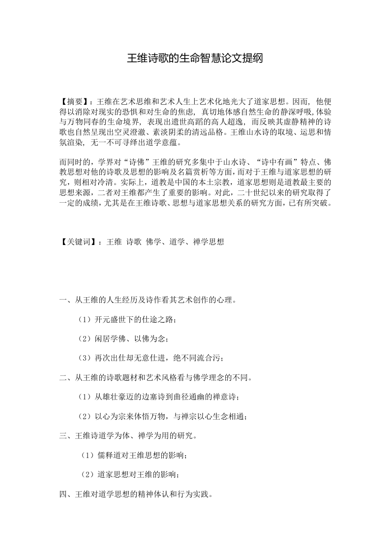 王维诗歌的生命智慧论文提纲【摘要】:王维在艺术思维和艺术人生上艺术化地光大了道家思想。因而,他便得以消除对现实的恐惧和对生命的焦虑,真切地体感自然生命的静深呼吸,体验与万物同春的生命境界,表现出遗世高蹈的高人超逸,而反映其虚静精神的诗歌也自然呈现出空灵澄澈、素淡阴柔的清远品格。王维山水诗的取境、运思和情氛渲染,无一不可寻绎出道学意蕴。而同时的,学界对“诗佛”王维的研究多集中于山水诗、“诗中有画”特点、佛教思想对他的诗歌及思想的影响及名篇赏析等方面,而对于王维与道家思想的研究,则相对冷清。实际上,道教是中国的本土宗教,道家思想则是道教最主要的思想来源,二者对王维都产生了重要的影响。对此,二十世纪以来的研究取得了一定的成绩,尤其是在王维诗歌、思想与道家思想关系的研究方面,已有所突破。【关键词】:王维诗歌佛学、道学、禅学思想一、从王维的人生经历及诗作看其艺术创作的心理。(1)开元盛世下的仕途之路:(2)闲居学佛、以佛为念:(3)再次出仕却无意仕进,绝不同流合污:二、从王维的诗歌题材和艺术风格看与佛学理念的不同。(1)从雄壮豪迈的边塞诗到曲径通幽的禅意诗:(2)以心为宗来体悟万物,与禅宗以心生念相通:三、王维诗道学为体、禅学为用的研究。(1)儒释道对王维思想的影响:(2)道家思想对王维的影响:四、王维对道学思想的精神体认和行为实践。(1)虚静精神乃王维的生命本色:(2)从王维人生的三个阶段看他的道学诗风:(3)庄子的“虚静”精神使王维的道学慧根和虚静天分得到充分解放:五、小结参考文献:[1]李泽厚.中国思想史论[M0.合肥:安徽文艺出版社.1999.[2]徐复观.中国艺术精神》[M0.沈阳:春风文艺出版社.1987.[3]陈炎.李红春.儒释道背景下的唐代诗歌[].北京:昆仑出版社.2003.[4](清)董浩.全唐文[M0.中华书局[5](唐)王维.王维集校注[M们.陈铁民.校注中华书局[6]郭绍虞.清诗话续编[M].上海古籍出版社