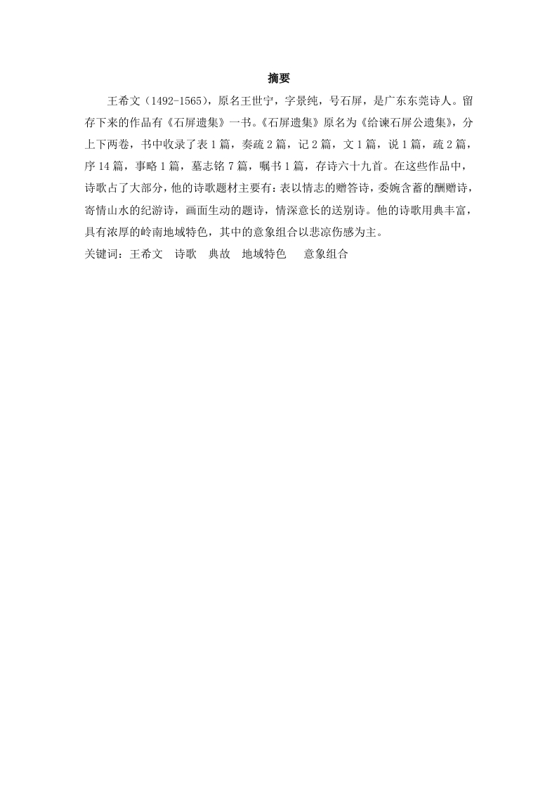 摘要王希文(1492-1565),原名王世宁,字景纯,号石屏,是广东东莞诗人。留存下来的作品有《石屏遗集》一书。《石屏遗集》原名为《给谏石屏公遗集》,分上下两卷,书中收录了表1篇,奏疏2篇,记2篇,文1篇,说1篇,疏2篇,序14篇,事略1篇,墓志铭7篇,嘱书1篇,存诗六十九首。在这些作品中,诗歌占了大部分,他的诗歌题材主要有:表以情志的赠答诗,委婉含蓄的酬赠诗,寄情山水的纪游诗,画面生动的题诗,情深意长的送别诗。他的诗歌用典丰富,具有浓厚的岭南地域特色,其中的意象组合以悲凉伤感为主。关键词:王希文诗歌典故地域特色意象组合AbstractWang xiwen (1492-1565),formerly known as wang shining,aliasjingchun,alias shi ping,was born in dongguan,guangdong province.Theextent works include the stone screen remains."Shi ping posthumouscollection"originally called "to remonde shi ping posthumous collection",divided into two volumes,a total of table 1,play two sparse,write two,a text,say one,sparse two,preface 14,a brief,epitaph 7,a book,save69 poems.Among these works,poetry accounts for the majority,and hispoetry themes mainly include:giving poems as gifts of affection,payingpoems as gifts of euphemism and implication,touring poems expressingfeelings for mountains and rivers,vivid inscriptions on pictures,andlong farewell poems with deep feelings.His poems are rich in allusionswith strong lingnan regional characteristics,among which the combinationof images is mainly sad and sad.Keywords:wang xiwen shiping collection allusions regionalcharacteristics image combination目录引言王希文诗歌的题材内容(一)语言质朴的赠答诗1(二)含蓄委婉的酬赠诗2(三)寄情山水的纪游诗4(四)画面生动形象的题诗5(五)离别惆怅的送别诗6三、诗歌艺术特色8典故的丰富引用.…8(二)浓厚的岭南地域特色10(三)悲凉伤感为主的意象组合12四、13参考文献…1415