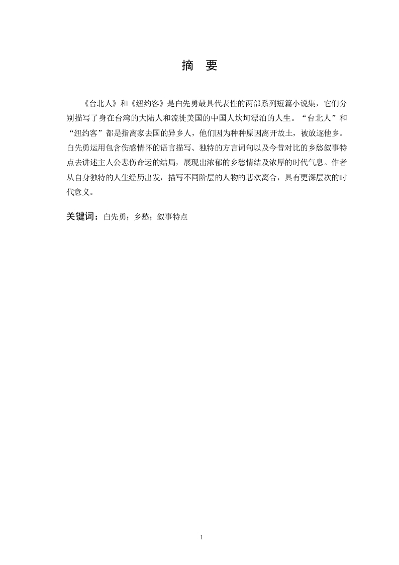 摘要《台北人》和《纽约客》是白先勇最具代表性的两部系列短篇小说集,它们分别描写了身在台湾的大陆人和流徙美国的中国人坎坷漂泊的人生。“台北人”和“纽约客”都是指离家去国的异乡人,他们因为种种原因离开故土,被放逐他乡。白先勇运用包含伤感情怀的语言描写、独特的方言词句以及今昔对比的乡愁叙事特点去讲述主人公悲伤命运的结局,展现出浓郁的乡愁情结及浓厚的时代气息。作者从自身独特的人生经历出发,描写不同阶层的人物的悲欢离合,具有更深层次的时代意义。关键词:白先勇:乡愁:叙事特点AbstractTaipei Characters and The New Yorker are Bai Xianyong's two most representativecollections of short stories.They respectively describe the bumpy and drifting lives ofmainland Chinese living in Taiwan and Chinese people living in the United States.Boththe "Taipei characters"and the "New Yorkers"refer to strangers who leave theirhomeland and go abroad.They leave their homeland for various reasons and are exiled.By using sad language descriptions,unique dialect words,and nostalgic narrative featuresof comparing the past with the present,Bai Xianyong tells the ending of the protagonists'sad fate,showing a rich nostalgic feeling and a strong sense of the times.Starting fromhis own unique life experience,the author describes the joys and sorrows of people fromdifferent classes,which has a deeper significance of times.Key Words:Bai Xianyong;nostalgia;narrative characteristics2目录35(一)《台北人》中的乡愁情结(二)《纽约客》中的乡愁情结.7三、乡愁情结与白先勇短篇小说的叙事特点.…8(二)以方言描写突出人物的乡愁情结(三)空间与时间的重叠..·四、乡愁情结与白先勇的时代意义.,111315..........................15致谢153