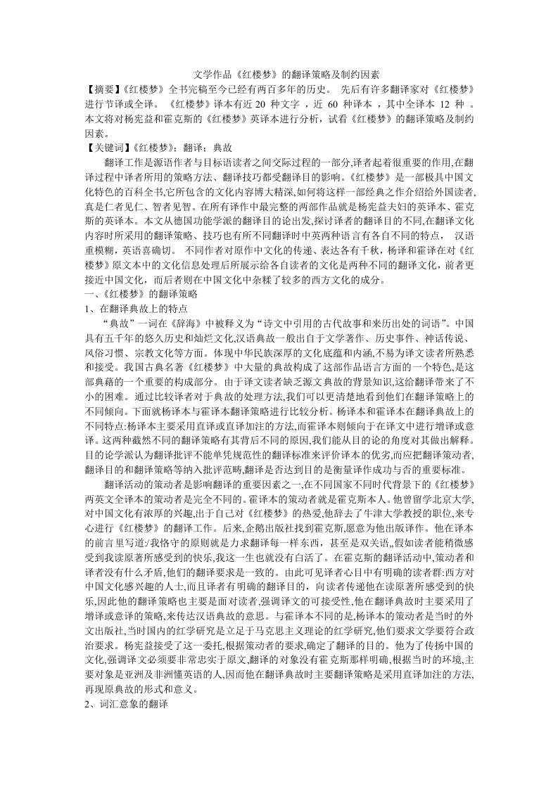 文学作品《红楼梦》的翻译策略及制约因素【摘要】《红楼梦》全书完稿至今已经有两百多年的历史。先后有许多翻译家对《红楼梦》进行节译或全译。《红楼梦》译本有近20种文字,近60种译本,其中全译本12种。本文将对杨宪益和霍克斯的《红楼梦》英译本进行分析,试看《红楼梦》的翻译策略及制约因素。【关键词】《红楼梦》:翻译:典故翻译工作是源语作者与目标语读者之间交际过程的一部分,译者起着很重要的作用,在翻译过程中译者所用的策略方法、翻译技巧都受翻译目的影响。《红楼梦》是一部极具中国文化特色的百科全书,它所包含的文化内容博大精深,如何将这样一部经典之作介绍给外国读者,真是仁者见仁、智者见智。在所有译作中最完整的两部作品就是杨宪益夫妇的英译本、霍克斯的英译本。本文从德国功能学派的翻译目的论出发,探讨译者的翻译目的不同,在翻译文化内容时所采用的翻译策略、技巧也有所不同翻译时中英两种语言有各自不同的特点,汉语重模糊,英语喜确切。不同作者对原作中文化的传递、表达各有千秋,杨译和霍译在对《红楼梦》原文本中的文化信息处理后所展示给各自读者的文化是两种不同的翻译文化,前者更接近中国文化,而后者则在中国文化中杂糅了较多的西方文化的成分一、《红楼梦》的翻译策略1、在翻译典故上的特点“典故”一词在《辞海》中被释义为“诗文中引用的古代故事和来历出处的词语”。中国具有五千年的悠久历史和灿烂文化,汉语典故一般出自于文学著作、历史事件、神话传说、风俗习惯、宗教文化等方面。体现中华民族深厚的文化底蕴和内涵,不易为译文读者所熟悉和接受。我国古典名著《红楼梦》中大量的典故构成了这部作品语言方面的一个特色,是这部典藉的一个重要的构成部分。由于译文读者缺乏源文典故的背景知识,这给翻译带来了不小的困难。通过比较译者对于典故的处理方法,我们可以更清楚地看到他们在翻译策略上的不同倾向。下面就杨译本与霍译本翻译策略进行比较分析。杨译本和霍译本在翻译典故上的不同特点:杨译本主要采用直译或直译加注的方法,而霍译本则倾向于在译文中进行增译或意译。这两种截然不同的翻译策略有其背后不同的原因,我们能从目的论的角度对其做出解释。目的论学派认为翻译批评不能单凭规范性的翻译标准来评价译本的优劣,而应把翻译策动者,翻译目的和翻译策略等纳入批评范畴,翻译是否达到目的是衡量译作成功与否的重要标准。翻译活动的策动者是影响翻译的重要因素之一,在不同国家不同时代背景下的《红楼梦》两英文全译本的策动者是完全不同的。霍译本的策动者就是霍克斯本人。他曾留学北京大学,对中国文化有浓厚的兴趣,出于自己对《红楼梦》的热爱,他辞去了牛津大学教授的职位,来专心进行《红楼梦》的翻译工作。后来,企鹅出版社找到霍克斯,愿意为他出版译作。他在译本的前言里写道我格守的原则就是力求翻译每一样东西,甚至是双关语,假如读者能稍微感受到我读原著所感受到的快乐,我这一生也就没有白活了。在霍克斯的翻译活动中,策动者和译者没有什么矛盾,他们的翻译要求是一致的。由此可见译者心目中有明确的读者群:西方对中国文化感兴趣的人士,而且译者有明确的翻译目的,向读者传递他在读原著所感受到的快乐,因此他的翻译策略也主要是面对读者强调译文的可接受性,他在翻译典故时主要采用了增译或意译的策略,来传达汉语典故的意思。与霍译本不同的是,杨译本的策动者是当时的外文出版社,当时国内的红学研究是立足于马克思主义理论的红学研究,他们要求文学要符合政治要求。杨宪益接受了这一委托,根据策动者的要求,确定了翻译的目的。他为了传扬中国的文化,强调译文必须要非常忠实于原文,翻译的对象没有霍克斯那样明确,根据当时的环境,主要对象是亚洲及非洲懂英语的人,因而他在翻译典故时主要翻译策略是采用直译加注的方法,再现原典故的形式和意义。2、词汇意象的翻译文化意象大多凝聚着各个民族的智慧和历史的文化结品,其中相当一部分文化意象还与各民族的传说,以及各民族初建时期的图腾崇拜有密切关系。由于汉英两种语言在语言表达方式及所反映的文化内容上存在着明显的差异,同一词汇在两种语言中给人们的联想意义是大不相同的,甚至是截然相反的。因而,从译文中在有关文化意象的词汇翻译上,也最能看出译者的翻译观及其所遵循的翻译原则和翻译方法。龙是中国古代传说中的一种神异动物,而凤是古代传说中百鸟之王,杨译文忠实于原文的文化意象,将龙与凤分别译成了和dragon与phoenix,向译语读者展示了龙与凤在中国传统文化中不可替代的作用。但同时在英语里,phoenix传说是一种生于阿拉伯沙漠的长生鸟,活五六百年后,用自己的翅膀煽火,自焚为灰烬,然后从灰烬中复生为新的phoenix,为此在英语中它有复活和再生之意.而dragon在西方的传说中是指一种身上有鳞,长有翅膀和长长尾巴的口中吐火的巨大斯蜴,在圣经故事里是邪恶的象征。两个完全不同的文化意象,霍译为帮助其读者正确理解原文,将这两个易使读者误解的词汇去掉,取而代之的是西方人较为熟悉的simurgh,即波斯神话当中一种巨鸟,文化信息虽有些失真,但也避免了译语读者对原文的