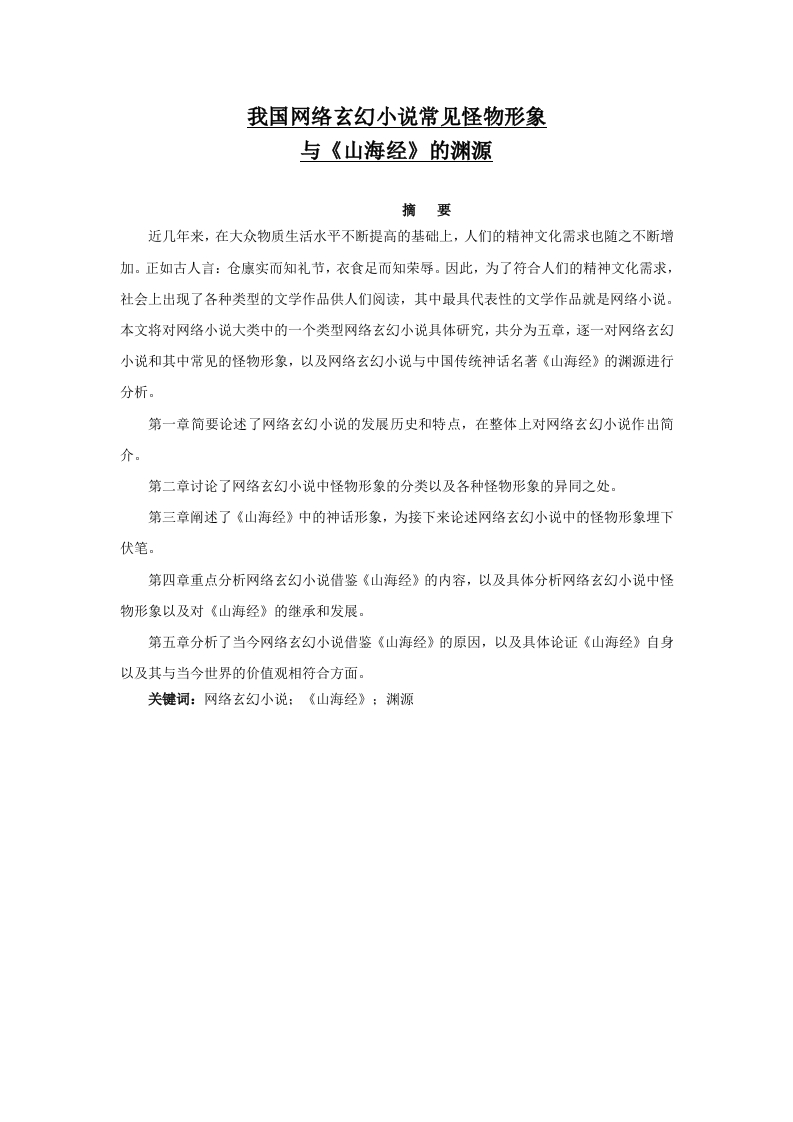 我国网络玄幻小说常见怪物形象与《山海经》的渊源摘要近几年来,在大众物质生活水平不断提高的基础上,人们的精神文化需求也随之不断增加。正如古人言:仓廪实而知礼节,衣食足而知荣辱。因此,为了符合人们的精神文化需求,社会上出现了各种类型的文学作品供人们阅读,其中最具代表性的文学作品就是网络小说。本文将对网络小说大类中的一个类型网络玄幻小说具体研究,共分为五章,逐一对网络玄幻小说和其中常见的怪物形象,以及网络玄幻小说与中国传统神话名著《山海经》的渊源进行分析。第一章简要论述了网络玄幻小说的发展历史和特点,在整体上对网络玄幻小说作出简介。第二章讨论了网络玄幻小说中怪物形象的分类以及各种怪物形象的异同之处。第三章阐述了《山海经》中的神话形象,为接下来论述网络玄幻小说中的怪物形象埋下伏笔。第四章重点分析网络玄幻小说借鉴《山海经》的内容,以及具体分析网络玄幻小说中怪物形象以及对《山海经》的继承和发展。第五章分析了当今网络玄幻小说借鉴《山海经》的原因,以及具体论证《山海经》自身以及其与当今世界的价值观相符合方面。关键词:网络玄幻小说:《山海经》:渊源目录一、网络玄幻小说简介.·(一)什么是网络玄幻小说...12(三)网络玄幻小说的特点。2二、网络玄幻小说怪物形象异同.··23(二)网络玄幻小说中怪物形象的异同..34(二)《山海经》中奇珍异兽的形象..·5(三)《山海经》中神话传说的形象..·5四、网络玄幻小说对《山海经》神话形象的借鉴…6(一)对神木仙草的借鉴678五、网络玄幻小说借鉴《山海经》的原因·99(二)形象塑造与思维方式方面...1011引言众所周知,《山海经》是我国第一部记述古代志怪的古籍,也是一部荒诞不经的奇书,里面记录了许多无史实并且非常离奇的故事。网络玄幻小说,想必大家也不陌生,这是一种类型小说,即不受人文与科学的限制,不受时空的限制,任由作者的强大想象力而自由发挥的故事,励志,热血,大多与神话故事,民间传说相关。本文将通过对《山海经》来源的讲诉及其与网络玄幻小说之间的联系,让大众更加了解《山海经》,增强大家对网络玄幻小说的正确认识,并由此探索现今社会对于我国传统文化的继承与发展。一、网络玄幻小说简介(一)什么是网络玄幻小说至于幻想小说这个词,其最早出现是由赵善祺先生在《月亮魔术》的序言中提到,在序言中其称:“宣布了一种全新的科学与文学,形而上学,我们称为‘玄幻小说’。”现阶段,学术界对于幻想小说的界定,是由余方,徐晓荣教授所提出的:“幻想小说,就是在90年代中后期所形成的新文本,常常借鉴于科幻小说,神话小说,武术小说,跟西方小说也会有或多或少的联系,我用了大量天体怪物和奇才来解释超现实空间,而这些却缺乏真实。幻想小说的故事情节叙述主要是通过主角的超自然能力和情感的传奇历程,一波三折的经历来予以推进。”读者所认识到的玄幻小说,就是在作者天马行空的想象之下所描绘出的各类奇幻故事,而网络玄幻小说便是由于近20年来互联网的飞速发展所诞生的,将此类故事发表连载到网络上的小说类型。笔者认为网络玄幻小说可以从作者故事讲述手法与塑造形象的角度去理解,可以看做是拥有特殊能力的人发生的光怪陆离的事情,在描述过程中大量融入了作者的想想。网络玄幻小说则主要是从小说发表渠道角度来看的,作者将自己的网络小说借助互联网发表在网络平台,大大提高了读者的广泛性。由还珠楼主李寿民所著《蜀山剑侠传》是我国最早流行考来的玄幻小说,其内容围绕“蜀山”这一神奇的地方塑造了一个又一个硝烟迭起的战争年代里具有特色的任务形象。《蜀山》的主人公是峨眉弟子“三英”中的李英琼。类似“三英”这种代号的还有“二云”、“七矮”等,都点出了小说人物的特点。李英琼虽然是一名普通女