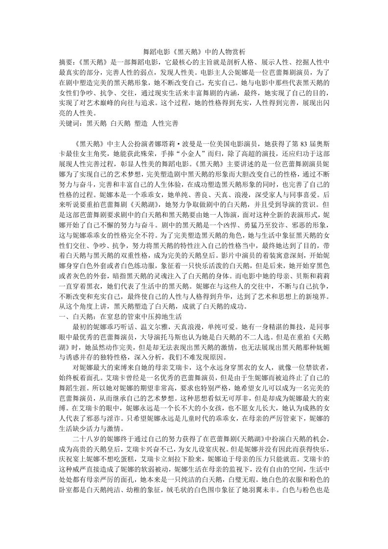 舞蹈电影《黑天鹅》中的人物赏析摘要:《黑天鹅》是一部舞蹈电影,它最核心的主旨就是剖析人格、展示人性、挖掘人性中最真实的部分,完善人性的弱点,发现人性美。电影主人公妮娜是一位芭蕾舞剧演员,为了在剧中塑造完美的黑天鹅形象,她不新改变自己,充实自己。她与电影中那些代表黑天鹅的女性们争吵、抗争、交往,通过现实生活来丰富舞剧的内涵,最终,她实现了自己的目的,实现了对艺术横峰的向往与追求。这个过程,她的性格得到充实,人性得到完善,展现出闪亮的人性美。关键词:黑天鹅白天鹅塑造人性完善《黑天鹅》中主人公扮演者娜塔莉·波曼是一位美国电影演员,她获得了第83届奥斯卡最佳女主角奖,她能获此殊荣,手捧“小金人”而归,除了高超的演技,还应归功于这部展现人性完善过程,彰显人性美的舞蹈电影。《黑天鹅》主要讲述的是一位芭蕾舞剧演员妮娜为了实现自己的艺术梦想,完美塑造剧中黑天鹅的形象而大胆改变自己的性格,通过不断努力与奋斗,完善和丰富自己的人生体验,在成功塑造黑天鹅形象的同时,也完善了自己的性格的过程。妮娜本是一个乖乖女,她单纯、善良、天真、浪漫,深受家人与同事喜爱。后来听说要重拍芭蕾舞剧《天鹅湖》,她努力争取做剧中的白天鹅,并且受到导演的赏识。但是这部芭蕾舞剧要求剧中的白天鹅和黑天鹅要由她一人饰演,面对这种全新的表演形式,妮娜开始了自己不懈的努力与奋斗。剧中的黑天鹅是一个凶悍、勇猛乃至狡诈、邪恶的形象,这与妮娜乖乖女的性格完全不符。为了完美塑造黑天鹅的角色,她与生活中象征黑天鹅的女性们交往、争吵、抗争,努力将黑天鹅的特性注入自己的性格当中,最终她达到了目的,带着白天鹅与黑天鹅的双重性格,成为完美的天鹅皇后。影片中演员的着装寓意深刻,开始妮娜身穿白色外套或者白色练功服,象征着一只快乐活泼的白天鹅,但是后来,她开始穿黑色或者灰色的外套,暗指黑天鹅的灵魂注入了白天鹅的身体。而电影中她的母亲、贝斯和莉莉一直穿着黑衣,她们代表了生活中的黑天鹅。妮娜在与这些人的交往中,不新与自己抗争,不断改变和充实自己,最终使自己的人性与人格得到升华,达到了艺术和思想上的新境界。从这个角度上讲,黑天鹅塑造了白天鹅,成就了白天鹅的成功。一、白天鹅:在室息的管束中压抑地生活最初的妮娜乖巧听话、温文尔雅,天真浪漫,单纯可爱。她有一身精湛的舞技,是同事眼中最优秀的芭蕾舞演员,大导演托马斯也认为她是白天鹅的不二人选。但是在重拍《天鹅湖》时,她虽然动作完美,但是却无法表现出黑天鹅的激情,也无法展现出黑天鹅那种妩媚与诱惑并存的独特性格,深入分析,我们不难发现原因。对妮娜最大的束缚来自她的母亲艾瑞卡,这个永远身穿黑衣的女人,就像一位禁欲者,始终板着面孔。艾瑞卡曾经是一名优秀的芭蕾舞演员,但是由于生妮娜而被迫终止了自己的舞蹈生涯。所以她对妮娜的期望非常高,要求也特别严格,她希望女儿可以成为一名完美的芭蕾舞演员,从而继承自己的艺术梦想。这种思想看似无可厚非,但是却成为妮娜最大的束缚。在艾瑞卡的眼中,妮娜永远是一个长不大的小女孩,也不愿女儿长大,她认为成熟的女人代表了邪恶与淫诈。只希望妮娜永远是儿童时代的乖乖女,在母亲的严厉管束下,妮娜的生活缺少活力与激情。二十八岁的妮娜终于通过自己的努力获得了在芭蕾舞剧《天鹅湖》中扮演白天鹅的机会,成为高贵的天鹅皇后,艾瑞卡兴奋不己,为女儿设宴庆祝。但是妮娜并没有因此而获得快乐,庆祝宴上妮娜不想吃蛋糕,艾瑞卡立刻拉下脸来,妮娜迫于母亲的压力只能就范。艾瑞卡的这种威严直接造成了妮娜的软弱被动,妮娜生活在母亲的监视下,没有自由的空间,生活中处处都有母亲严厉的面孔,她本来是一只纯洁的白天鹅,白璧无瑕。她白色的衣服和粉色的卧室都是白天鹅纯洁、幼稚的象征,绒毛状的白色围巾象征了她羽翼未丰。白色与粉色也是妮娜最喜欢的颜色,在这样的环境中,她的心理年龄永远处于童年,无法长大。妮娜在这一时期内只能被动地生活,软弱的性格决定了她没有独立自主的权利。她缺乏欲望,缺乏活力和激情,这正是她演黑天鹅最致命的弱点。妮娜也褐望成功,渴望自由,渴望无拘无束,但是来自上司、母亲、竞争对手以及她自己内心的压力,成为她成功路上最大的障碍。二、黑天鹅:激情四射、充满欲望芭蕾舞是妮娜生活的主题,芭蕾对于她就像生命一样重要。她的改变与完善,只为实现天鹅皇后的梦想。在妮娜的心里充满着对艺术的追求,这是她改变自己的动力源泉,而她的上司和竞争对手也逼着她不得不改变。妮娜的改变从她偷拿了贝丝的口红开始。她散开了标志着纯洁与天真的发髻,涂上偷来的口红去拜会托马斯,向托马斯请求饰演天鹅皇后。此刻的她,没有了往日的纯洁与天真,而是展现出黑天鹅的欲望与激情。她挑逗托马斯,并咬了他一口,这一咬将深藏在内心的力量完全爆了出来。在妮娜的改变与完善中,托马斯功不可没,他与妮娜的母亲是完全相反的两种状态,不断吸引妮娜向着另一个性格转变。他在不断激发妮娜潜能与内心的同时,也时时刻刻保护着这个他喜爱的舞蹈演员。托马斯的言行弥补了妮娜在单亲家庭中由于缺乏父爱而软弱的性格,推动妮娜一步步走向完善