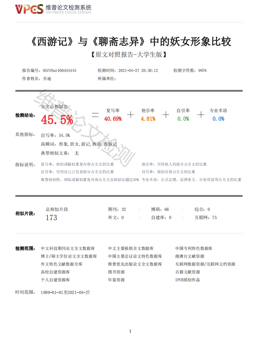 维普论文检测系统/IP PAPER CHECK SYSTEM《西游记》与《聊斋志异》中的妖女形象比较【原文对照报告-大学生版】报告编号:95ff0a1400d43443检测时间:2021-04-2720:30:12检测字符数:9978作者姓名:乔迪所属单位:全文总相似比复写率他引率自引率专业术语检测结论:45.5%40.69%4.81%0.0%0.0%其他指标:自写率:54.5%高频词:形象,妖女,游记,西游,西游记典型相似文章:无指标说明:复写率:相似或疑似重复内容占全文的比重他引率:引用他人的部分占全文的比重自引率:引用自己已发表部分占全文的比重自写率:原创内容占全文的比重典型相似性:相似或疑似重复内容占全文总相似比超过30%专业术语:公式定理、法律条文、行业用语等占全文的比重总相似片段期刊:32博硕:66综合:0相似片段:173外文:0自建库:0互联网:75检测范围:中文科技期刊论文全文数据库中文主要报纸全文数据库中国专利特色数据库博士/硕士学位论文全文数据库中国主要会议论文特色数据库港澳台文献资源外文特色文献数据全库维普优先出版论文全文数据库互联网数据资源/互联网文档资源高校自建资源库图书资源古籍文献资源个人自建资源库年鉴资源IPUB原创作品时间范围:1989-01-01至2021-04-27维普论文检测系统VIP PAPER CHECK SYSTEM原文对照颜色标注说明:■自写片段■复写片段(相似或疑似重复)口引用片段(引用)■专业术语(公式定理、法律条文、行业用语等)长治学院2021届学士学位毕业论文《西游记》与《聊斋志异》中的妖女形象比较学号:17411719姓名:乔迪指导教师:王金格专业:汉语言文学系别:中文系完成时间:2021年5月中文系本科生毕业论文诚信承诺书1.本人在毕业论文中引用他人的观点和参考资料均加以注释和说明。2.本人承诺在毕业论文选题和研究内容过程中没有抄袭他人研究成果和伪造相关数据等行为。3.在毕业论文中对侵犯任何方面知识产权的行为,由本人承担相应的法律责任。毕业论文作者签名:乔迪班级:汉语言文学1703班学号:174117192021年5月17日目录绪言1一、《西游记》与《聊斋志异》妖女形象的相似性1(一)外貌美与内心丑的反差1(二)自然本性与人的特性3二、《西游记》与《聊斋志异》妖女形象的相异性4(一)外貌、性情与心灵4(二)审美意蕴的独特内涵6(三)脸谱化与个性化7三、《西游记》与《聊斋志异》中妖女形象产生差异的原因8(一)创作态度82维普论文检测系统VIP PAPER CHECK SYSTEM(二)创作背景9四、结语10参考文献11致谢13《西游记》与《聊斋志异》中的妖女形象比较专业:汉语言文学姓名:乔迪学号:17411719指导教师:王金格摘要:在悠久的古典文学史上,妖女的形象往往同时具备“妖性”和“人性”双重特征。通过对比两部作品塑造了大量女妖形象的文学作品《西游记》与《聊斋志异》,笔者发现《西游记》对妖女形象的塑造多有贬低意味,凸显其人性的弱点,而《聊斋志异》偏向于赞美女性形象,一定程度上颠覆了封建女性贞洁观念。关键词:妖女形象:女性自主意识:《西游记》;《聊斋志异》绪言在浩如烟海的古典小说中,文人骚客创作了无数形态多样和个性鲜活的女性形象。古典小说中的妖女形象往往有两种身份,一种是在异类世界中的“怪物”,另一种是幻化为人类形式并具有女人的生理和心理特征的“女性”。女性和妖怪之间的双重属性使“妖女”作为一种特殊的方式而存在,在不同历史时期的文学作品中表现出不同的侧重面,具有多种主题寄议和文化特征。古典小说的代表作《西游记》与《聊斋志异》中都展现了丰富多样的妖女形象,但两部作品的妖女形象虽有相似之处却风格各异,在男权文化背景下展示了各具特色的文化内涵和审美价值。《西游记》中有大量的妖魔鬼怪,有关《西游记》妖女形象的研究成果有很多,唐僧师徒的取经途中遇到了诸多女性妖魔鬼怪,在《西游记》中的地位举足轻重,因此,对于《西游记》人物形象研究来说,妖女形象研究意义非凡。《聊斋志异》是中的妖女形象也很丰富,学界关于《聊斋志异》妖女形象的研究成果较多,但是就其中的妖女形象与其他文本对比的研究相对较少。因此,研究比较《西游记》与《聊斋志异》中的妖女形象对于中国古典文学来说还是有一定意义和价值的。一、《西游记》与《聊斋志异》妖女形象的相似性(一)外貌美与内心丑的反差在《左传·宣公十五年》中有“地反物为妖”[1]之说。妖就是妖怪,怪而反常态则称之为妖。一般来说,人们想象的妖怪形象或是凶狠残暴、恶毒食人,或是面目狰狞、丑陋不堪。而妖也用来形容姿色迷人的女子,曹植就曾在《美女篇》中说:“美女妖且闲,采桑歧路间”,[2]《西游记》与《聊斋志异》中的妖女个个都有沉鱼落雁之容,闭月羞花之貌。《西游记》里的妖女大都美若天仙却又心狠手辣,作者在第二十七回《尸魔三戏唐三藏圣僧恨逐美猴王》中写白骨精出场,作者从远近两个角度描写白骨精幻化的村姑。好妖精,停下阴风,在那山凹里,摇身一变,变做个月貌花容的女儿,说不尽那眉清目秀,齿白唇红,圣僧歇马在山岩,忽见裙钗女近前。翠袖轻摇笼玉笋,湘裙斜拽显金莲。汗流粉面花含露,尘拂峨眉柳带烟。[3]这里白骨精幻化的村姑在唐僧眼中是正常的美女,而在八戒眼中就更多几分性感妖娆,分明尤物。那女子生得:冰肌藏玉骨,衫领露酥胸。柳眉积翠黛,杏眼闪银星。月样容仪俏,天然性格清。体似
