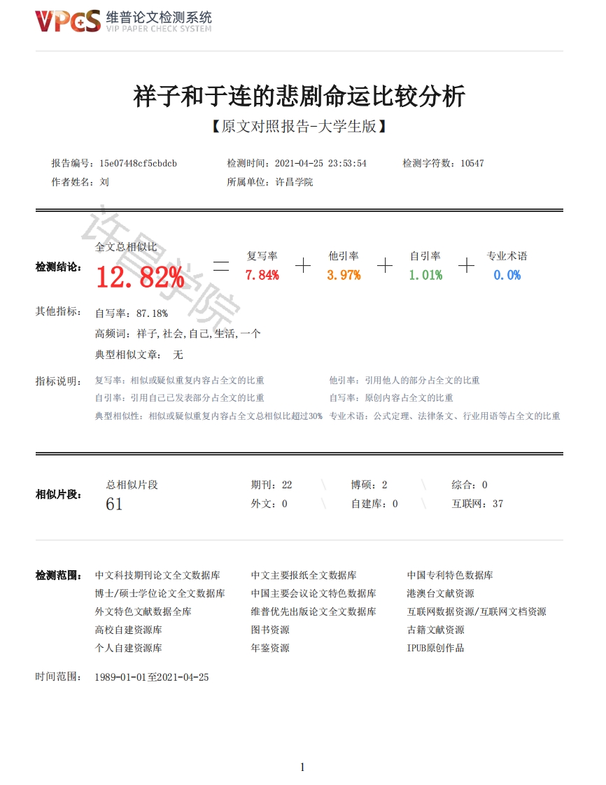 维普论文检测系统/IP PAPER CHECK SYSTEM祥子和于连的悲剧命运比较分析【原文对照报告-大学生版】报告编号:15e07448cf5 cbdcb检测时间:2021-04-2523:53:54检测字符数:10547作者姓名:刘所属单位:许昌学院全文总相似比复写率他引率自引率专业术语检测结论:12.82%7.84%3.97%1.01%0.0%其他指标:自写率:87.18%高频词:祥子,社会,自己,生活,一个典型相似文章:无指标说明:复写率:相似或疑似重复内容占全文的比重他引率:引用他人的部分占全文的比重自引率:引用自己已发表部分占全文的比重自写率:原创内容占全文的比重典型相似性:相似或疑似重复内容占全文总相似比超过30%专业术语:公式定理、法律条文、行业用语等占全文的比重总相似片段期刊:22博硕:2综合:0相似片段:61外文:0自建库:0互联网:37检测范围:中文科技期刊论文全文数据库中文主要报纸全文数据库中国专利特色数据库博士/硕士学位论文全文数据库中国主要会议论文特色数据库港澳台文献资源外文特色文献数据全库维普优先出版论文全文数据库互联网数据资源/互联网文档资源高校自建资源库图书资源古籍文献资源个人自建资源库年鉴资源IPUB原创作品时间范围:1989-01-01至2021-04-25维普论文检测系统VIP PAPER CHECK SYSTEM原文对照颜色标注说明:■自写片段■复写片段(相似或疑似重复)口引用片段(引用)■专业术语(公式定理、法律条文、行业用语等)许昌学院XUCHANG UNIVERSITY本科生毕业论文祥子和于连的悲剧命运比较分析学院文学与传媒学院专业汉语言文学班级17级汉文三班学号4001170096学生姓名刘媛联系方式13103746282指导教师谢占杰职称:副教授2020年5月独创性声明本人郑重声明:所呈交的毕业论文(设计)是本人在指导老师指导下取得的研究成果。除了文中特别加以注释和致谢的地方外,论文(设计)中不包含其他人已经发表的研究成果。与本研究成果相关的所有人所做出的任何贡献均已在论文(设计)中作了明确的说明并表示了谢意。签名:授权声明本人完全了解许昌学院有关保留、使用本科生毕业论文(设计)的规定,即:有权保留并向国家有关部门或机构送交毕业论文(设计)的复印件和磁盘,允许毕业论文(设计)被查阅和借阅。本人授权许昌学院可以将毕业论文(设计)的全部或部分内容编入有关数据库进行检索,可以采用影印、缩印或扫描等复制手段保存、汇编论文(设计)。2维普论文检测系统VIP PAPER CHECK SYSTEM本人论文(设计)中有原创性数据需要保密的部分为(如没有,请填写“无”):学生签名:年日指导教师签名:年月日祥子和于连的悲剧命运比较分析摘要祥子和于连分别是老舍的《骆驼祥子》和司汤达的《红与黑》中的主人公。两部作品的主人公虽然性格不同,追求各异,但有着相似的悲剧命运。比较这两个青年人形象的性格及其悲剧命运,探讨其背后的根源,有助于加深对两部作品的理解,感受到两位作家深厚的人道主义情怀。A Comparative Analysis Of Xiangzi And Julian's Tragic FateABSTRACTXiangzi and Julian are the protagonists in Lao She's "Camel Xiangzi"and Stendhal's "Red andBlack"respectively.Although the protagonists of the two works have different personalities anddifferent pursuits,they have similar tragic fate.Comparing the personalities of the two youngpeople's images and their tragic fate,and exploring the root causes behind them will help deepenthe understanding of the two works and feel the profound humanitarian feelings of the two writers.Key words:Xiangzi;Julien;Struggle;Woman目录引言1一、作为奋斗者的共性1(一)奋斗的于连1(二)努力的祥子2二、于连和祥子的性格3(一)复杂矛盾的于连3(二)逆来顺受的祥子4三、悲剧命运5(一)祥子的三起三落5(二)于连的三起三落6四、悲剧命运中的女性7(一)祥子与虎妞以及小福子7(二)于连与瑞纳夫人及玛蒂尔德小姐8五、悲剧根源8六、结语10参考文献11致谢12于连和祥子的人物形象比较引言《红与黑》是司汤达受家庭教师枪杀案启发创作的一部现实主义文学作品,但故事发展已与当时的真实案件有了很大的差异,司汤达结合当时社会实际写成了《红与黑》这一部揭露复辟与反封建复辟斗争以及革命历史的著作。书中的副标题《一八三0年纪事》也反映了七月革命前的真实政治局势。《红与黑》不仅深刻而强烈地反映了法国封建复辟时期的社会现实,更是由表及里涉及到许多社会特征。作者通过对当时教会、政党和各阶级之前错综复杂关系的描写,揭示了封建社会时期的腐朽黑暗以及贵族和平民之间的剧烈冲突。而于连正是处于法国19世纪上半叶动荡的社会背景中的人物。在封建王朝复辟下,一个平民代表与上流社会阶层之间的斗争也由此开展了。3