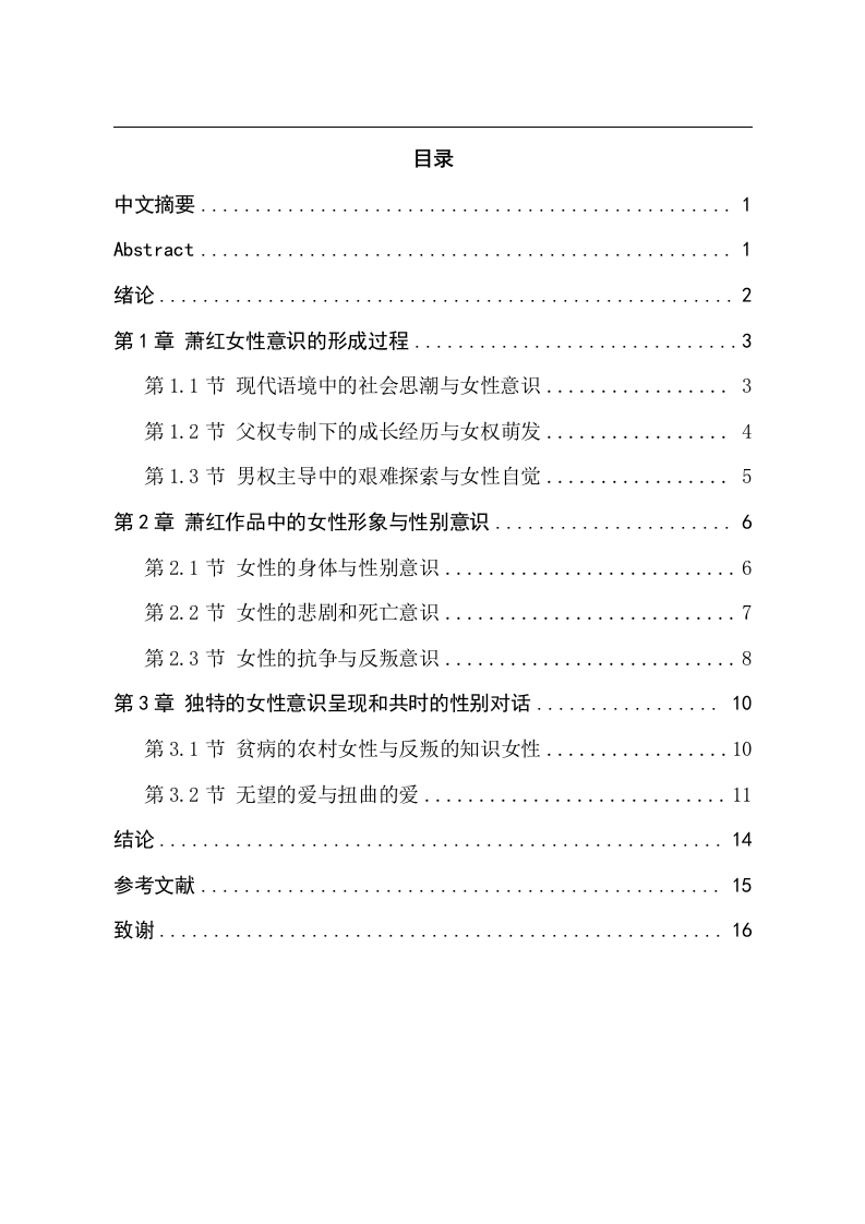 目录中文摘要.Abstract....2第1章萧红女性意识的形成过程第1.1节现代语境中的社会思潮与女性意识.·3第1.2节父权专制下的成长经历与女权萌发.·4第2章萧红作品中的女性形象与性别意识...6第2.1节女性的身体与性别意识..6第2.2节女性的悲剧和死亡意识...·7第2.3节女性的抗争与反叛意识..·第3章独特的女性意识呈现和共时的性别对话..…10第3.1节贫病的农村女性与反叛的知识女性......10第3.2节无望的爱与扭曲的爱.11结论14参考文献1516萧红文学作品中的女性意识探究中文摘要萧红是中国现当代著名女作家,被誉为“20世纪30年代的文学洛神”,著有《生死场》、《呼兰河传》、《商市街》等作品。萧红作品中的人物形象大多为女性,她通过对女性形象的塑造,揭露出了广大农村妇女的生存困境和精神折磨。本文试图通过对萧红文学作品中的女性意识进行文本分析和探究,并将其与同时期的女性作家进行对比分析,来加深对萧红文学作品中女性意识的理解,从而探讨出萧红在整个中国文学史上的独特地位和价值。关键词:萧红女性意识女性形象AbstractXiao Hong is a famous contemporary Chinese female writer,known asthe "1930s goddess of literature",author of The field of life and death","Tales of Hulan River ""Market Street"and other works.Her works aremostly for women,through the portrayal of female images,exposed themajority of women's life difficulties and mental torture.In this paper,I try toanalyze and explore the female consciousness in Xiao Hong's literary works.By comparing with the female writers in the same period,in order to obtainan in-depth understanding of Xiao Hong's female consciousness,and toexplore the unique position and value of Xiao Hong in the whole Chineseliterary history.Key words:Xiao Hong female consciousnessfemales绪论萧红,1911生于黑龙江呼兰河县内的一个乡绅地主之家,她一生漂泊贫困,年仅三十一岁便早逝,但她在近十年的创作生涯中留下了近百万余字的经典文学作品,由此奠定了自己在文学史上的地位。萧红是中国现当代继冰心、丁玲之后的著名女性作家,她天资聪慧、极具天分,她用自己的独特视角创造出了非凡的女性形象,展现出了独特的艺术魅力。儿时封建家庭的剥夺和压迫、不幸的婚烟和情感生活、多病多难的坎坷经历使得萧红很早就意识到了男权社会对女性的不公和压迫。萧红的作品始终关注底层女性的生活,用她敏锐的笔触揭示农村社会的黑暗和压迫,她与作品中的人物同生同死,同受难同抗争,她自觉地将自己融入文本,通过女性视角的运用,表达出自觉的女性意识。萧红在文学创作的前期受到了左翼文艺思潮的影响,并且投身于其中,但是后来萧红逐渐独立了出来,甚至可以说萧红是有意识地主动远离了主流意识形态,她开始寻求自己独特的艺术表达与呈现,萧红是个思想独立且深刻的作家。但是,在上世纪三四十年代,萧红的作品曾受到男性的批评和曲解。有人批评说萧红的散文看不懂,也有人批评她的作品阴暗低沉,与抗战无关。茅盾在《呼兰河传》序中认为萧红“感情富于理智”,被“狭小的私生活的圈子”四所困,但在笔者看来,萧红非但没有被狭小的私生活圈子所困,她反而是将其视角投身于最广大的底层人民,关注人性冷暖及其生命体验。这样的视角来源于萧红独特的女性洞察与思考,她以女性尖锐、深刻、丰富的思考去审判和反思历史,最终达到对国民灵魂的大彻悟,表达出她对光明的思考和向往。)章海宁.萧红印象·序跋丛书[C].哈尔滨:黑龙江大学出版社,2011:第12页冈章海宁.萧红印象·序跋丛书[C].哈尔滨:黑龙江大学出版社,2011:第12页