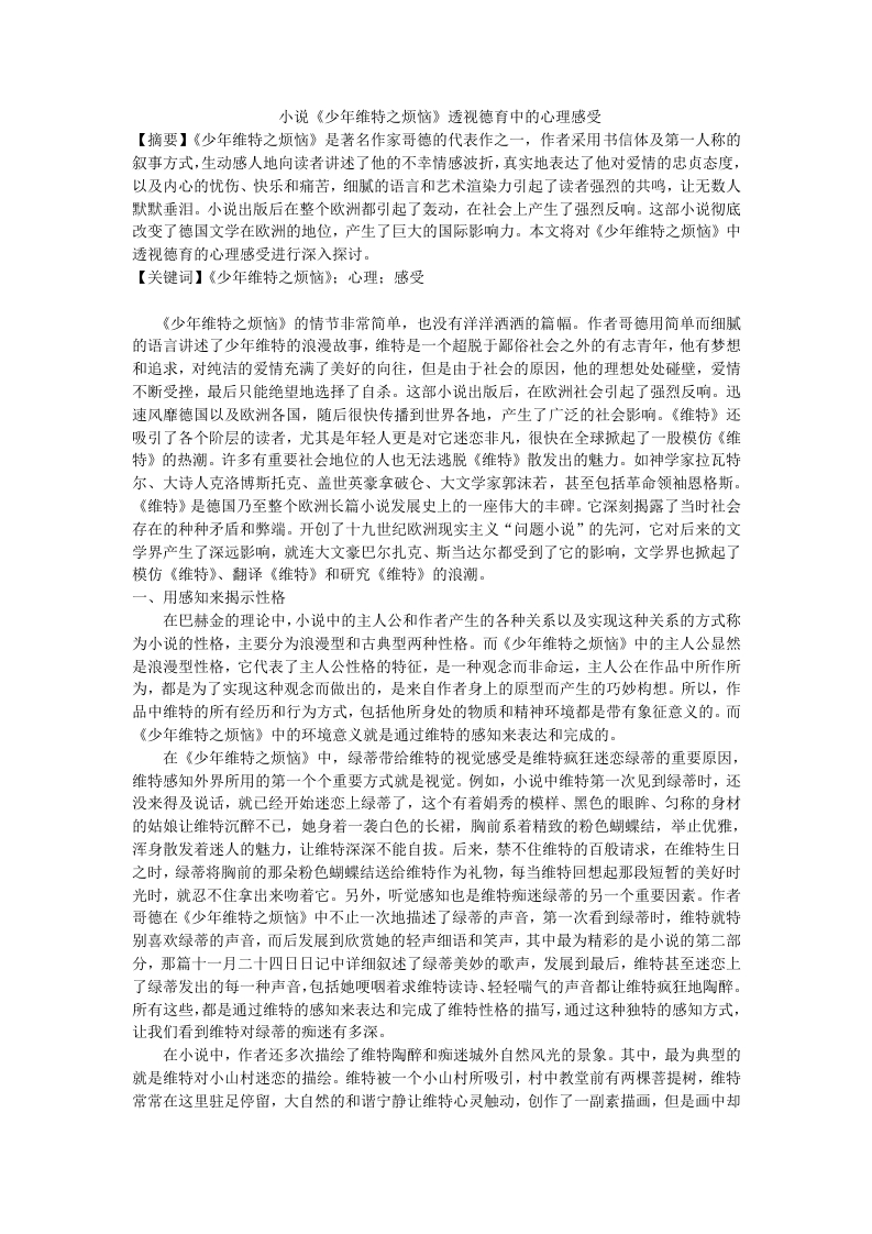 小说《少年维特之烦恼》透视德育中的心理感受【摘要】《少年维特之烦恼》是著名作家哥德的代表作之一,作者采用书信体及第一人称的叙事方式,生动感人地向读者讲述了他的不幸情感波折,真实地表达了他对爱情的忠贞态度,以及内心的忧伤、快乐和痛苦,细腻的语言和艺术渲染力引起了读者强烈的共鸣,让无数人默默垂泪。小说出版后在整个欧洲都引起了轰动,在社会上产生了强烈反响。这部小说彻底改变了德国文学在欧洲的地位,产生了巨大的国际影响力。本文将对《少年维特之烦恼》中透视德育的心理感受进行深入探讨。【关键词】《少年维特之烦恼》:心理:感受《少年维特之烦恼》的情节非常简单,也没有洋洋酒酒的篇幅。作者哥德用简单而细腻的语言讲述了少年维特的浪漫故事,维特是一个超脱于鄙俗社会之外的有志青年,他有梦想和追求,对纯洁的爱情充满了美好的向往,但是由于社会的原因,他的理想处处碰壁,爱情不新受挫,最后只能绝望地选择了自杀。这部小说出版后,在欧洲社会引起了强烈反响。迅速风靡德国以及欧洲各国,随后很快传播到世界各地,产生了广泛的社会影响。《维特》还吸引了各个阶层的读者,尤其是年轻人更是对它迷恋非凡,很快在全球掀起了一股模仿《维特》的热潮。许多有重要社会地位的人也无法逃脱《维特》散发出的魅力。如神学家拉瓦特尔、大诗人克洛博斯托克、盖世英豪拿破仑、大文学家郭沫若,甚至包括革命领袖恩格斯。《维特》是德国乃至整个欧洲长篇小说发展史上的一座伟大的丰碑。它深刻揭露了当时社会存在的种种矛盾和弊端。开创了十九世纪欧洲现实主义“问题小说”的先河,它对后来的文学界产生了深远影响,就连大文豪巴尔扎克、斯当达尔都受到了它的影响,文学界也掀起了模仿《维特》、翻译《维特》和研究《维特》的浪潮。一、用感知来揭示性格在巴赫金的理论中,小说中的主人公和作者产生的各种关系以及实现这种关系的方式称为小说的性格,主要分为浪漫型和古典型两种性格。而《少年维特之烦恼》中的主人公显然是浪漫型性格,它代表了主人公性格的特征,是一种观念而非命运,主人公在作品中所作所为,都是为了实现这种观念而做出的,是来自作者身上的原型而产生的巧妙构想。所以,作品中维特的所有经历和行为方式,包括他所身处的物质和精神环境都是带有象征意义的。而《少年维特之顷恼》中的环境意义就是通过维特的感知来表达和完成的。在《少年维特之烦恼》中,绿蒂带给维特的视觉感受是维特疯狂迷恋绿蒂的重要原因,维特感知外界所用的第一个个重要方式就是视觉。例如,小说中维特第一次见到绿蒂时,还没来得及说话,就己经开始迷恋上绿蒂了,这个有着娟秀的模样、黑色的眼眸、匀称的身材的姑娘让维特沉醉不己,她身着一袭白色的长裙,胸前系着精致的粉色蝴蝶结,举止优雅,浑身散发着迷人的魅力,让维特深深不能自拔。后来,禁不住维特的百般请求,在维特生日之时,绿蒂将胸前的那朵粉色蝴蝶结送给维特作为礼物,每当维特回想起那段短暂的美好时光时,就忍不住拿出来吻着它。另外,听觉感知也是维特痴迷绿蒂的另一个重要因素。作者哥德在《少年维特之烦恼》中不止一次地描述了绿蒂的声音,第一次看到绿蒂时,维特就特别喜欢绿蒂的声音,而后发展到欣赏她的轻声细语和笑声,其中最为精彩的是小说的第二部分,那篇十一月二十四日日记中详细叙述了绿蒂美妙的歌声,发展到最后,维特甚至迷恋上了绿蒂发出的每一种声音,包括她哽咽着求维特读诗、轻轻喘气的声音都让维特疯狂地陶醉。所有这些,都是通过维特的感知来表达和完成了维特性格的描写,通过这种独特的感知方式,让我们看到维特对绿蒂的痴迷有多深。在小说中,作者还多次描绘了维特陶醉和痴迷城外自然风光的景象。其中,最为典型的就是维特对小山村迷恋的描绘。维特被一个小山村所吸引,村中教堂前有两棵菩提树,维特常常在这里驻足停留,大自然的和谐宁静让维特心灵触动,创作了一副素描画,但是画中却没有一点我本人的想法,这种发现使我更加坚定地要皈依自然。在《少年维特之烦恼》中,我们可以经常看到这种对大自然的叙述。在小说中,感知是主人公主观色彩的强烈表现,是随着主人公的感觉来完成对自然的叙述和描绘。所以,这种描绘是维特对自然感受的另一种表达方式,是维特意识在自然界的外化表现。自然在维特的眼中己不再是单纯的自然,而是充满哲学性和社会性的一种意识,一种艺术观念,是欧罗巴族初期宗教所表达的根本内涵,也是人类与自然的完美结合,更是卢梭眼中人类最和谐的存在方式,是平等、自由、博爱的代表。这种皈依自然的思想,是哥德受到卢梭返归自然观念影响后的创作,哥德通过维特的感知来实现和完成这种思想的表达。二、直接的抒情方式哥德的名作《少年维特之烦恼》1774年在德国的比锡出版后,引起了强烈的社会反响,这部作品以真实的情感抒发、高度的艺术魅力、强烈的时代精神吸引了众多的读者,全世界掀起了一股模仿维特的热潮。也使得这部作品成为德国文学史上第一部产生重大国际影响的作品。哥德巧妙地运用书信体的形式,用第一人称的叙事方式,直接让主人公向读者叙述自己的感受和经历,抒发自己的情感和理想,展现出高度