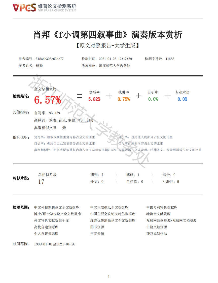 维普论文检测系统VIP PAPER CHECK SYSTEM肖邦《f小调第四叙事曲》演奏版本赏析【原文对照报告-大学生版】报告编号:518abb306c63bc77检测时间:2021-04-2612:17:29检测字符数:11688所属单位:浙江师范大学教务处全文总相似比复写率他引率自引率专业术语检测结论:6.57%5.82%0.75%0.0%0.0%其他指标:自写率:93.43%高频词:演奏,音乐,主题,肖邦,部分典型相似文章:无指标说明:复写率:相似或疑似重复内容占全文的比重他引率:引用他人的部分占全文的比重自引率:引用自己已发表部分占全文的比重自写率:原创内容占全文的比重典型相似性:相似或疑似重复内容占全文总相似比超过30%专业术语:公式定理、法律条文、行业用语等占全文的比重总相似片段期刊:7博硕:1综合:0相似片段:17外文:0自建库:0互联网:9检测范围:中文科技期刊论文全文数据库中文主要报纸全文数据库中国专利特色数据库博士/硕士学位论文全文数据库中国主要会议论文特色数据库港澳台文献资源外文特色文献数据全库维普优先出版论文全文数据库互联网数据资源/互联网文档资源高校自建资源库图书资源古籍文献资源个人自建资源库年鉴资源IPUB原创作品时间范围:1989-01-01至2021-04-26维普论文检测系统VIP PAPER CHECK SYSTEM原文对照颜色标注说明:■自写片段■复写片段(相似或疑似重复)口引用片段(引用)■专业术语(公式定理、法律条文、行业用语等)一、肖邦与他的叙事曲(一)肖邦生平简介肖邦出生于19世纪,是来自波兰的著名作曲家和钢琴演奏者,也是波兰的现代化音乐历史上其中一位最重要的代表性人物。他充分热爱我们祖国的文化传统,将对我们祖国的激情和热爱渗透进了他们的音乐与作曲风格之中。肖邦的创作范围主要集中在钢琴上,其作品灵感大多来源于波兰当时人民的日常生活与历史。其作品大多以波兰民间歌曲为主要基础,曲调表现得热情奔放,和声组织体写法丰富,作品的结构也不再拘泥于古典主义时期的固定结构。他还在这首歌中创新运用了波兰民间音乐,使其与传统钢琴有机结合到了一起。“生于华沙,灵魂属于波兰,才华属于世界。”这句话是对消邦最高度的评价。他是早期浪漫主义的杰出代表,是19世纪民族乐派的先行者。(二)叙事曲创作背景与特点肖邦的作品以钢琴为主,一生创作了无数不同流派的钢琴作品。这首钢琴叙事曲是肖邦创作的。叙事曲(Ballade)一词早在l4世纪之前便有了跳舞的意思,随后演变为拉丁语“ballare”。到了浪漫主义时期,叙事曲便大部分用于指一种声乐体裁。歌唱的内容以民间传说或叙事诗为主,由此可见当时的叙事曲成了音乐性和文学性的结合体。到了1800左右,叙事曲主要指诗人创作的由德语写作的叙事诗。每首叙事诗都是由四行诗组成的,并且每段的结构也不相同。叙事诗有许多种押韵的方法,一般是一行八个音节或者六个音节交替出现,但在一首诗中押韵的方法是前后一致的。后来由于歌词和旋律的分离,叙事曲用于专门指代音乐本身。在叙事曲器乐领域中,肖邦先后创作了四首叙事曲。这四首叙事曲好像代表了肖邦在不同时期所处的状态和想要表达的思想感情,宛如写了一部部不同人生的戏剧。肖邦在传统曲式结构基础上加入了更多的自由化处理,曲式结构更加丰富,从而使浪漫主义的音乐风格与古典主义的音乐形式能够并存。肖邦的叙事曲不仅仅只是按照正规大型叙事曲式的要求进行创作,而是根据自己所想表达的丰富音乐情感而广泛采用混合叙事曲式的结构。可以清楚地看出他将奏鸣曲的原则,变奏原则,回旋原则很好地结合到一起[1],使钢琴叙事曲能够表达更加复杂曲折的情感和思想。肖邦的四首叙事曲创新性极强,形式自由不拘一格,但又符合自然发展规律,是一种超越传统的曲式结构。肖邦极大地发挥了钢琴的艺术表现,并且赋予了钢琴其他乐器的色彩,甚至有了人声与语言的表现力。肖邦极其热情的爱国主义成为了他创作的主要内容,音乐中融入了浪漫主义和现实主义。由于肖邦后期定居于法国巴黎,音乐创作的题材大多都来源于对祖国的无尽的思念以及脑海中波兰人民的日常生活景象。在他的作品中,体现了波兰人热情英勇的形象以及对祖国深深的爱意,无论是大型还是小型作品都包含着伟大而又深刻的内容。其中他的四首叙事曲同样也蕴含着丰富的民族文化特点,他将波兰民间音乐、声乐叙事曲和古代叙事诗的精髓运用到叙事曲中。其中,波兰民间挽歌是肖邦叙事曲中使用的主要民间音乐素材。最后,另一个重要的材料是古代叙事诗。由于波兰诗人非常善于通过描写悲惨的战争来表达爱国主义,肖邦希望通过创作叙事曲来表现他的民族主义和爱国主义。通过以上的分析外加聆听,可以发现这四首叙事曲蕴含着非常强的悲刷性,这种悲刷性源于肖邦对于祖国饱受战争摧残的不忍,也来源于远离他乡渠道法国却又心系祖国的无奈之情。二、《f小调第四叙事曲》音乐要素分析2维普论文检测系统VIP PAPER CHECK SYSTEM(一)曲式分析《F小调第四叙事曲》是肖邦年轻时创作的最后一部作品。在整个作品中,作曲家对于情感上的对比大大减少,运用了相似的音调相互交替,直到最后肖邦大型作品中悲剧性、激情和慷慨的形象才会出现。它是肖邦后期情绪的自我表达,没有具体的标题。整首乐曲是由7个小节的引子拉开序幕的,好像是要开始讲述一个故事前
