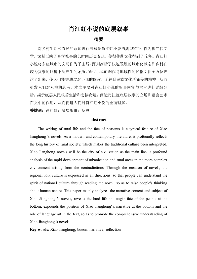 肖江虹小说的底层叙事摘要对乡村生活和农民的命运进行书写是肖江虹小说的典型特征,作为现当代文学,深刻反映了乡村社会的长时间历史变迁,使得传统文化得到了诠释。肖江虹小说将多座城市的文明作为了主线,深刻剖析了快速发展的城市化状态和乡村在较为复杂的环境下所产生的矛盾。通过小说的创作将地域性的民俗文化全方位表达了出来,使人们能够通过对小说的阅读,了解到民族文化所涵盖的精神,从而引发人们对人性的思考。本文主要对肖江虹小说的叙事内容与主旨进行详细分析,揭示底层人民艰苦生活和悲惨命运,阐述肖江虹底层叙事的立场和语言艺术在文中的作用,从而促进人们对肖江虹小说的全面理解。关键词:肖江虹;底层叙事:反思abstractThe writing of rural life and the fate of peasants is a typical feature of XiaoJianghong 's novels.As a modern and contemporary literature,it profoundly reflectsthe long history of rural society,which makes the traditional culture been interpreted.Xiao Jianghong novels will be the city of civilization as the main line,a profoundanalysis of the rapid development of urbanization and rural areas in the more complexenvironment arising from the contradictions.Through the creation of novels,theregional folk culture is expressed in all directions,so that people can understand thespirit of national culture through reading the novel,so as to raise people's thinkingabout human nature.This paper mainly analyzes the narrative content and subject ofXiao Jianghong 's novels,reveals the hard life and tragic fate of the people at thebottom,expounds the position of Xiao Jianghong's narrative at the bottom and therole of language art in the text,so as to promote the comprehensive understanding ofXiao Jianghong 's novels.Key words:Xiao Jianghong;bottom narrative;reflection目录1abstract.第章绪论…2第二章肖江虹小说叙事的内容与主旨…3第一节底层人民艰苦生活的关注与怜悯情怀第二节底层人民纯朴的心灵与人性的发展…4第三节底层人民悲剧性的命运.…第三章肖江虹底层叙事的立场和语言艺术在文中的作用.…5第一节叙事立场.…第二节优美与粗俗共存的语言艺术效果..6第四章现代城市文明与乡村文明的碰撞结语…8参考文献8第一章绪论肖江虹是底层叙事小说具有较高研究价值的作家,对底层人民的生活进行长期的关注,在文学创作过程中对传统人性进行全方位的探索。肖江虹小说从内容上来看,对底层人民的生活包含关怀,以传统习俗作为文学创作的主线,立足于社会发展的大趋势下,对乡村和城市二者之间的关系进行了审视,将自身对乡村生活的忧思表达出来。从肖江虹对底层叙事的描述来看,体现出了对民间风俗以及地方文化的长久体验和观察,文字的传达独具特色。其中《百鸟朝凤》、《蛊镇》、《傩面》等是肖江虹的代表作,从布局、叙事手法等方面对传统文化的进行阐述,文化变迁环境下的“人”是肖江虹笔下所描绘的重要角色,对整个乡村文化的生存状态进行了描绘,很大程度上表现出了其悲天悯人的情怀。第二章肖江虹小说叙事的内容与主旨从肖江虹小说的叙事内容来看,古风民俗是其小说创作关注的焦点,随着社会的快速发展,乡村社会受到了城市文明的强烈冲击,大批量的农民涌向城市,造成原本的乡村习俗很快崩塌,同时新的文化又尚未产生,从而造成了乡村整体的文化出现了不协调的状况。从肖江虹的文学作品来看,饱含着对城市和乡村二者关系的审视,将自身的情感通过文字的形式传达出来。主旨的明确是小说创作的前提,肖江虹在小说创作上针对底层乡村人民生活的具体现状进行了详细的描述,刻画出了各种人物形象,对城市文明与乡村文明二者之间存在的冲突进行分析,旨在提升底层人民的生活水平,吸引更多的人关注乡村民俗的发展。第一节底层人民艰苦生活的关注与怜悯情怀肖江虹小说在对地域文化进行描述的过程中,深刻揭示了底层人民的艰苦生活状态,同时也是对地域传统习俗劣根性的批判。在其小说的创作中,对众多的农村文化的风俗习惯以及荒诞的生活进行描写,将传统文化下的民族劣根性表达出来。肖江虹在对乡土文化进行创作的过程中,结合现代农村发展的特征,将传统文化、风土人情以及现代的乡村发展的情形进行有效结合,传达出了乡村文明所面临的衰败现象,对农民进城务工的这一状况进行揭示,突出了自身对农民悲苦生活的怜悯之心,诠释了内心的悲剧情怀。通过对肖江虹小说的阅读,能够