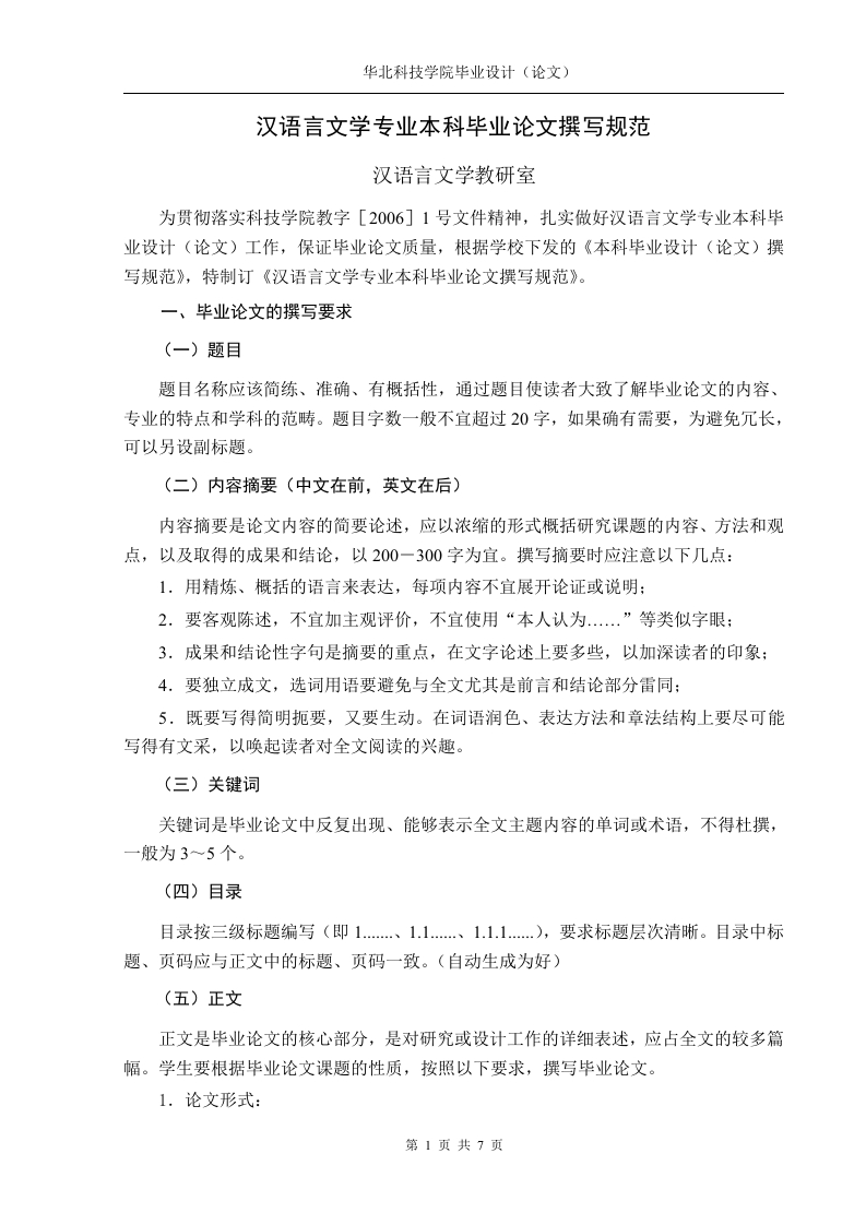 华北科技学院毕业设计(论文)汉语言文学专业本科毕业论文撰写规范汉语言文学教研室为贯彻落实科技学院教字[2006]1号文件精神,扎实做好汉语言文学专业本科毕业设计(论文)工作,保证毕业论文质量,根据学校下发的《本科毕业设计(论文)撰写规范》,特制订《汉语言文学专业本科毕业论文撰写规范》。一、毕业论文的撰写要求(一)题目题目名称应该简练、准确、有概括性,通过题目使读者大致了解毕业论文的内容、专业的特点和学科的范畴。题目字数一般不宜超过20字,如果确有需要,为避免冗长,可以另设副标题。(二)内容摘要(中文在前,英文在后)内容摘要是论文内容的简要论述,应以浓缩的形式概括研究课题的内容、方法和观点,以及取得的成果和结论,以200一300字为宜。撰写摘要时应注意以下几点:1.用精炼、概括的语言来表达,每项内容不宜展开论证或说明:2.要客观陈述,不宜加主观评价,不宜使用“本人认为..”等类似字眼:3.成果和结论性字句是摘要的重点,在文字论述上要多些,以加深读者的印象:4,要独立成文,选词用语要避免与全文尤其是前言和结论部分雷同:5,既要写得简明扼要,又要生动。在词语润色、表达方法和章法结构上要尽可能写得有文采,以唤起读者对全文阅读的兴趣。(三)关键词关键词是毕业论文中反复出现、能够表示全文主题内容的单词或术语,不得杜撰,一般为3一5个。(四)目录目录按三级标题编写(即1、1.1.、1.1.1..),要求标题层次清晰。目录中标题、页码应与正文中的标题、页码一致。(自动生成为好)(五)正文正文是毕业论文的核心部分,是对研究或设计工作的详细表述,应占全文的较多篇幅。学生要根据毕业论文课题的性质,按照以下要求,撰写毕业论文。1.论文形式:第1页共7页华北科技学院毕业设计(论文)(1)论述式:综合运用所学语言文学基础理论、专门知识和基本技能,对语言、文学、艺术以及更广泛的文化领域里的某些理论问题或现象进行探讨、研究、阐述和论证。(2)评论式:针对语言文学领域中某一学科、专业的研究成果和学术动态进行综合性叙述和评论。(3)调研式:对地方语言、文学、艺术、文化现象进行调查研究,提出相应的对策、措施和建议。(4)考证式:针对语言、文学、艺术及文化领域里某一专门问题,适用考证方法深入探究、考核、证实和说明。(5)争鸣式:对汉语言文学学科领域中的某些理论问题或学术观点,提出不同看法,进行争鸣和辩论。学生毕业论文一般采用论述式。2.对正文撰写总的要求是:论点要正确,中心要突出:要有足够的依据,论据要充分支持论点;论点与论据要协调一致:理论、观点、概念表达要准确、清晰:要有一定的新意:结构层次清晰、严谨:语言表达流畅。(六)脚注(又称页注,一种注释形式。)主要是对正文中出现的较为冷僻的概念的释义或对概念作进一步的解释和说明。(七)参考文献又称参考书目。是论文写作过程中曾经参阅过或引用过的文献的目录表。参考文献是毕业论文不可缺少的组成部分,它反映毕业论文的取材来源、材料的广博程度和材料的可靠程度。一份完整的参考文献也是向读者提供的一份有价值的信息资料。参考文献必须是学生本人真正阅读过,以近期发表的文献为主,应与课题直接有关。文献按照在正文中的出现顺序排列,正文中应加入标注(例冈与文尾排列顺序相一致)。参考文献的条目应尽可能少而精,可列入不少于15篇(部)的主要参考文献。一般不得引用非正式发表的文献(硕、博士论文可引用)。参考文献标识码:专著M刈、论文集[C]、学位论文D]、报告[R]、期刊文章)、论文集中的析出文献[A、报纸文章)、国际、国家标准[S]、专利P]、电子文献EBOL]。(八)附录本部分内容可根据论文研究内容的不同,根据指导教师意见参照采用,不作统一要求。第2页共7页华北科技学院毕业设计(论文)(九)致谢致谢是对课题研究与论文撰写过程中曾直接给予帮助的人员(例如指导教师、答疑教师及其他人员)表示谢意,这不仅是礼貌,也是对他人劳动的尊重,是治学者应有的思想作风。所用文字要简洁,切忌浮夸和庸俗之词以及相互抄袭。(十)声明主要是说明自己的论文除了参阅他人的研究成果外,不存在抄袭、剽窃问题,以鼓励创新,纠正学术不端行为。二、毕业论文撰写格式1.正文打印格式毕业论文文本要A4纸单面打印,正文中的任何部分不得写到文稿纸边框以外,文稿纸不得随意接长或截短,汉字必须使用国家公布的规范字。装订线为0,位置为“左侧”。版面页边距上为2.5cm,下为2.5cm,左3cm,右为2cm。页眉距边界为1.5cm,页脚为1.75cm。首行缩进2个字。奇数页书写“华北科技学院毕业设计(论文)”,偶数页书写毕业论文的题目,均用宋体五号书写。页脚格式为第X页共X页,居中,用宋体五号书写。2.各部分打印格式(1)中文摘要及关键词标题为小四号黑体字,摘要内容、关键词为小四号宋体字,行间距18磅。各关键词之间用分号分开,最后一个关键词后面无标点符号。(2)英文摘要及关键词:详见《论文装订与书写格式范例》(3)目录:“目录”二字采用三号黑体字,居中,行距18磅,段前段后0.5行。以下依次为“1”、“1.1”、“1.1.1”及各级序号的开始页码,为小四号宋体字,1.5倍行距。目录一般采用三级。(4)正文论文字数一般不得少于12000字(语言类选题可以至少8000字)。一级标题为三号黑体字,首行缩进2个