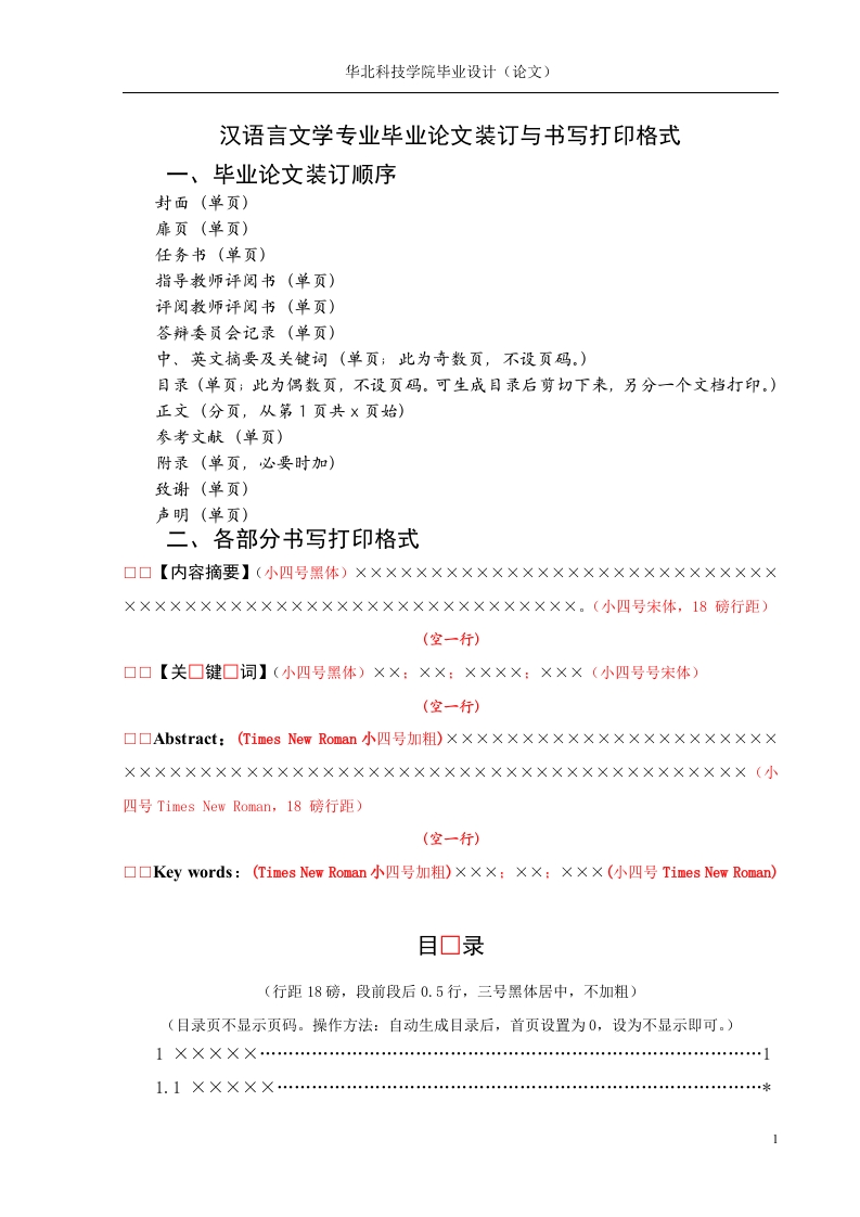 华北科技学院毕业设计(论文)汉语言文学专业毕业论文装订与书写打印格式一、毕业论文装订顺序封面(单页)扉页(单页)任务书(单页)指导教师评阅书(单页)评阅教师评阅书(单页)答辩委员会记录(单页)中、英文摘要及关健词(单页;此为奇数页,不设页码。)目录(单页;此为偶数页,不设页码。可生成目录后剪切下来,另分一个文档打印。)正文(分页,从第1页共x页始)参考文献(单页)附录(单页,必要时加)致谢(单页)声明(单页)二、各部分书写打印格式(空一行)(空一行)四号Times New Roman,l8磅行距)(空一行)口口Key words:(Times New Roman小四号加粗)XXX:XX:XXX(小四号Times New Roman)目口录(行距18磅,段前段后0.5行,三号黑体居中,不加粗)(目录页不显示页码。操作方法:自动生成目录后,首页设置为0,设为不显示即可。)毕业(设计)论文的题目2.2.1 XXXXX…参考文献…附录…致声明(说明:以上目录部分内容采用小四号宋体,缩进二个字符,行距为1.5倍行距。生成目录的操作步骤是:先定义一、二、三级目录的格式,然后按“插入一引用一索引和目录一目录,选三级、使用页码”的操作顺序即可,生成后剪切至新文档,再按格式要求修改。)正文部分:口口1XXXX(正文第一级标题,用三号黑体,不加粗:18磅行距,段前段后加0.5行)XXXXXXXX XXXXXXXXXXXXXXXX XXXXXXXXXXXXXXX XX×××××××…(正文小四号宋体,18磅行距)口口1.1××××××(正文第二级标题,用四号黑体,不加粗:18磅行距,段前段后0.5行)标)…。(小四号宋体)口口1.1.1×X××(正文3级标题,用小四号黑体,不加粗)2华北科技学院毕业设计(论文)参考文献(行距18磅,段前段后0.5行,三号黑体居中,不加粗)各类文献的著录格式如下:(以下内容小四宋、行距20磅)①专著顺序号著者.书名[们.版本.出版地:出版者,出版年,在原文献中的页码位置示例:[1]夏小华,高为柄.非线性系统控制及解耦[0.第2版.北京:科学出版社,1997.20-30.②期刊[顺序号]作者.题名[J门.其他责任者.刊名,年,卷(期):在原文献中的位置示例:[2]高为柄,程勉,夏小华.非线性控制系统的发展[J].自动化学报,1991,17(4):513-523③论文集中的析出文献[A][序号]析出文献主要责任者.析出文献题名[A].原文献主要责任者(任选).原文献题名[C].出版地:出版者,出版年.析出文献起止页码[3]钟文发.非线性规划在可燃毒物配置中的应用[A].赵玮.运筹学的理论与应用一一中国运筹学会第五届大会论文集[C].西安:西安电子科技大学出版社,1996.468-471.④学位论文顺序号作者.题名:[学位论文].保存地:保存者,年份示例:[4]陈淮金.多机电力系统分散最优励磁控制器的研究:[学位论文].北京:清华大学电机工程系,1988⑤会议论文顺序号作者.题名.会议名称,会址,会议年份示例:[5]夏小华,高为柄.稳定设计中的分解和参数化方法.全国控制与决策会议,黄山,1993⑥报纸文章[N][序号]主要责任者.文献题名[N].报纸名,出版日期(版次)[6]谢希德.创造学习的新思路[N].人民日报,1998-12-25(10).⑦译文文献格式[序号][国家简称]主要责任者.文献题名[文献类型标识].译者名,译.出版地:出版者,出版年.起止页码(任选)3