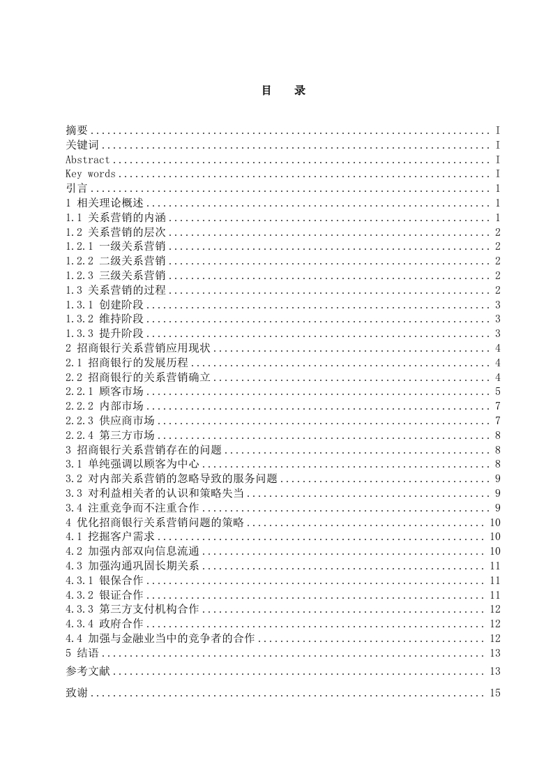 录111.2关系营销的层次21.2.1一级关系营销21.2.2二级关系营销21.2.3三级关系营销21.3关系营销的过程..21.3.1创建阶段31.3.2维持阶段3442.2招商银行的关系营销确立42.2.1顾客市场572.2.3供应商市场..2.2.4第三方市场83招商银行关系营销存在的问题.·83.2对内部关系营销的忽略导致的服务问题..93.3对利益相关者的认识和策略失当93.4注重竞争而不注重合作94优化招商银行关系营销问题的策略10104.2加强内部双向信息流通104.3加强沟通巩固长期关系114.3.1银保合作11114.3.3第三方支付机构合作..124.3.4政府合作124.4加强与金融业当中的竞争者的合作1213参考文献…1315关系营销在我国商业银行中的应用以招商银行为例摘要:关系营销,即与客户建立长期的合作关系,来达到双方共赢的目的,它已经成为银行经营的一个重要环节。关系营销强调企业与客户、合作伙伴建立互利互信、长期稳定的伙伴关系,实现稳定的经济效益。国外商业银行关系营销的研究与实践比国内银行先进。目前,我国的商业银行的市场关系营销能力,处于落后状态,需要改善关系营销策略,以适应激烈的国内外市场竞争。因此,本文以招商银行为例,针对其当前关系营销的现状展开研究,总结出了其存在的问题,并制定出了相应的解决对策,旨在完普其关系营销模式,推动其可持续发展,增强其综合竞争实力。关键词:关系营销;招商银行:市场竞争Application of Relationship Marketing in Commercial Banks-Taking China Merchants Bank as an ExampleAbstract:Relationship marketing has become an important joint in bank operations,that is,establishing long-term cooperative relationships with customers.Relationship marketingemphasizes the establishment of mutually beneficial and trustworthy,long-term and stablepartnerships between enterprises,customers and partners to achieve stable economic benefits.Theresearch and practice of relationship marketing in foreign commercial banks is better than cash indomestic banks.At present,China's commercial banks are in a backward state of the market forrelationship marketing,and need to improve relationship marketing strategies to adapt to the fiercedomestic and international market competition.So,this article is a trick for example,thecommercial bank studies the current situation of its current relationship marketing,summarizes itsexisting problems,and formulates corresponding solutions to improve its relationship marketingmodel,promote its sustainable development,and enhance its comprehensive competitive strength.Key words:Relationship Marketing;China Merchants Bank;Market Competition引言如今,经济全球化进程加快,全球经济联系日益紧密,国内外金融市场更加开放,使得世界银行业的竞争也变得激烈。在这种情况下,我国商业银行单纯靠创新金融产品业务经营理念变得落后,必须学习新的营销理念,才能融入到全球金融市场的大环境中去。关系营销是一种新的企业营销理念,在二十世纪九十年代被提出,现已开始被各大行业,包括商业银行业广泛采取。我国的国有大型商业银行和股份制商业银行所占市场份额最大,而股份制银行经营机制较为灵活,比较容易接受新的关系营销理念。因此,本文选择招商银行作为研究对象,通过对招商银行的关系营销现状进行分析,找出招商银行在关系营销方面的成功与不足,并提出相关建议,这在当前商业银行竞争逐渐激烈,外资银行和国内行业进行市场争夺的现状下,对我国商业银行发展有重要的指导意义。1相关理论概述1.1关系营销的内涵关系营销,是指企业与顾客在合作基础之上,满足顾客需求,并建立非利益关系,获得客户信任,通过这一层非利益关系,增加双方的亲密度,同时满足双方的需要,实现共赢。它包括以下几个方面:第一,沟通。沟通指的是一个主体向另一个主体传递想法,它是双向的,收到想法的主体会进行反馈。银行和客户之间只有不断进行沟通,才能促成双方的良好合作。第二,合作。合作,是指企业间找到其共同利益,将双方的资源进行互换,合理配置,从而实现“双赢”。第三,互利。关系营销的目的在于“互利”。即通过合作,使企业和客户得到各自所需的利益。第四,信任。对于交易双方来说,其合作关系的好坏多半取决于是否信任。关系营销所追求的不仅仅是共同利益,而是在合作中建立长久的信任关系。第五,监视。监视对方的活动也是关系营销的一种应用体现,通过项目负责人跟踪调查,可以及时掌握客户的需求变动,找到合作中的问题。通过追踪调查和反馈,可以对对方的情况了如指掌。