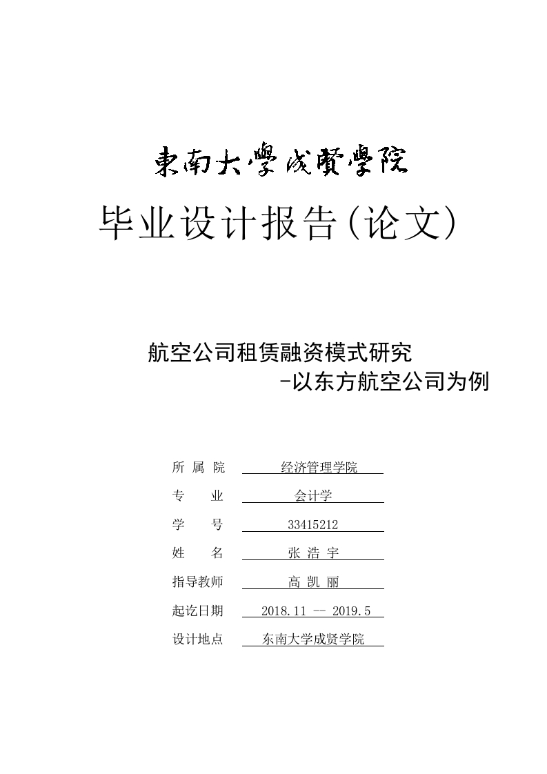 毕业设计报告(论文)航空公司租赁融资模式研究-以东方航空公司为例所属院经济管理学院专业会计学学号33415212姓名张浩宇指导教师高凯丽起讫日期2018.11-2019.5设计地点东南大学成贤学院东南大学成贤学院毕业论文航空公司租赁融资模式研究-以东方航空公司为例摘要国民经济的快速发展和民航体制改制的推进以及新的行业管理体制和运行机制的逐步完善,给我国民航业注入了新的生机与活力,得到了迅速发展。随之而来的是我国民航业的飞机需求是迅猛攀升,据国内外航空界权威预测,未来20年中,中国对各种民用飞机需求量将超过3000架,总额达数千亿美元之巨。而国内的航空公司一直面临资金短缺的局面,如何有效选择融资模式,降低筹资成本,来扩大航空公司的机队,始终是航空公司需要解决的问题。飞机租赁起源于本世纪初的欧洲,而现代意义上的飞机租赁始于60年代的美国。我国在80年代初开始引入飞机租赁的概念和做法,在随后的30年里的得到了迅速发展。本文首先从租赁的基础理论入手,通过对租赁的基本概念的介绍,导入了飞机租赁的概念:通过对比分析,阐述了租赁飞机相对于购买飞机所具有的优势:并对常见的两种飞机租赁方式的优劣和特点进行比较分析。随后,叙述了我国飞机租赁市场的现状,论述了飞机租赁在我国民航发展中的广阔前景和发展飞机租赁的重大意义,并分析飞机租赁模式的分类以及航空公司租赁融资模式选择决策方法。随后以东方航空公司经营租赁和融资租赁的实际案例分析,说明了我国民航业飞机租赁的模式、程序与方法。本文还研究了当前飞机租赁业务中存在的主要问题和风险:加重了国内航空公司的外债负担:缺乏配套政策支持:有关飞机租赁的法律法规不完善:飞机租赁中还存在融资风险、外汇风险和信用风险。最后本文根据西方发达国家的经验,结合我国飞机租赁市场的具体情况,对完善和发展飞机租赁市场提出了合理的政策建议,通过降低飞机租赁成本、制定配套政策措施、健全法规体系以及防范和化解风险等多方面工作,推动我国飞机租赁业的健康、快速发展。关键词:租赁:飞机租赁:租赁融资模式东南大学成贤学院毕业论文Study on Leasing Financing Model of Airline Companies-Taking China Eastern Airlines as an ExampleAbstractThe rapid development of the national economy and the reform of the civil aviation system and the gradualimprovement of the new industry management system and operation mechanism have injected new vitality andvitality into the civil aviation industry in China and achieved rapid development.Along with this,the demand foraircraft in China's civil aviation industry is soaring.According to domestic and foreign aviation authorities,China's demand for various civilian aircraft will exceed 3,000 in the next 20 years,totaling hundreds of billions ofU.S.dollars.Domestic airlines have always faced a shortage of funds.How to effectively choose a financingmodel,reduce the funding cost,and expand the airline's fleet has always been a problem that airlines need to solve.Aircraft leasing originated in Europe at the beginning of this century,and aircraft leasing in the modern sensebegan in the United States in the 1960s.The concept and practice of aircraft leasing was introduced in China inthe early 1980s and developed rapidly in the following 30 years.This paper begins with the basic theory of leasing and introduces the concept of aircraft leasing through theintroduction of the basic concept of leasing.Through comparative analysis,the advantages of leasing aircraftcompared to purchasing aircraft are expounded.The advantages and disadvantages of the two common aircraftleasing methods are compared and analyzed.Then,the paper describes the present situation of aircraft leasingmarket in China,discusses the broad prospect of aircraft leasing in the development of civil aviation and thesignificance of aircraft leasing,and analyzes the classification of aircraft leasing mode and the decision-makingmethod of airline leasing financing mode.Then,with the actual case analysis of Eastem Airlines operating leasingand financial leasing,the model,procedure and method of China's civil aviation aircraft leasing are explained.This paper also studies the main problems and risks in the current aircraft leasing business:it increases theforeign debt burden of domestic airlines;Lack of supporting policy support;The relevant laws and regulations onaircraft leasing are not perfect;There are also foreign exchange risk,financing risk and credit risk in aircraftleasing.Finally,based on the experience of developed countries in the West and the specific situation of China'saircraft leasing market,this paper puts forward some reasonable policy suggestions for improving and developingthe aircraft leasing market.By reducing the cost of aircraft leasing,formulating supporting policies and measures,improving the regulatory system,and preventing and defusing risks,we can promote the healthy and rapiddevelopment of the aircraft leasing industry in China.Keywords:Lease;Aircraft rental;Lease financing model
